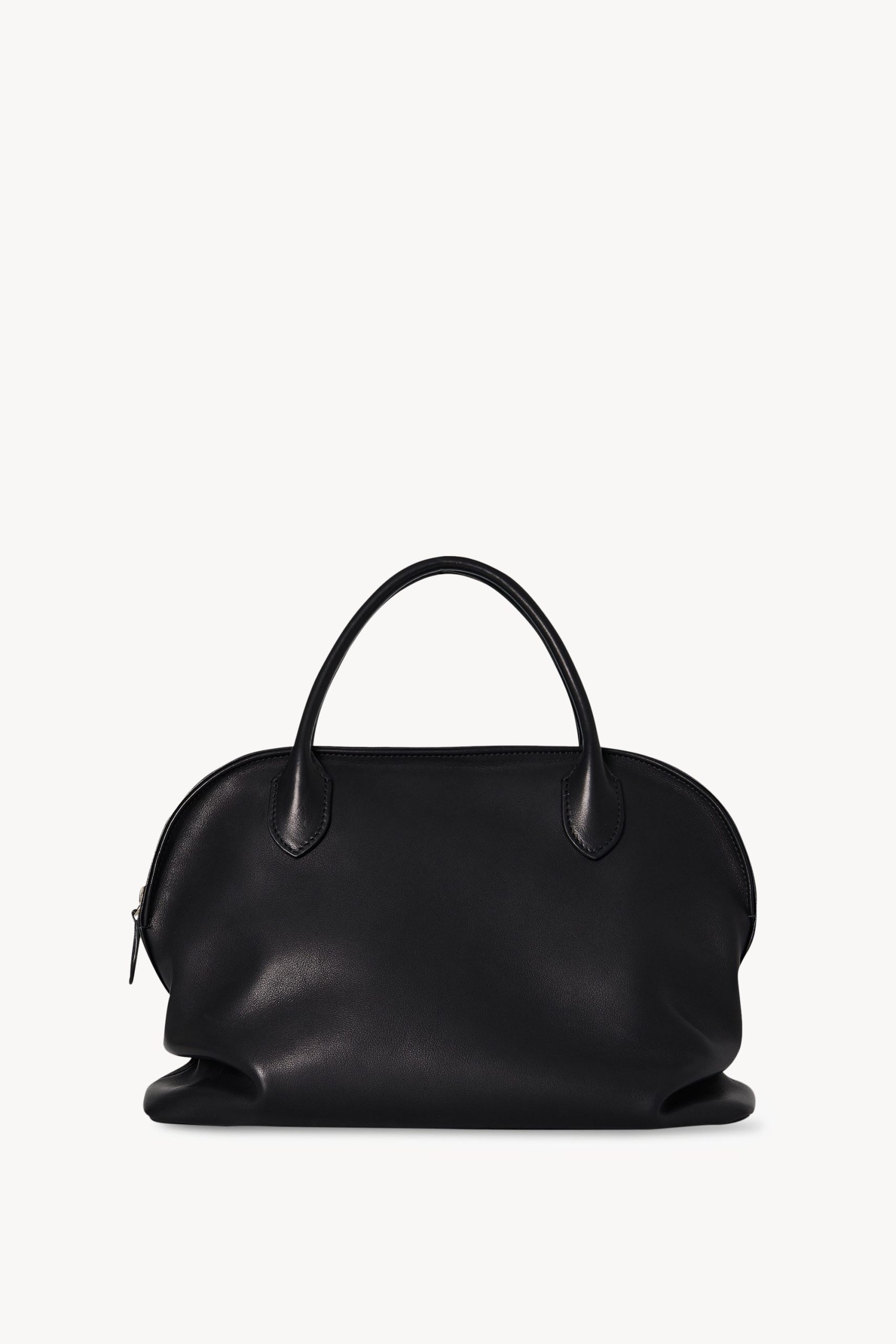 Slouchy bowling bag in polished saddle leather with hand-stitched tubular handles. turned-edge construction. and zipper closure with raw edged collar.