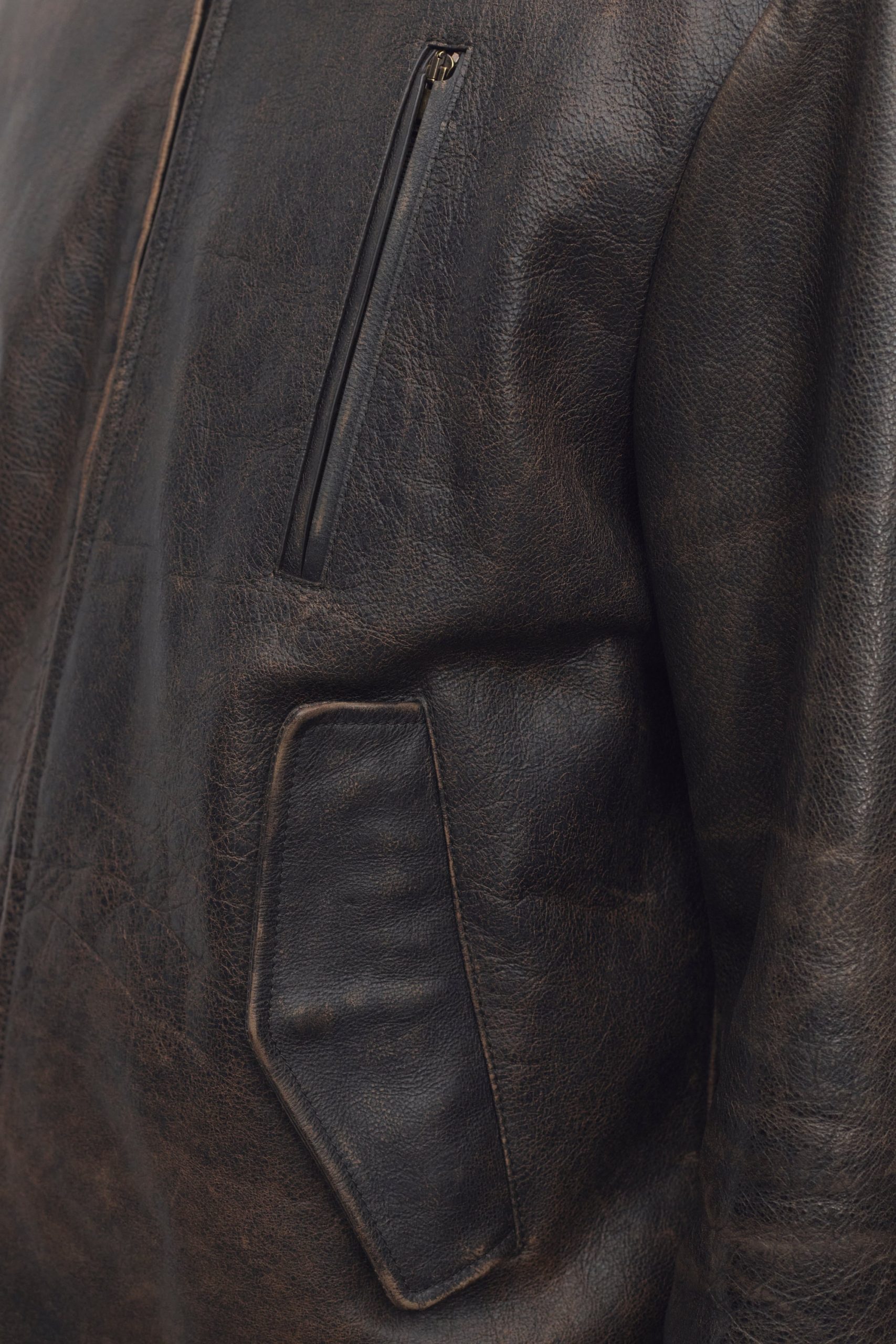 Collared motorcycle jacket in durable calfskin leather with ribbed hem. front flap pockets. and extended front zipper closure.