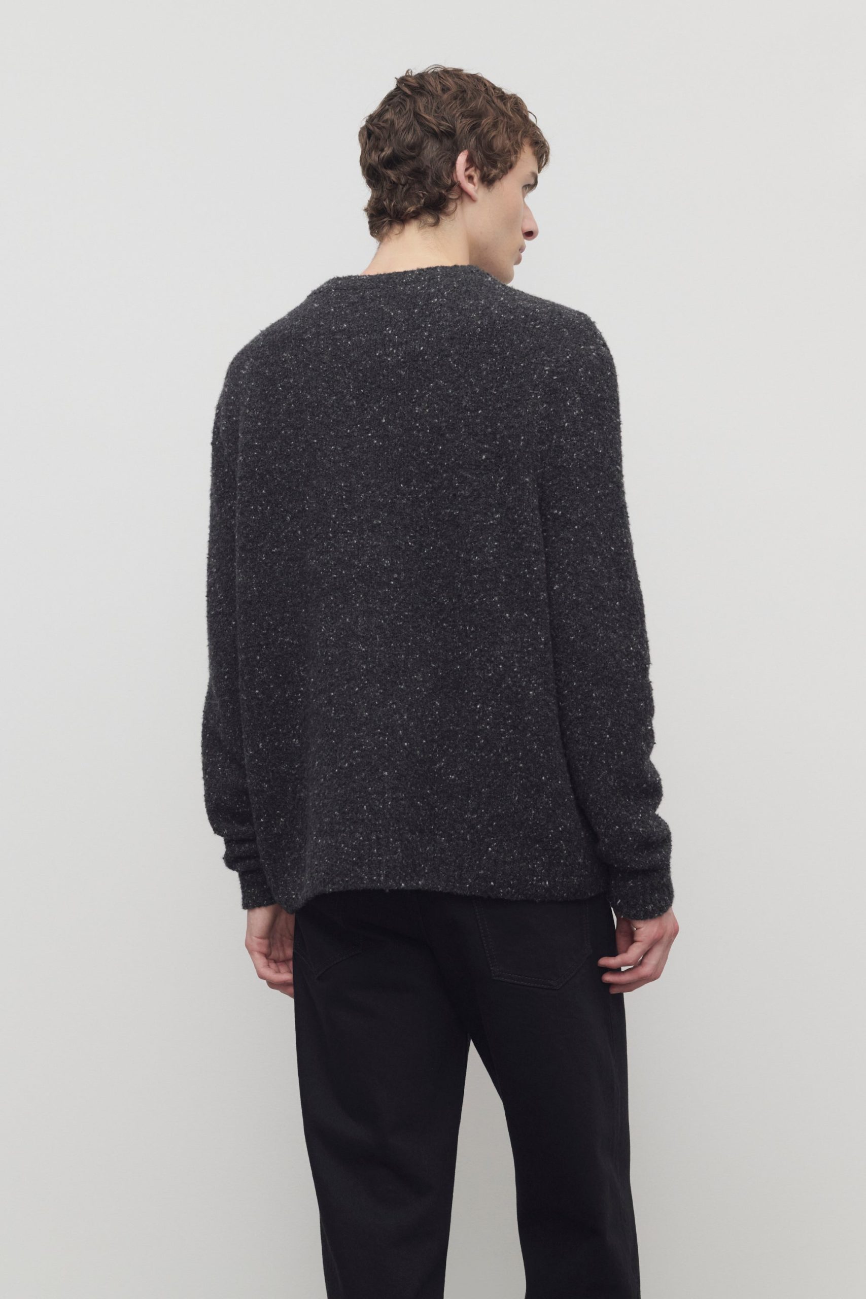 Classic crewneck sweater in flecked midweight cashmere with relaxed fit and ribbed neckline. cuffs. and hem.