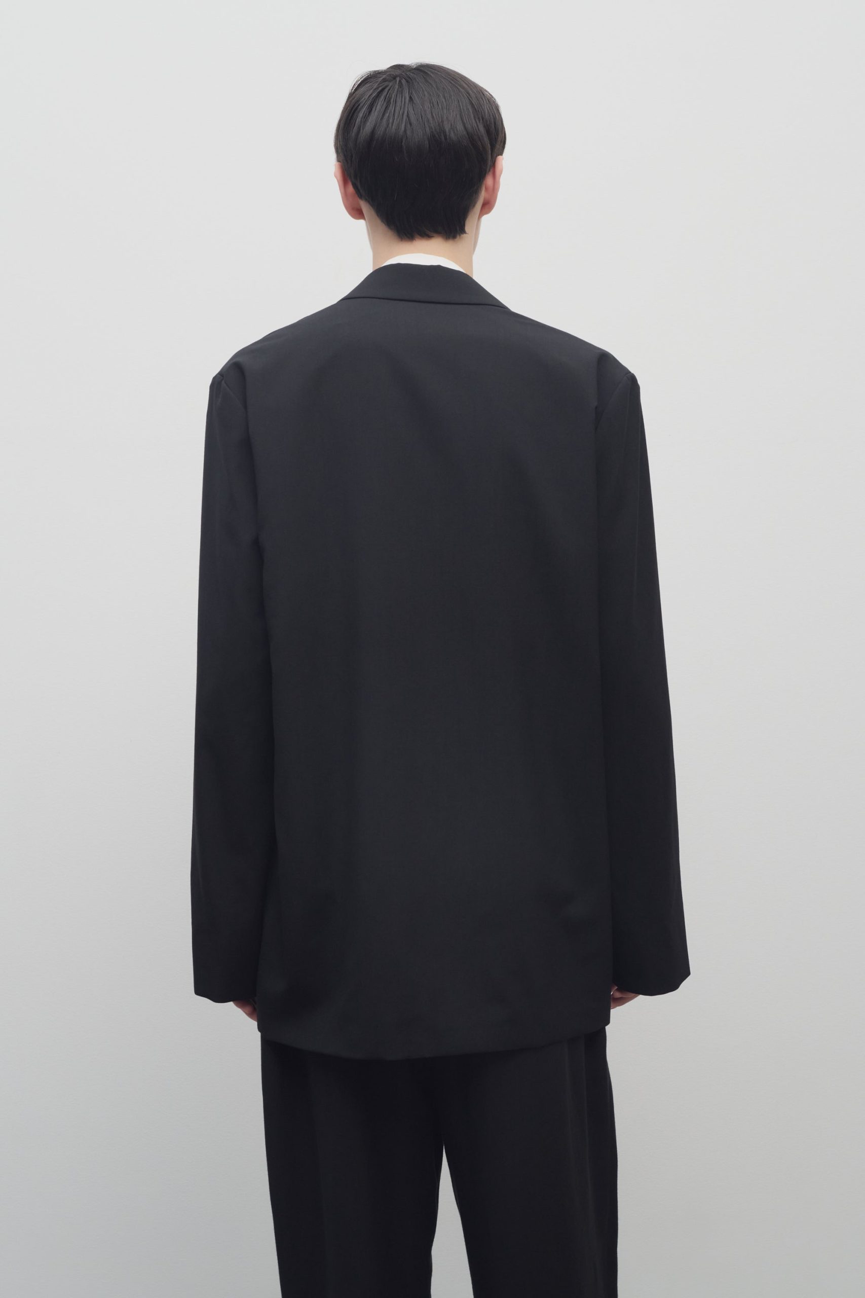 Single-breasted tailored jacket in crisp tropical wool with notch lapels. front besom pockets. and horn button closure.