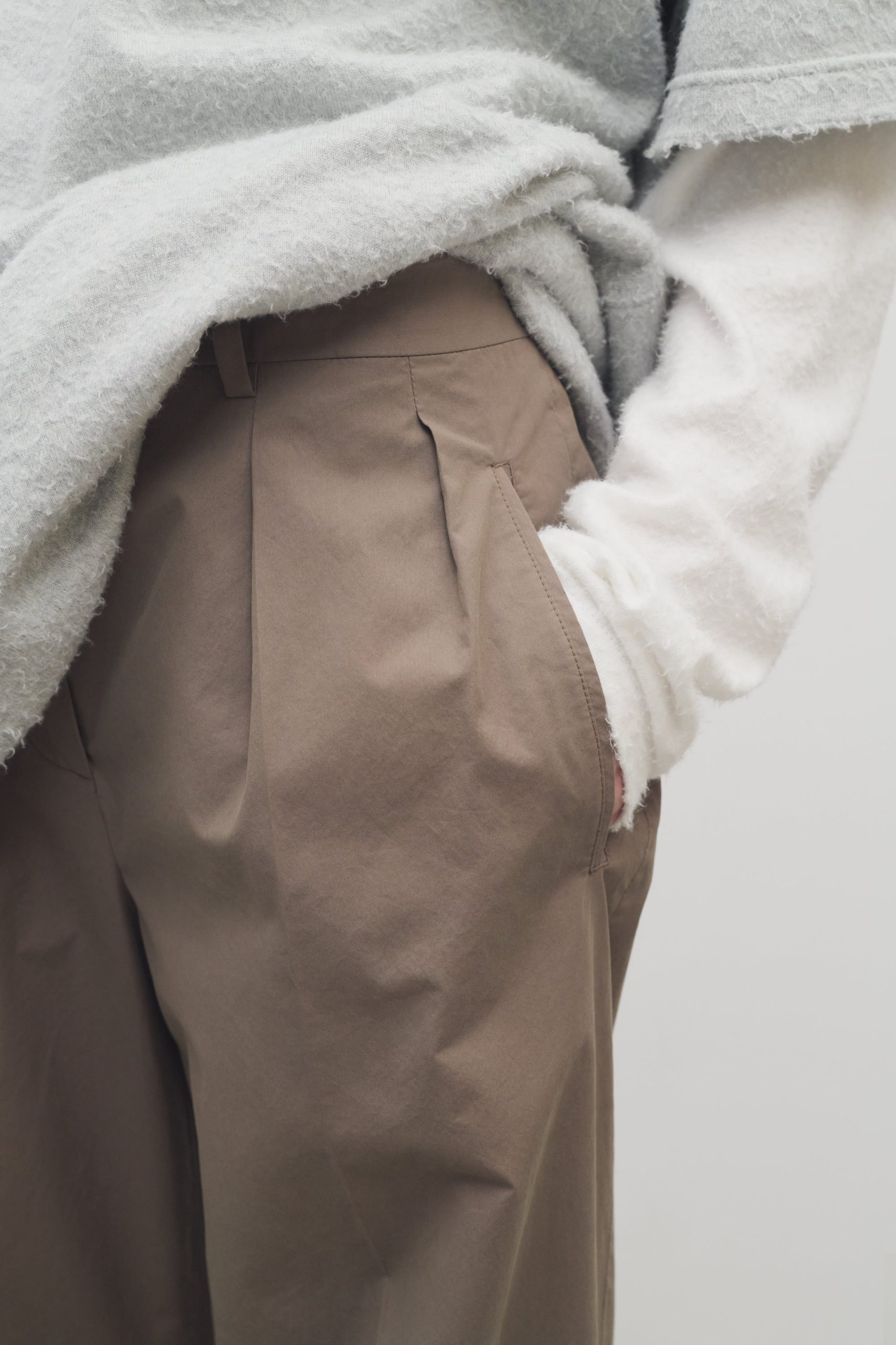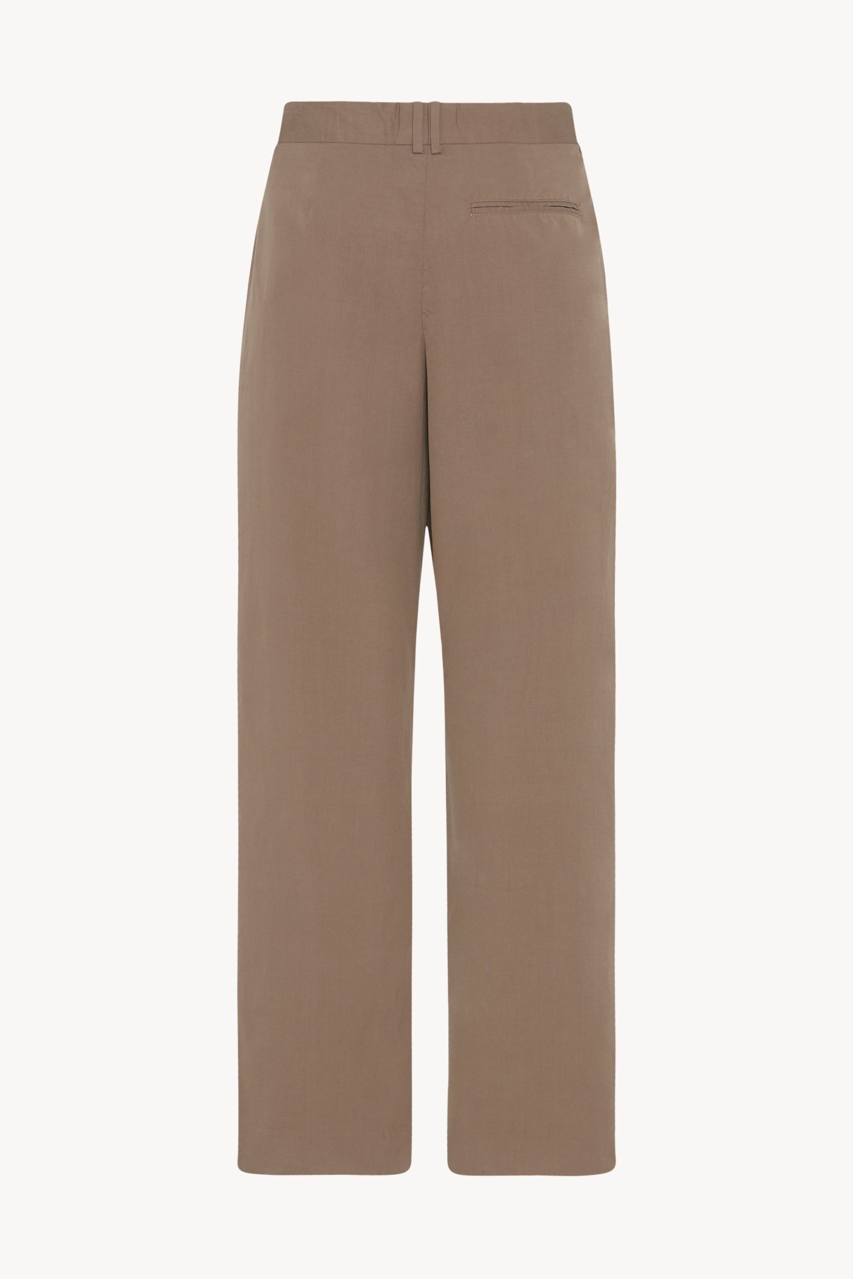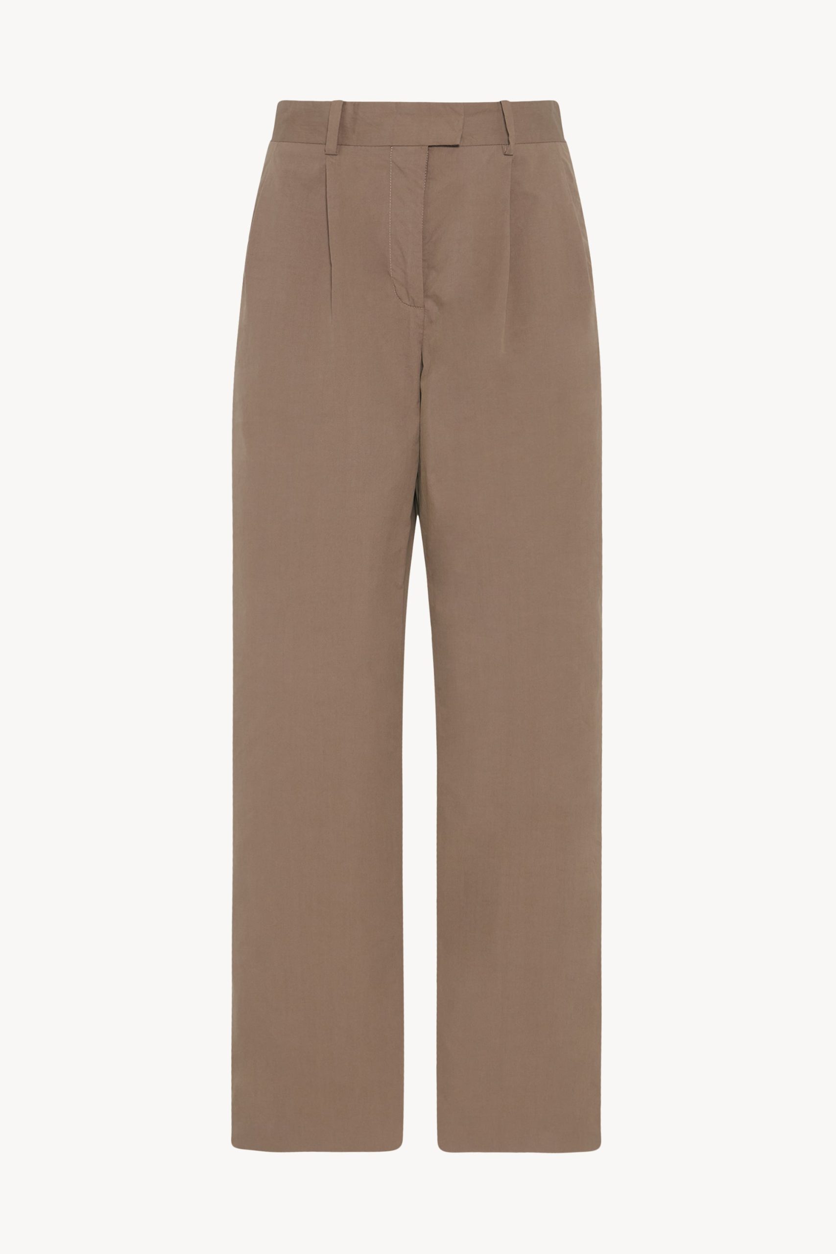 Low-rise tailored trouser in smooth Pima cotton with straight leg. front double pleats. and side welt pockets.