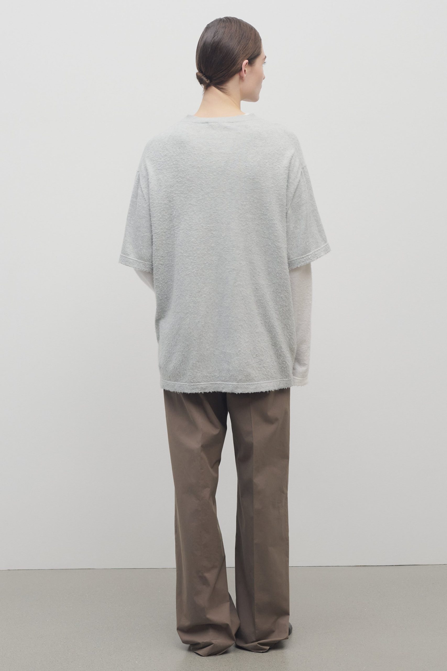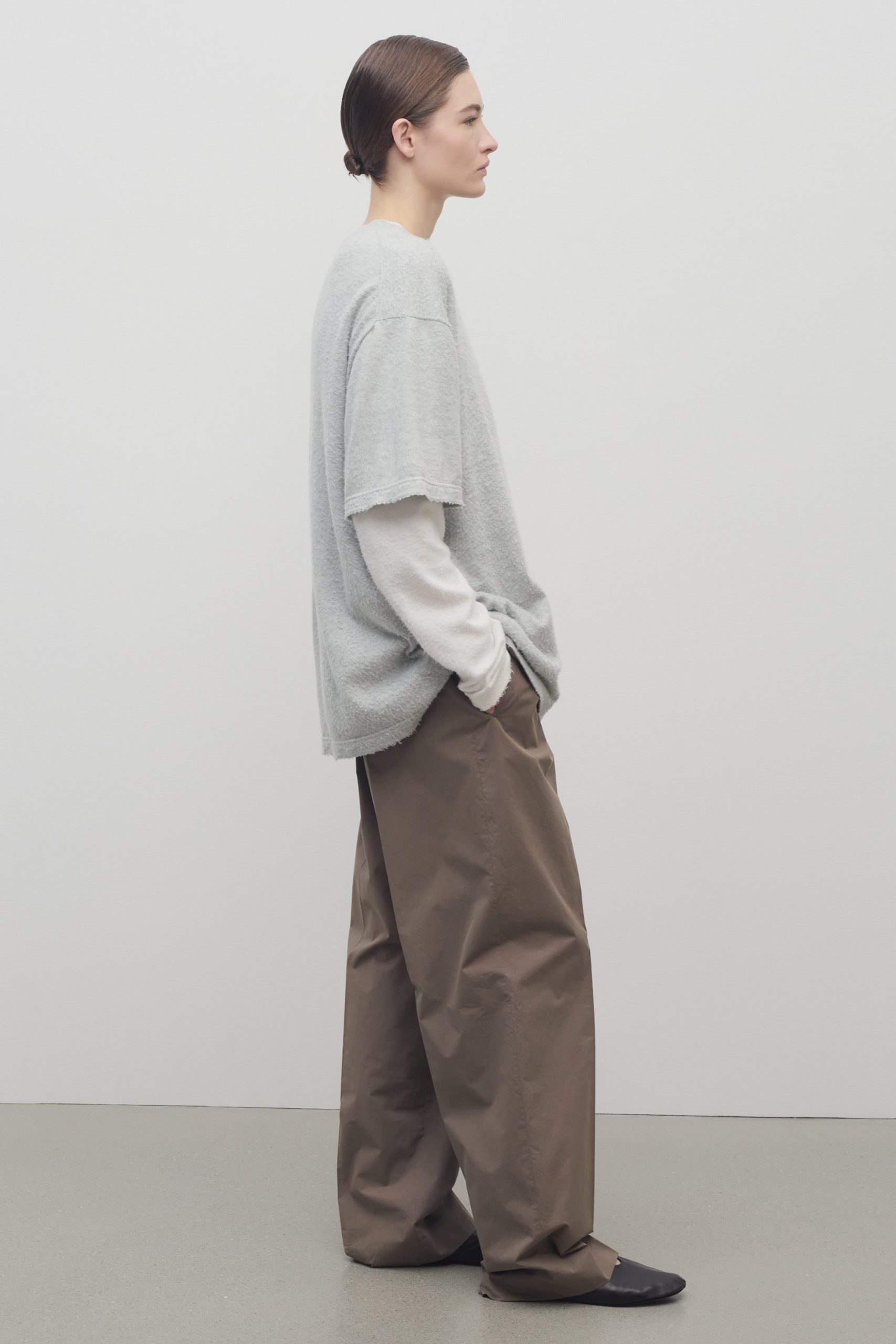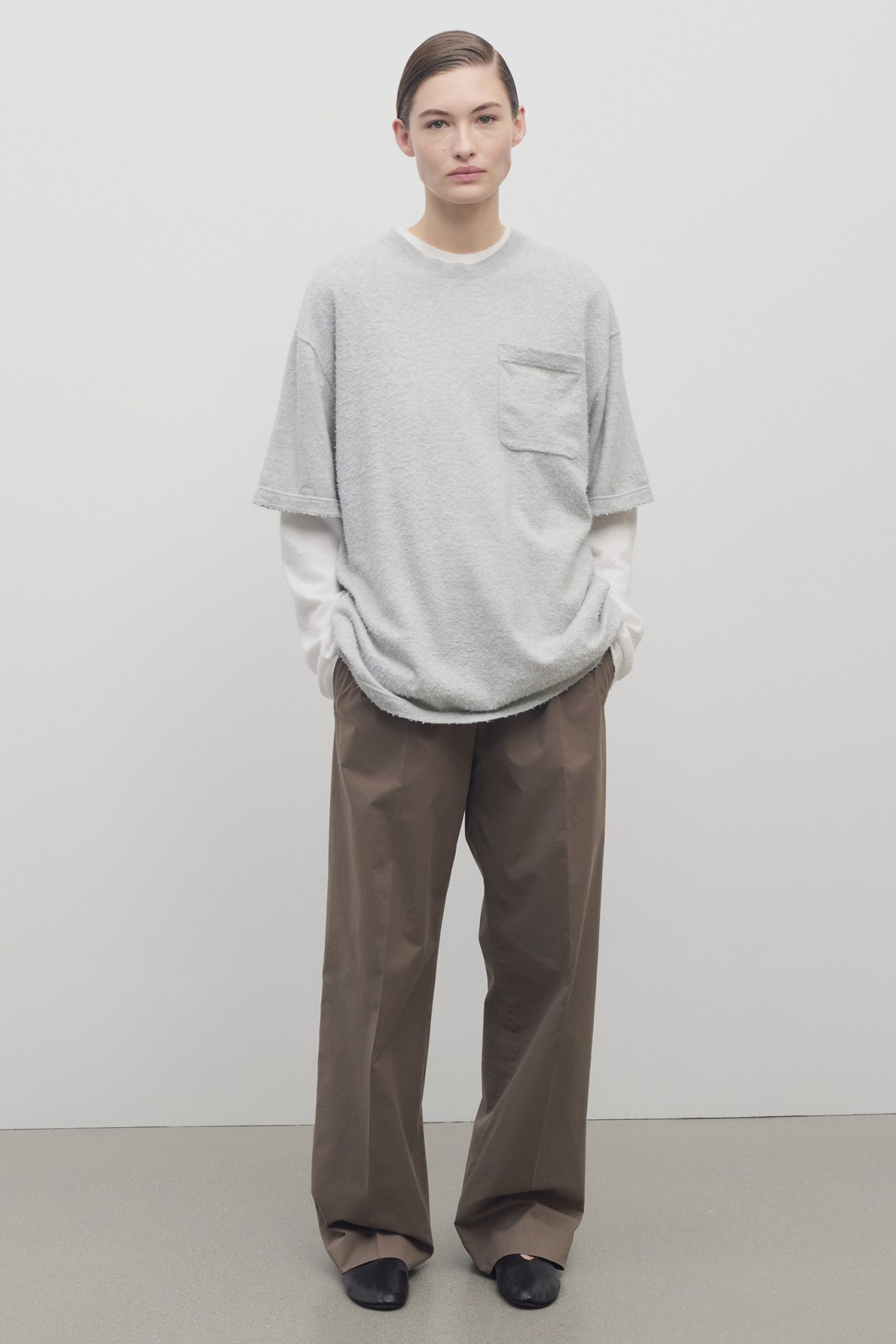 Low-rise tailored trouser in smooth Pima cotton with straight leg. front double pleats. and side welt pockets.