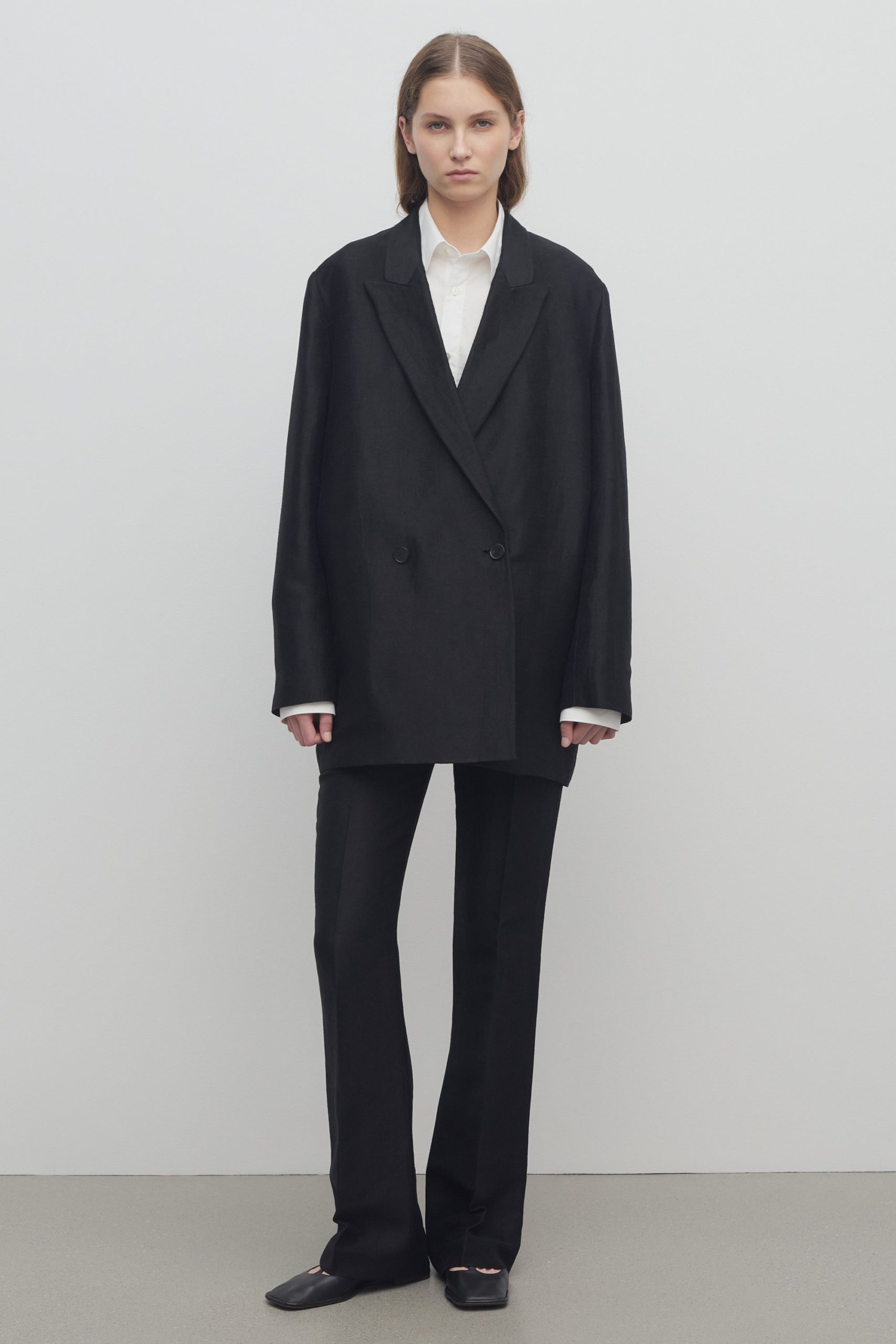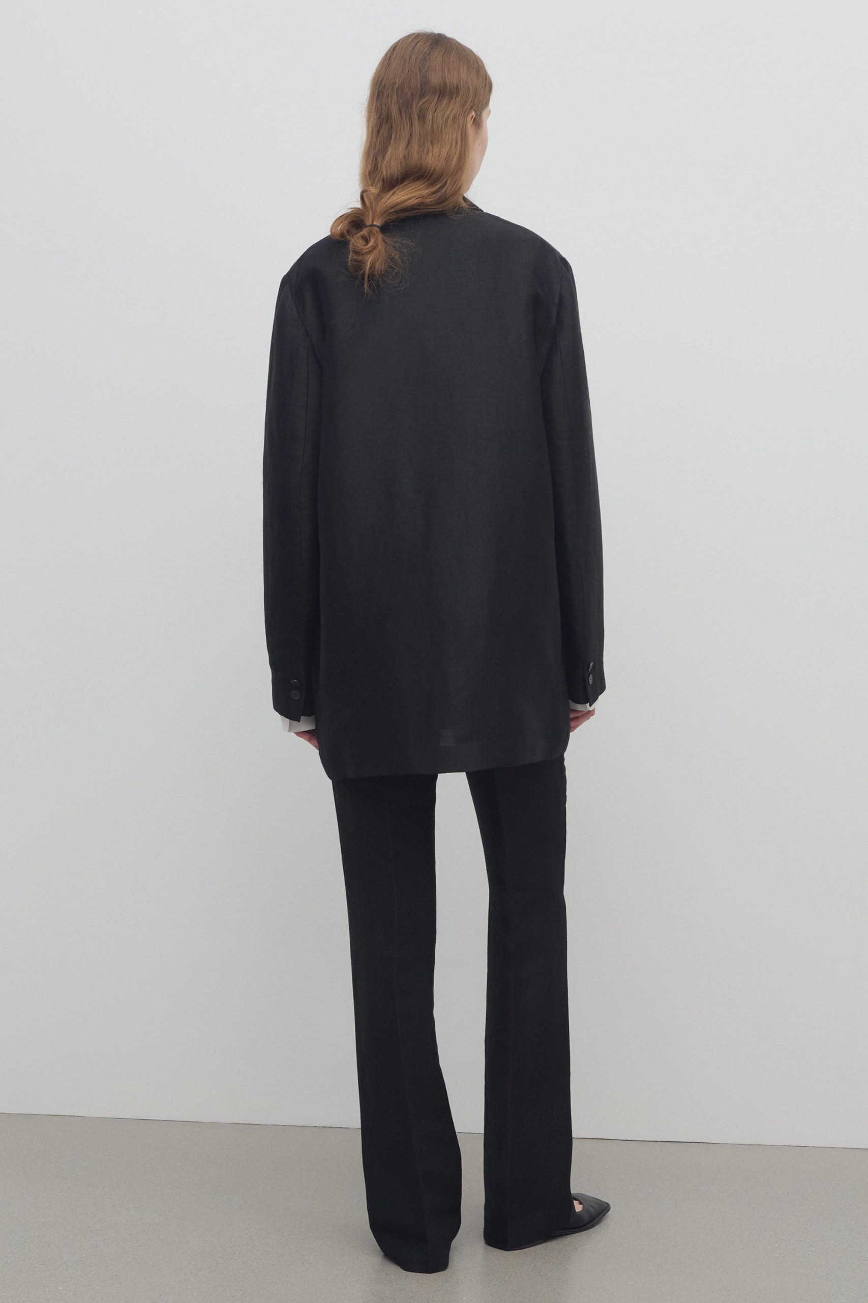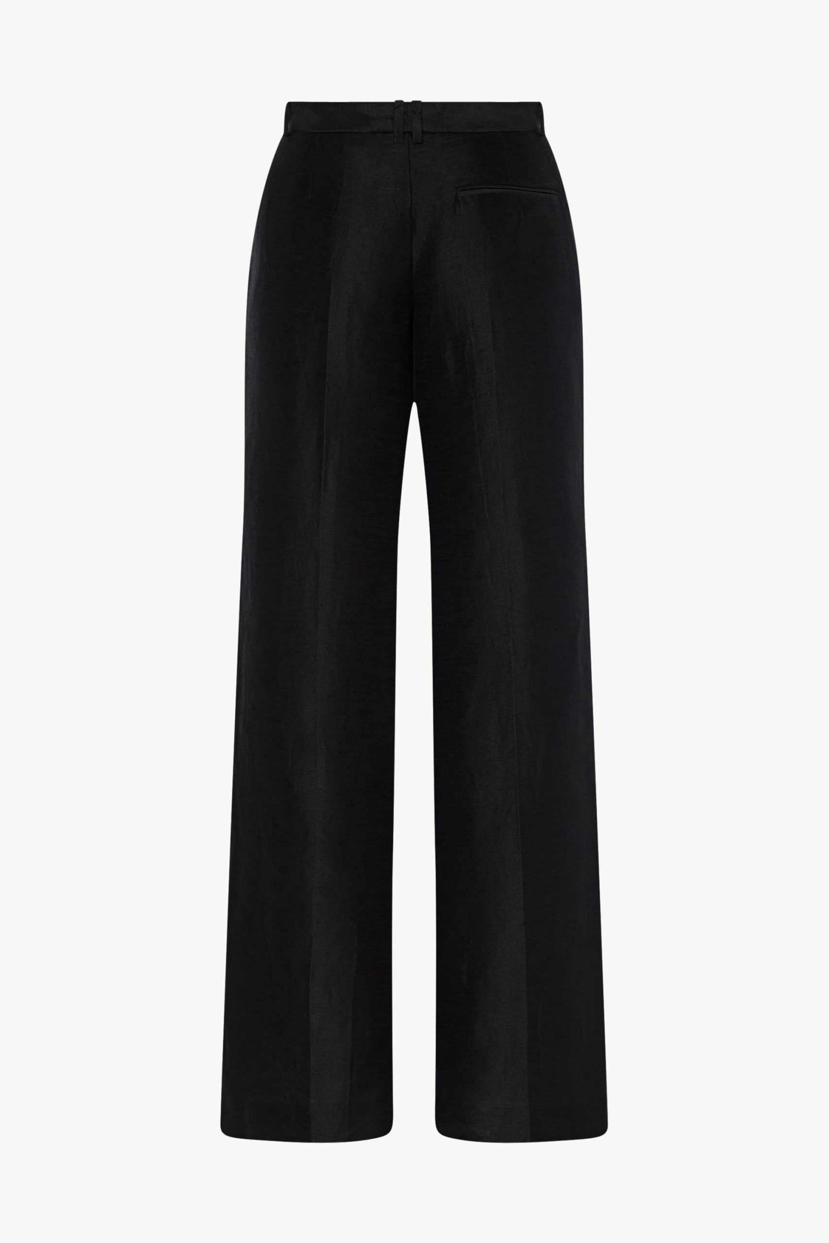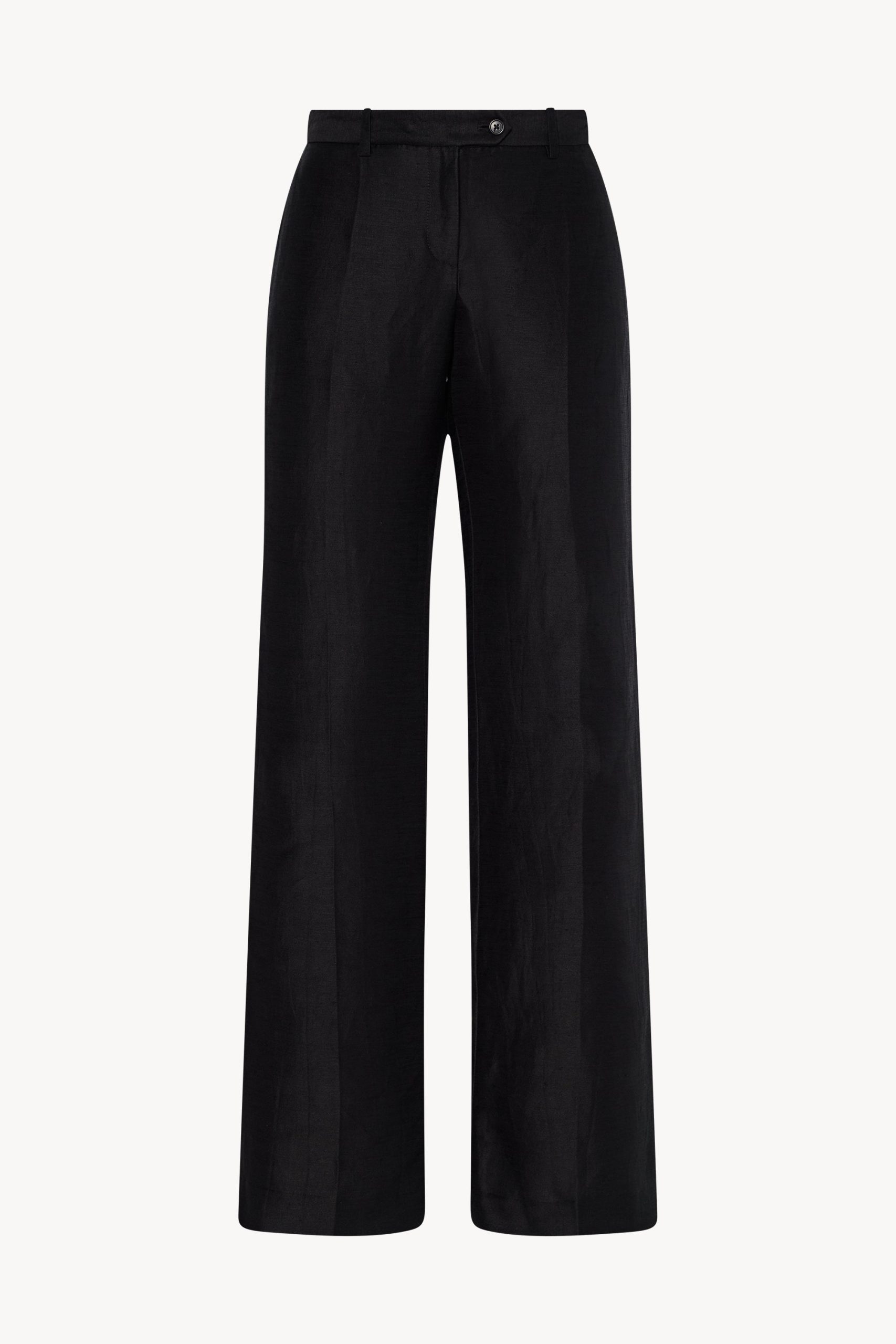 Mid-rise tailored trouser in textured linen with straight leg. pressed front and back creases. and slanted side pockets.