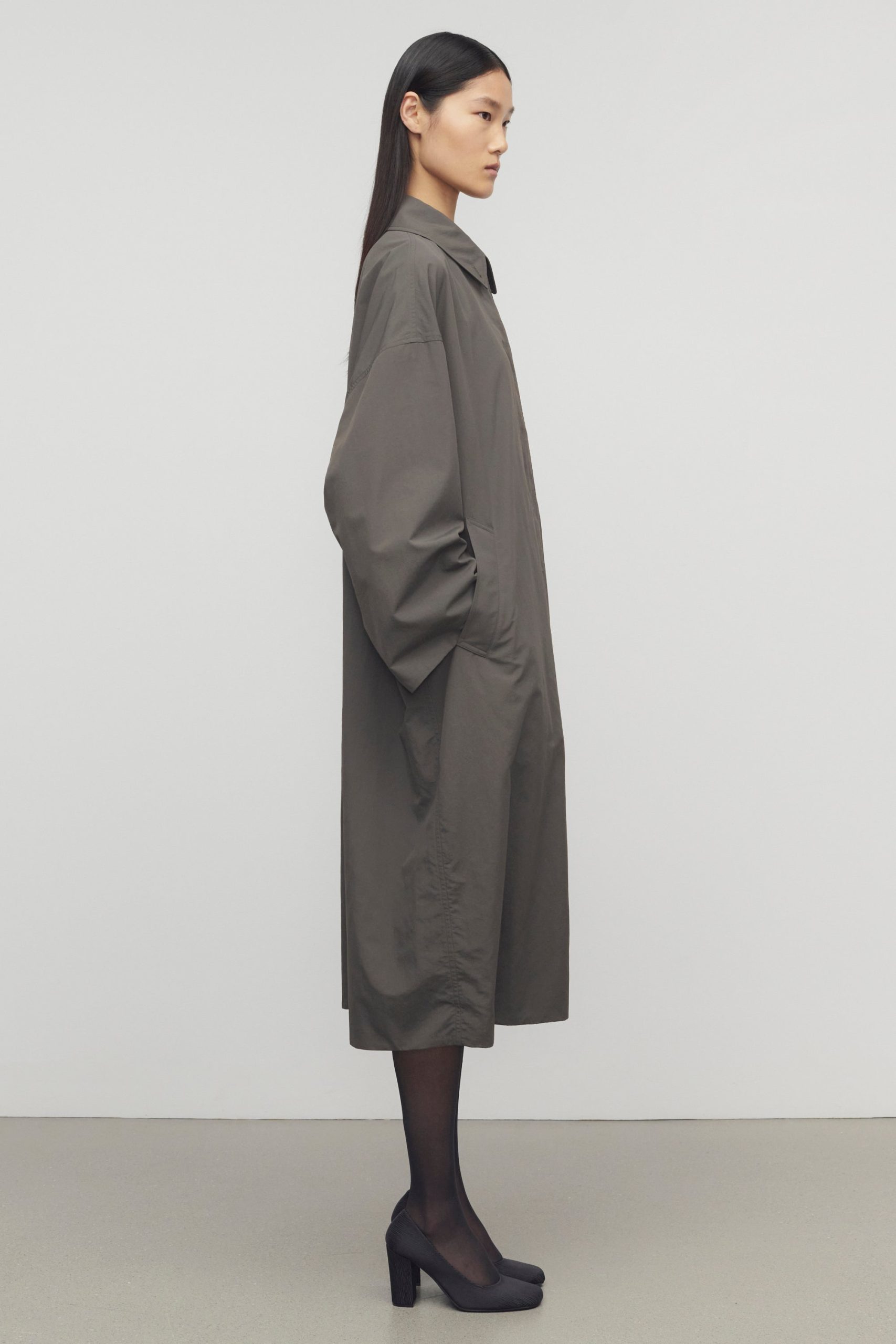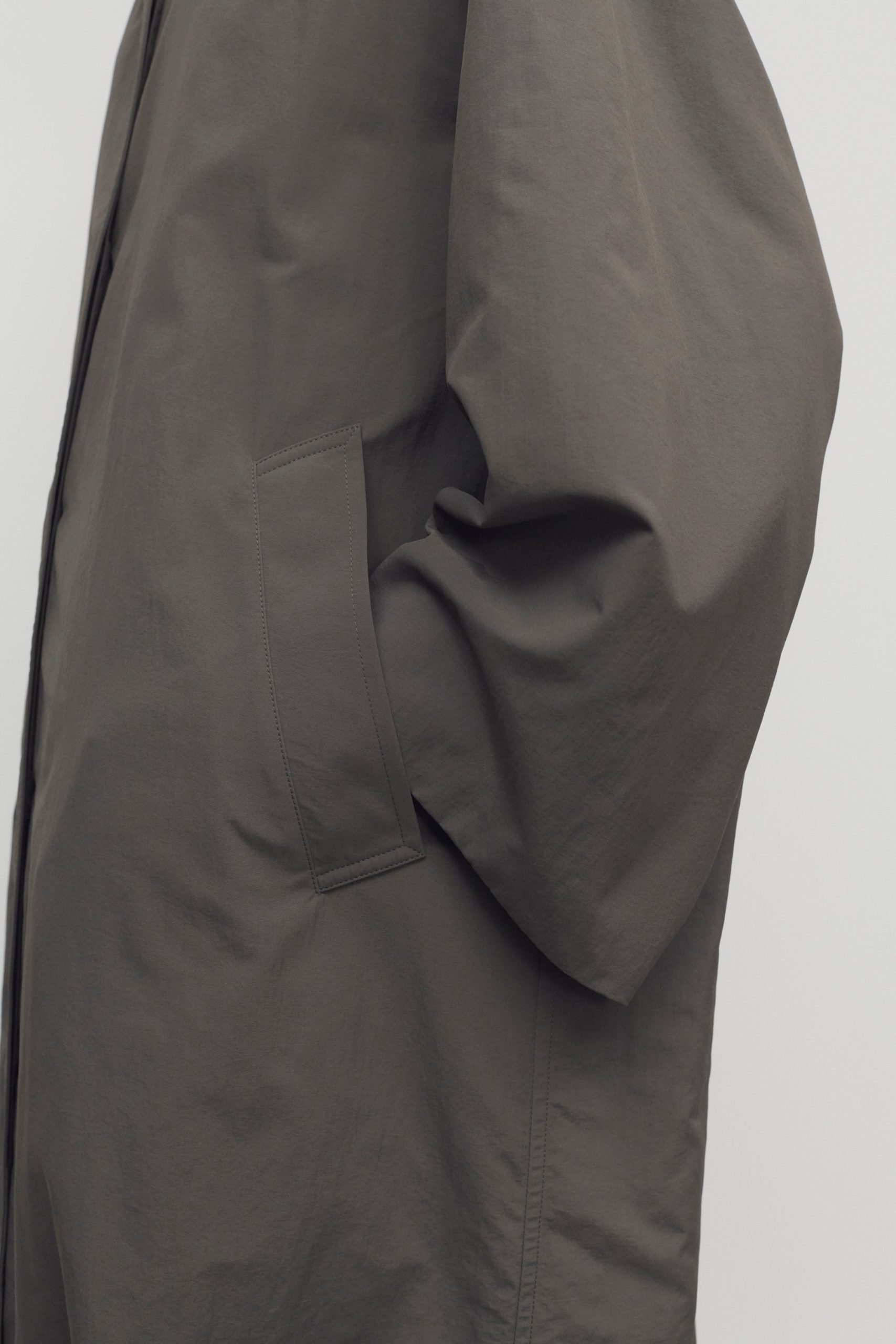 Ankle-length trench coat in washed lightweight nylon with oversized fit. slant welt pockets. and concealed front placket with horn button closure.