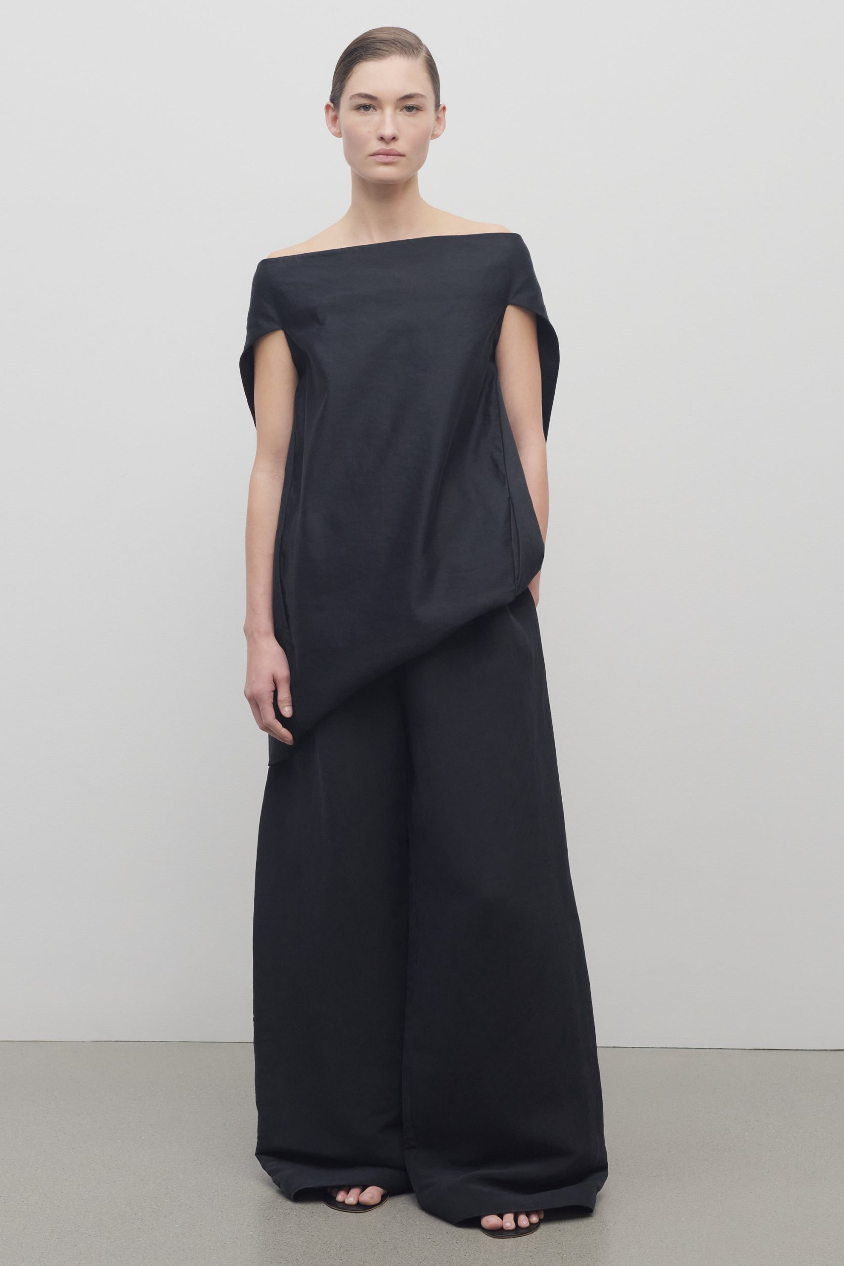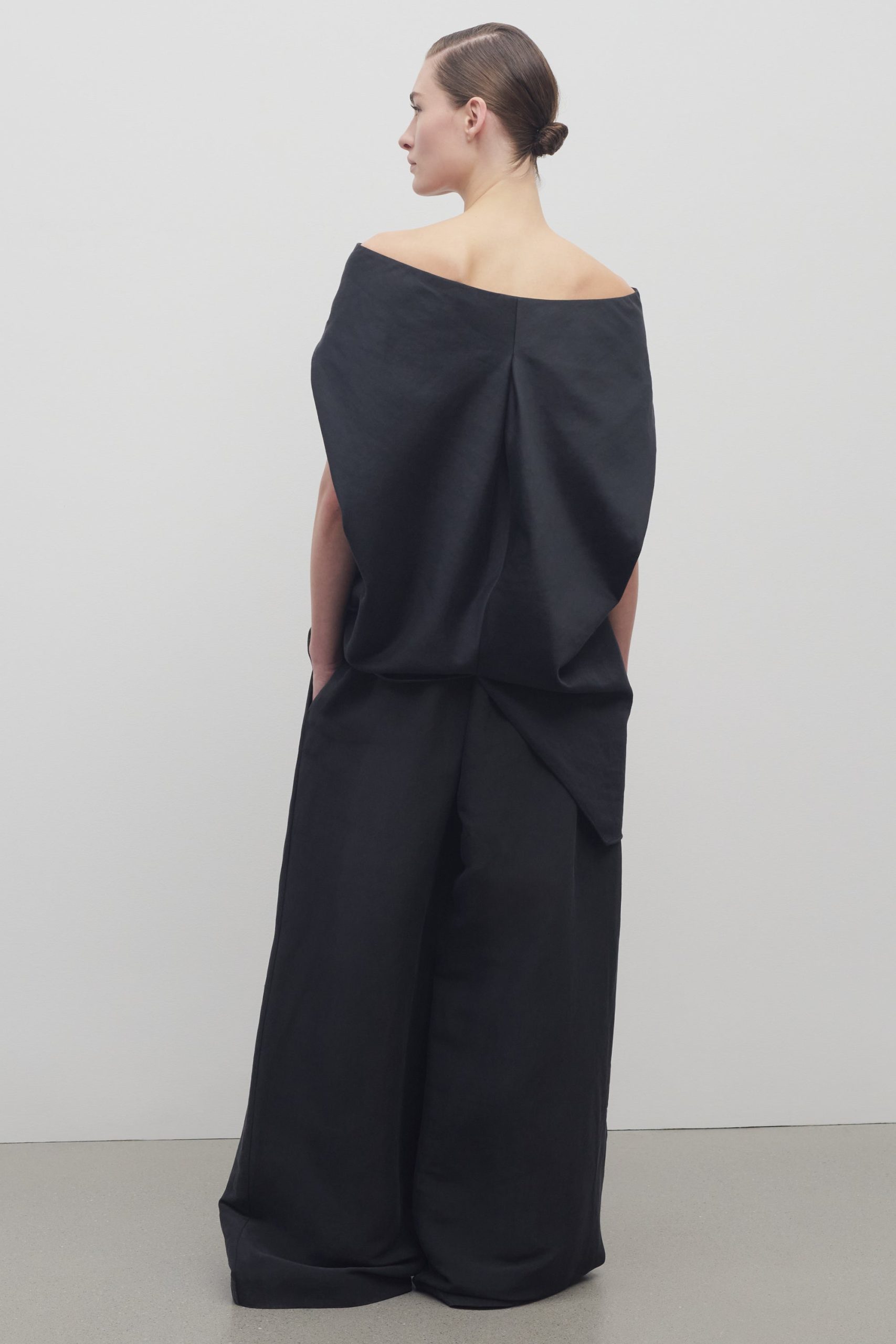Mid-rise pull-on pant in natural silk shantung with wide leg. gathered elastic waistband. and side seam pockets.