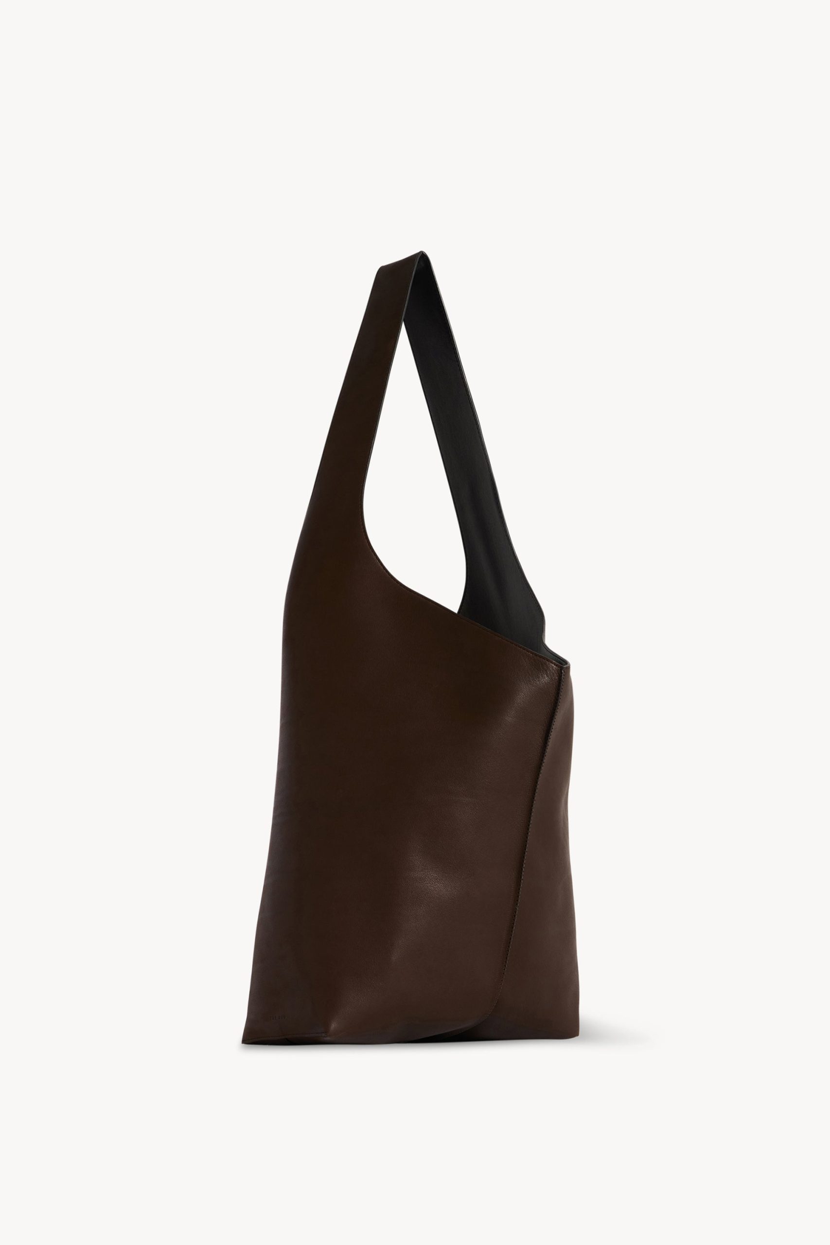Unstructured handbag in polished saddle leather with draped handle. center seam detail. and detachable zipper pouch.