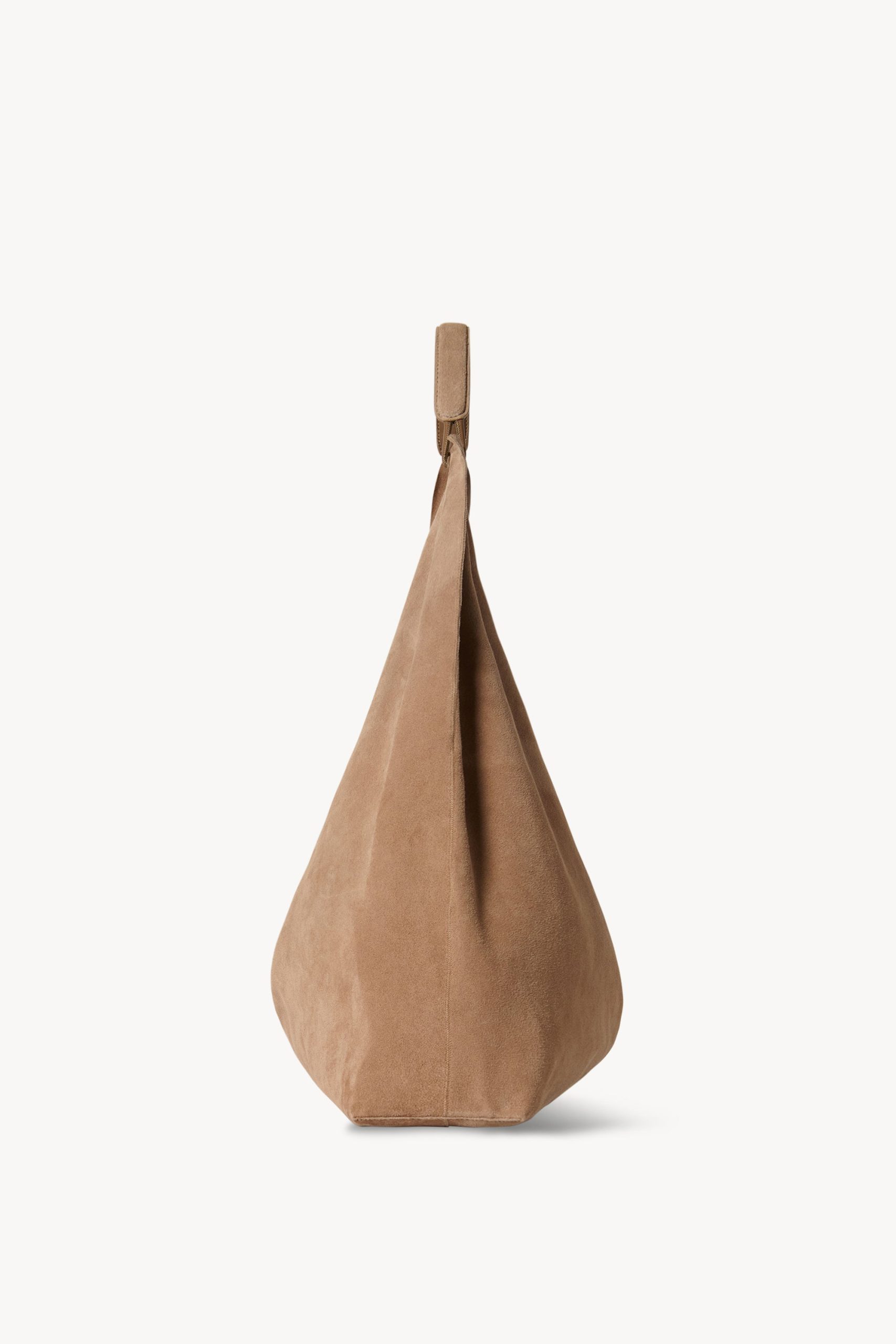 Unstructured bag in soft suede with center stitch detail and draped handle.