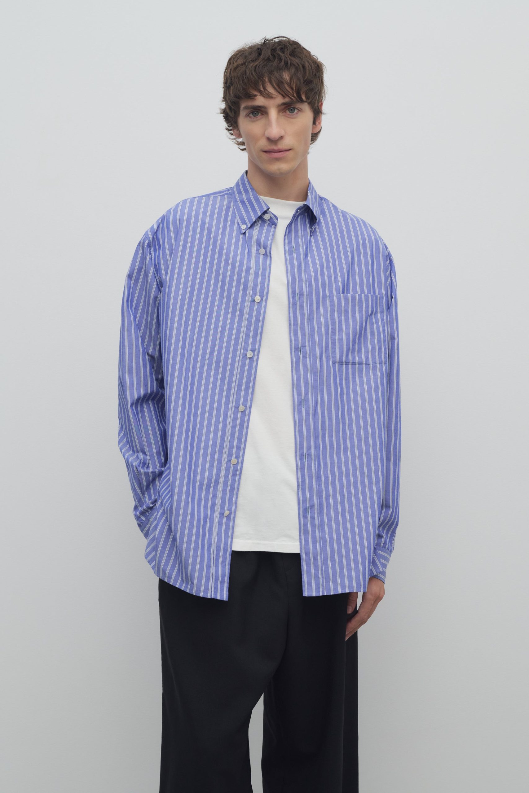 Classic button-up shirt in washed organic cotton poplin with regular fit. front patch pocket. and exposed front placket with mother-of-pearl buttons.