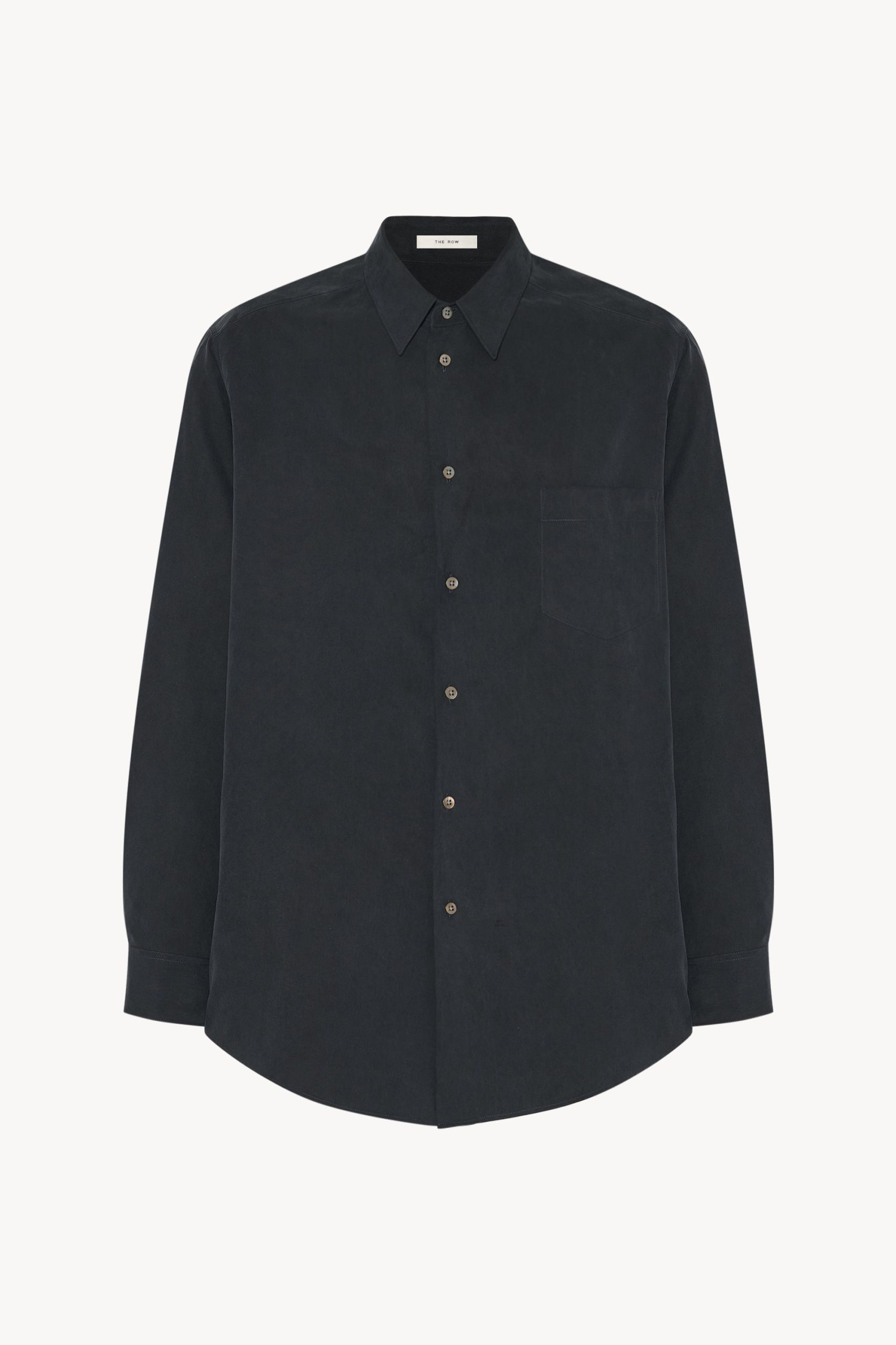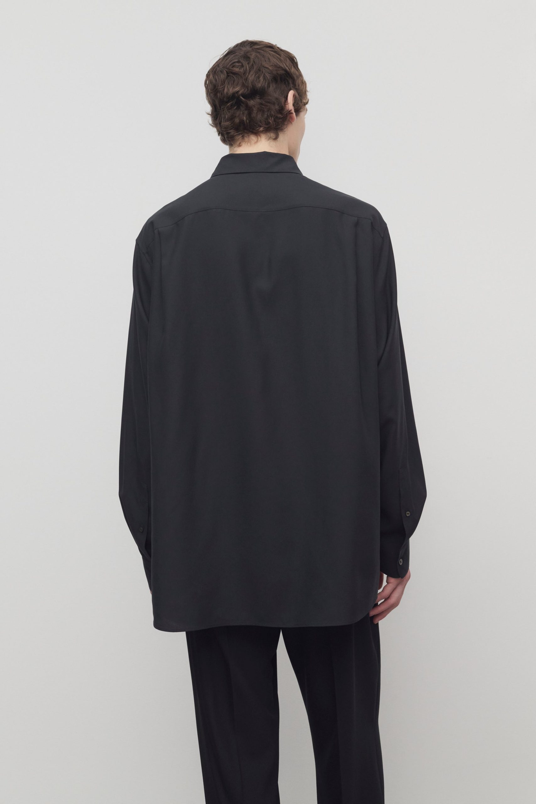 Classic button-up shirt in enzyme-washed silk with relaxed fit. front patch pocket. and exposed front placket with button closure.