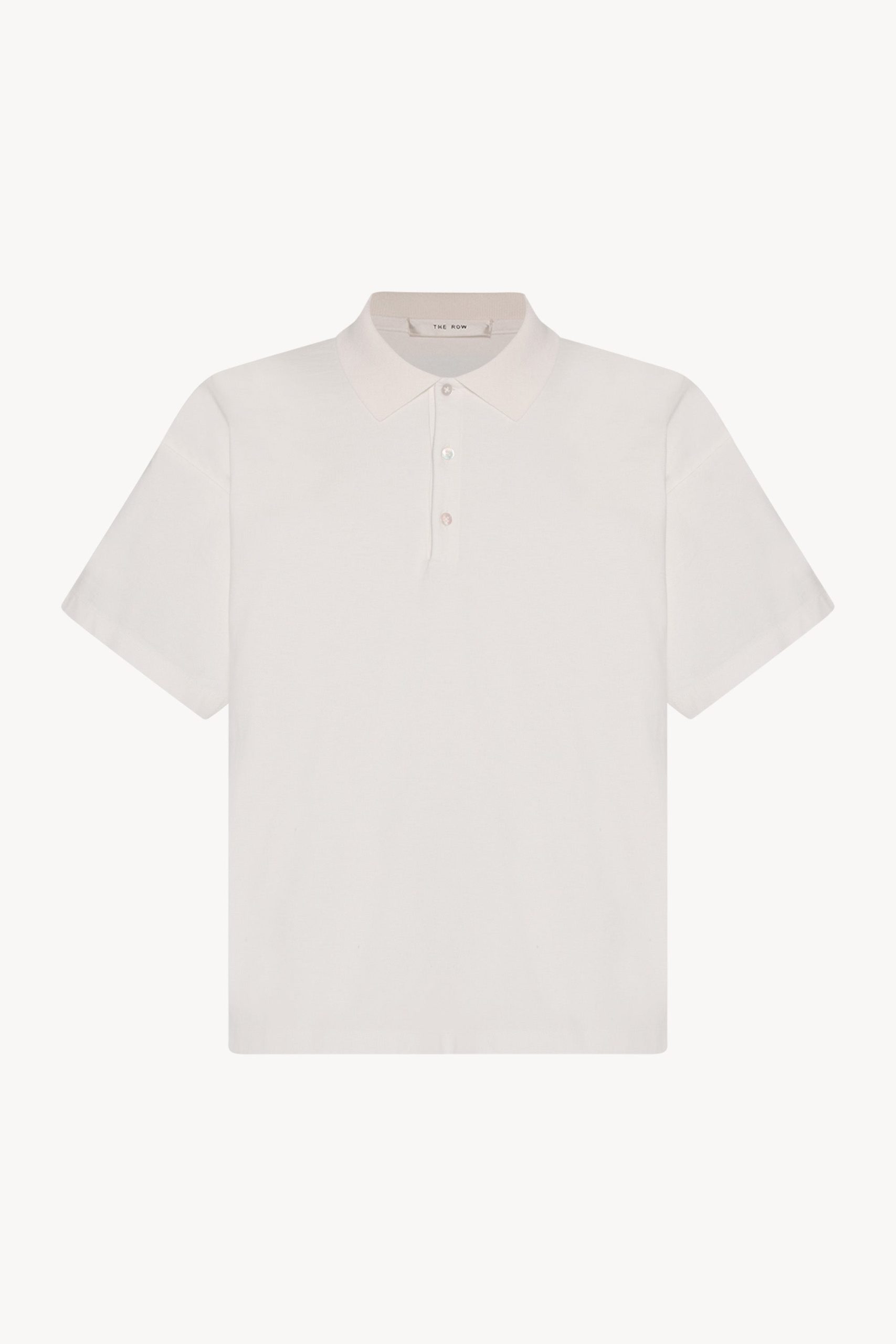 Short-sleeved polo top in midweight cotton jersey with boxy fit. ribbed collar. and exposed front button placket.