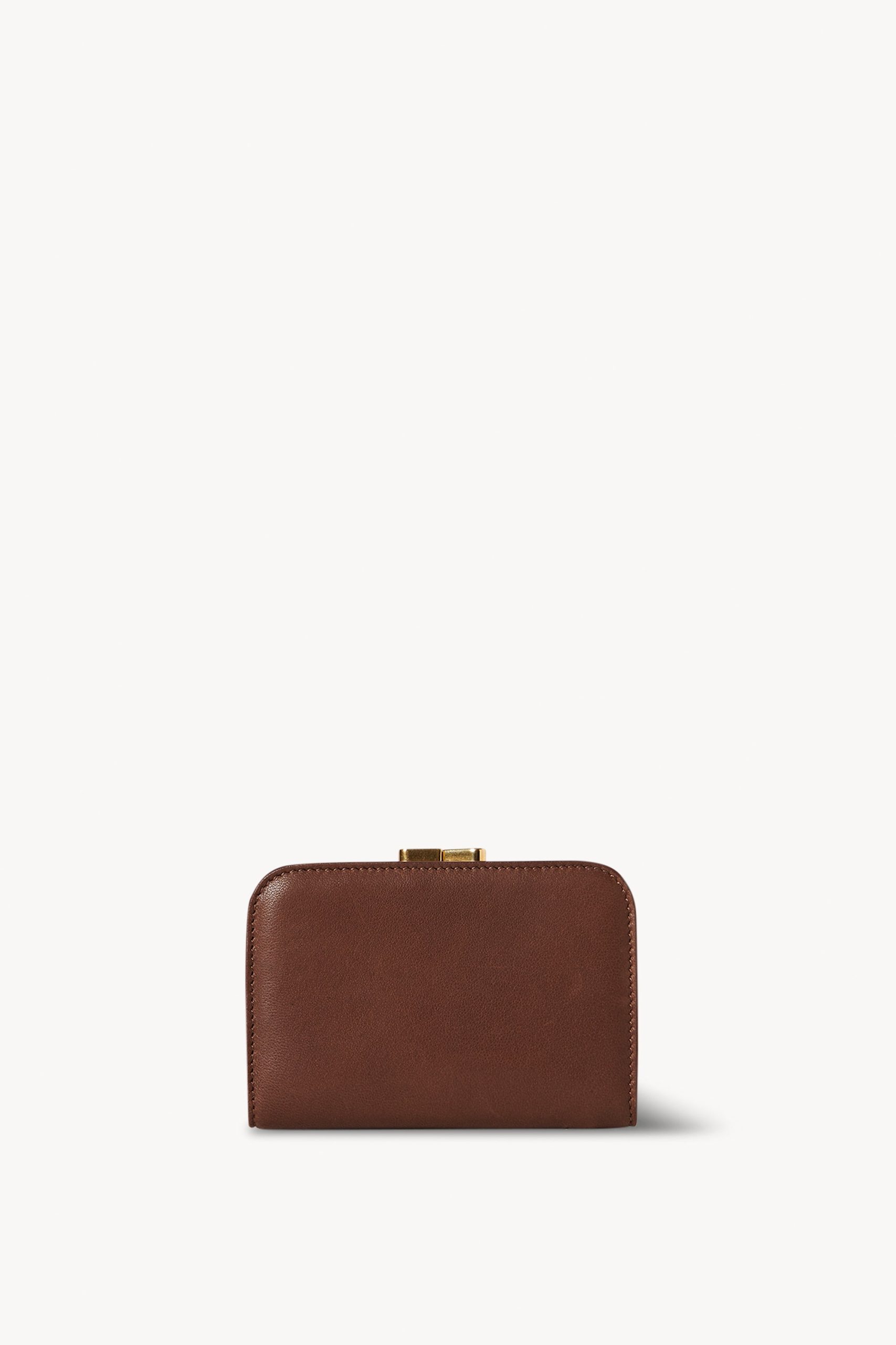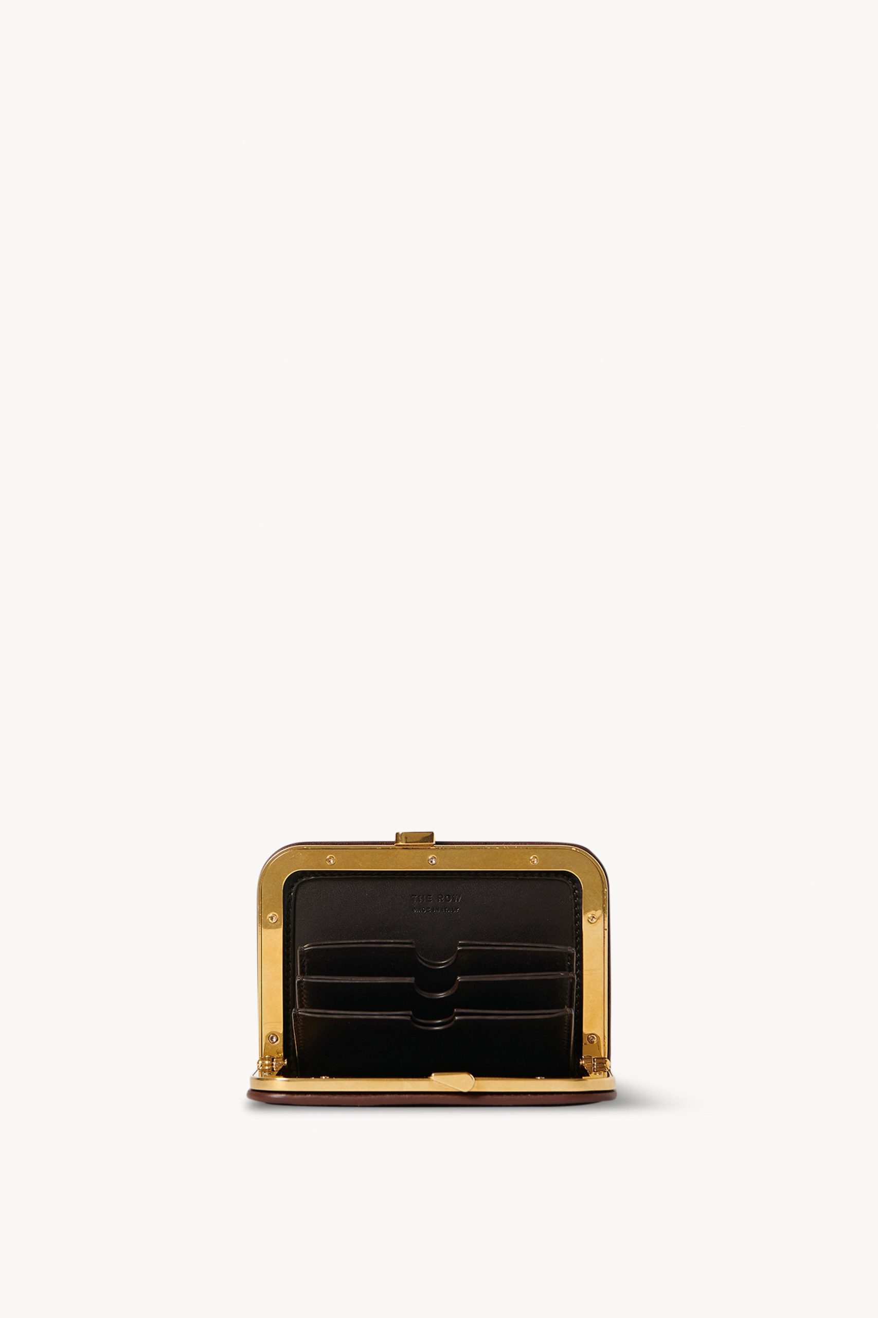 Compact minaudiere clutch in matte nappa leather with interior card slots and metal frame with clasp closure.