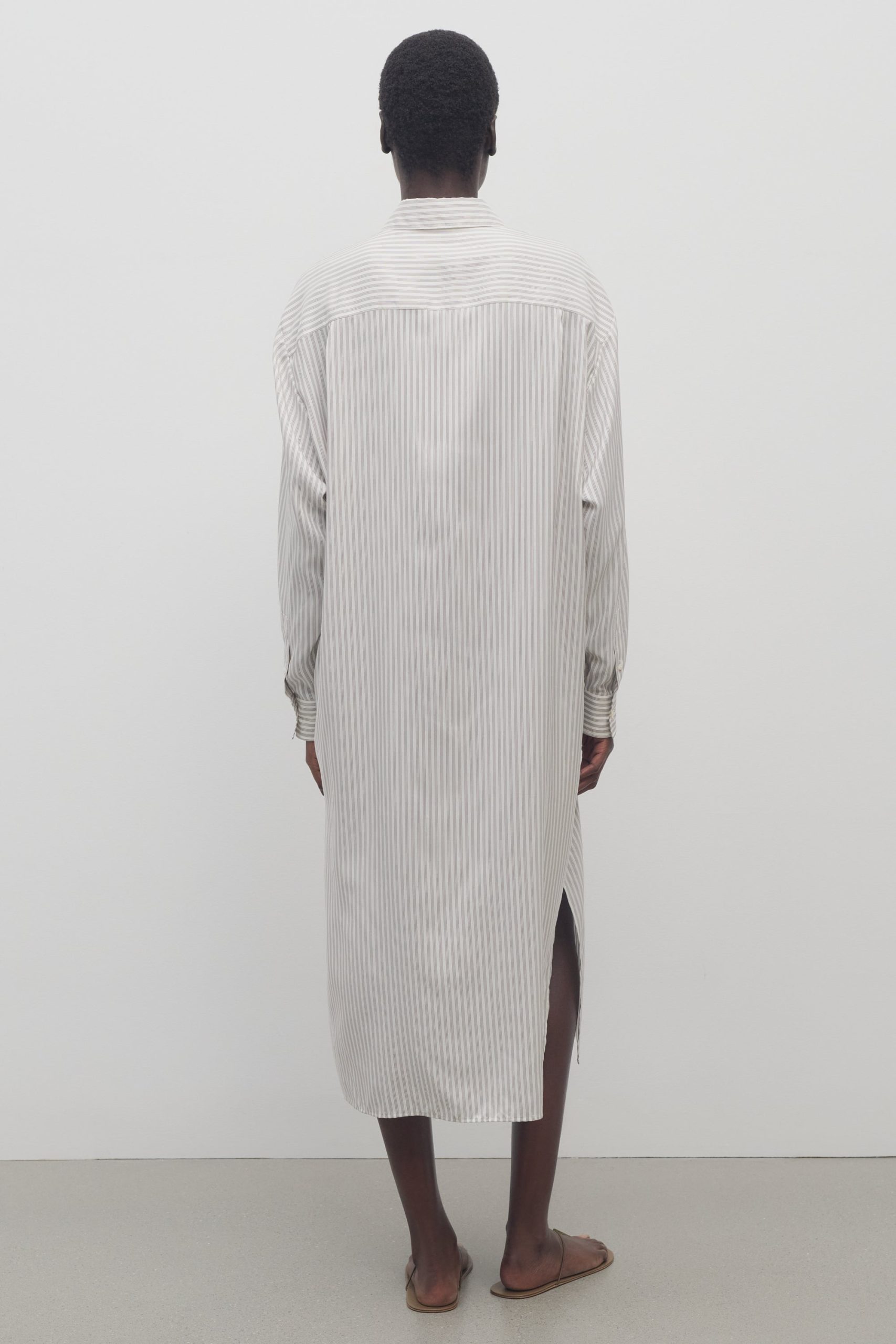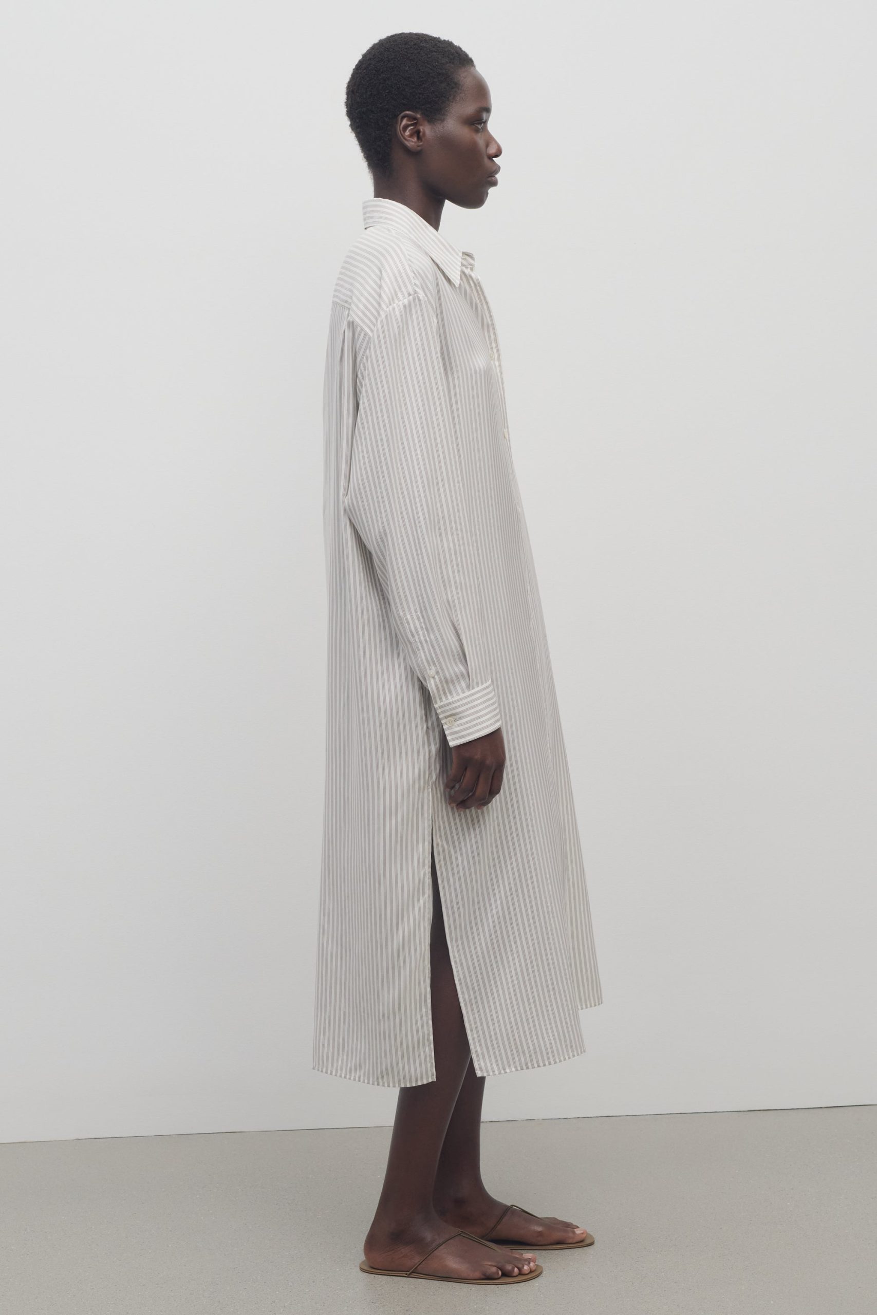 Calf-length shirtdress in fluid striped silk with side hem slits. exposed button placket. and straight fit.