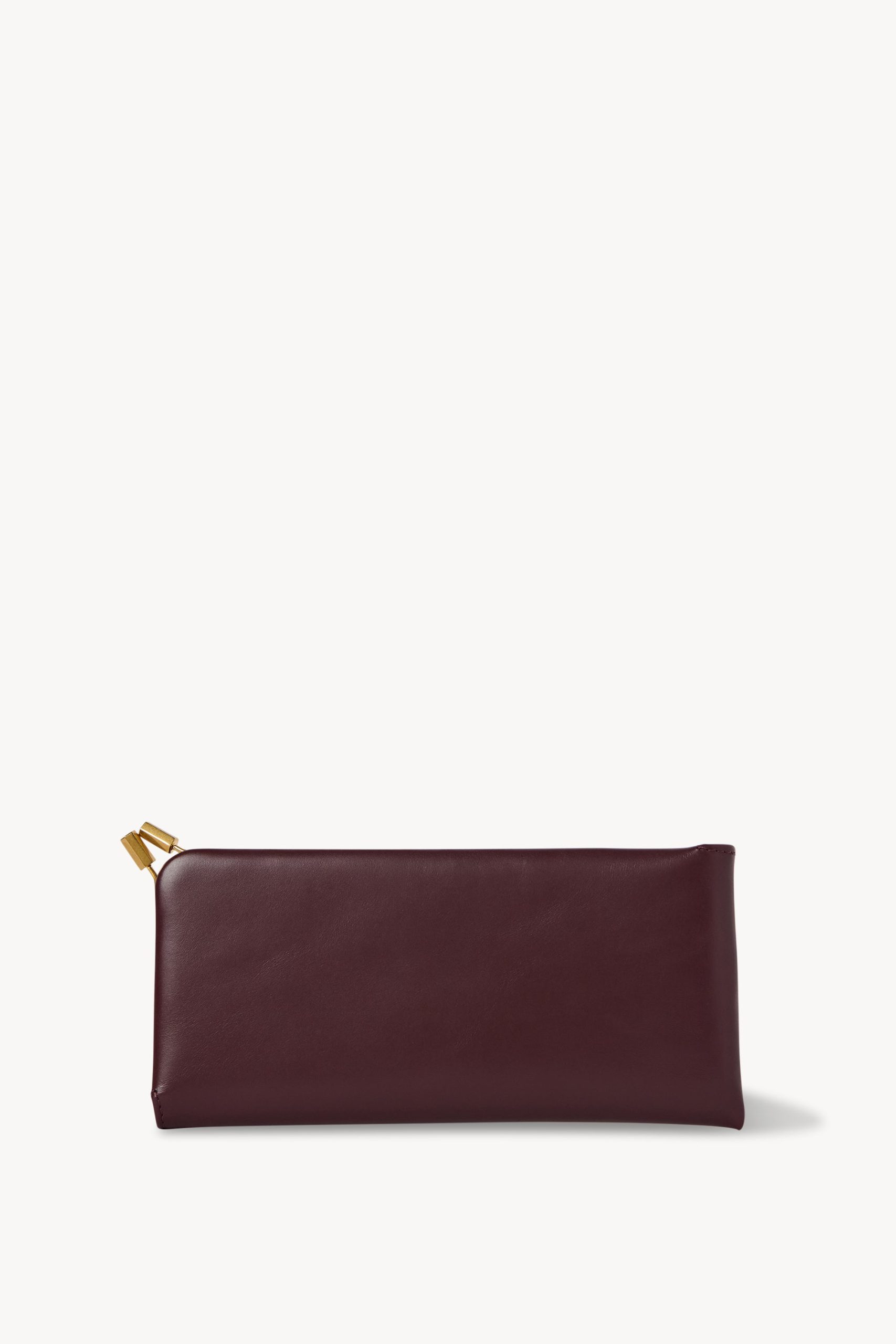 Minimal sunglasses case in buttery lambskin leather with top zipper closure and single interior pocket.