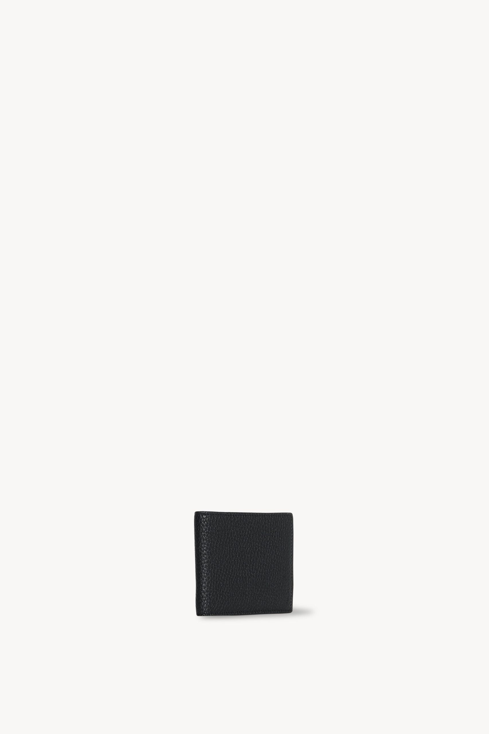Compact wallet in pebbled calfskin leather with multiple card slots. inner bill slot. and embossed logo on interior side.
