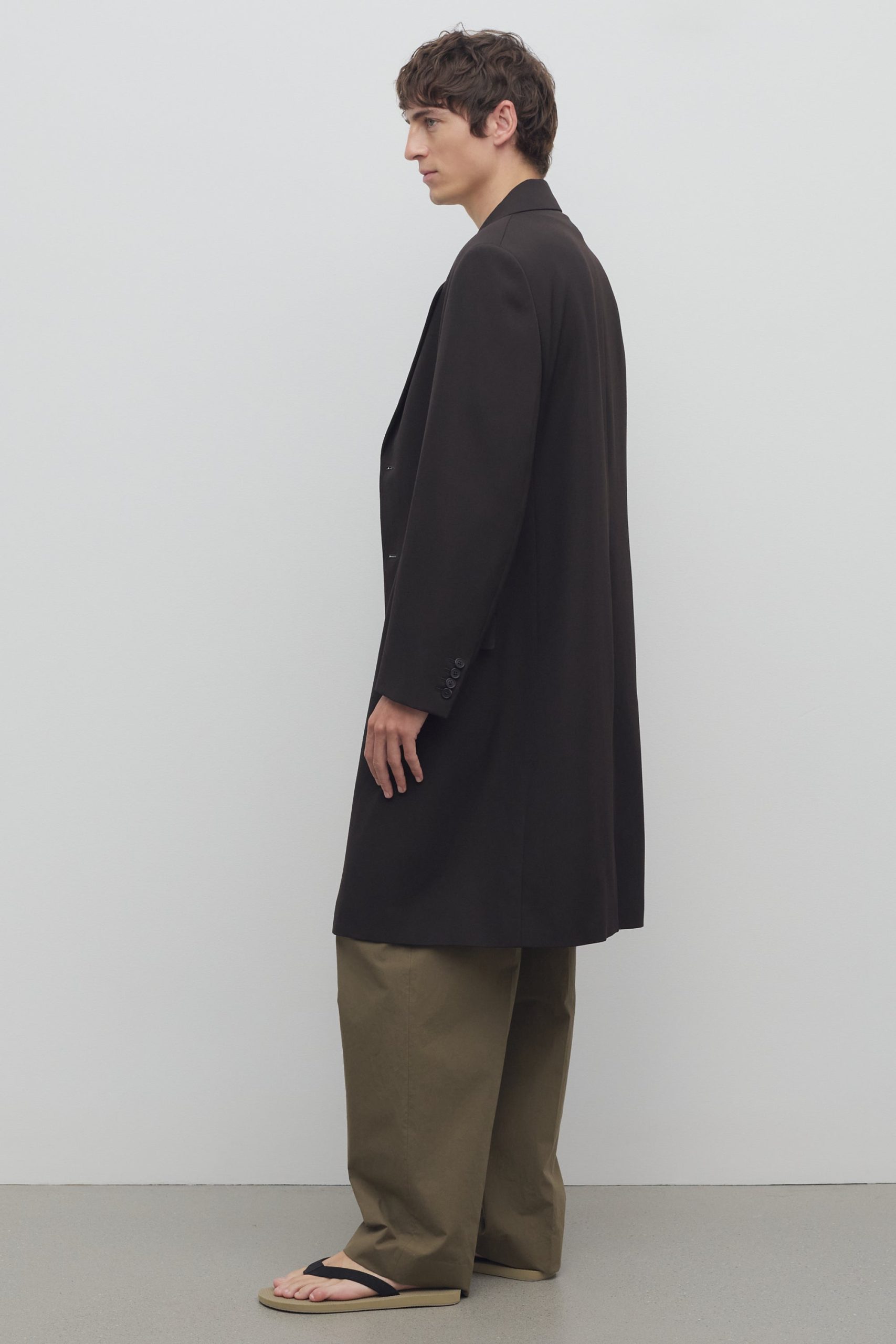 Single-breasted tailored coat in structured virgin wool with wide notched lapels. front flap pockets. and horn button closure.