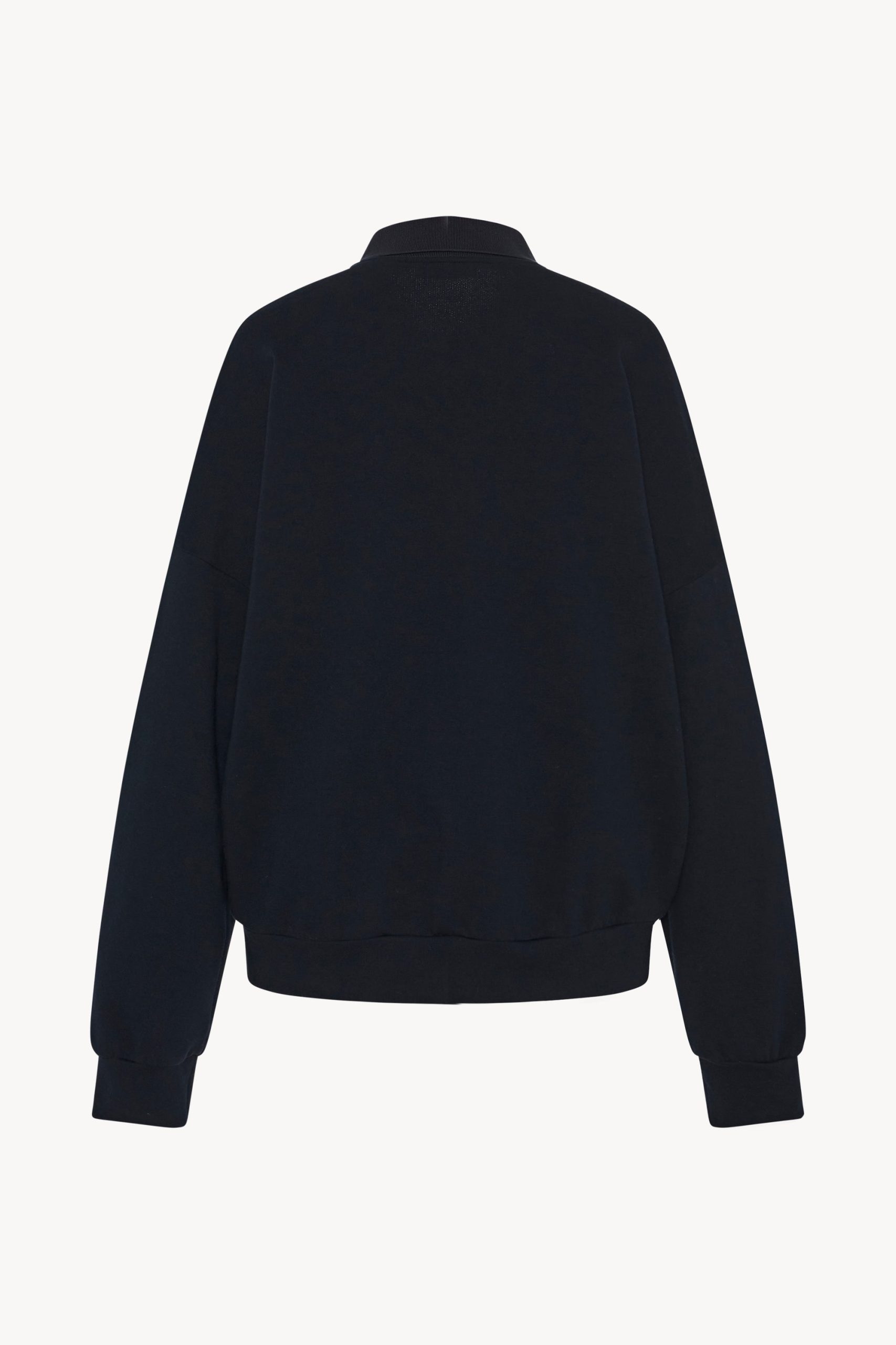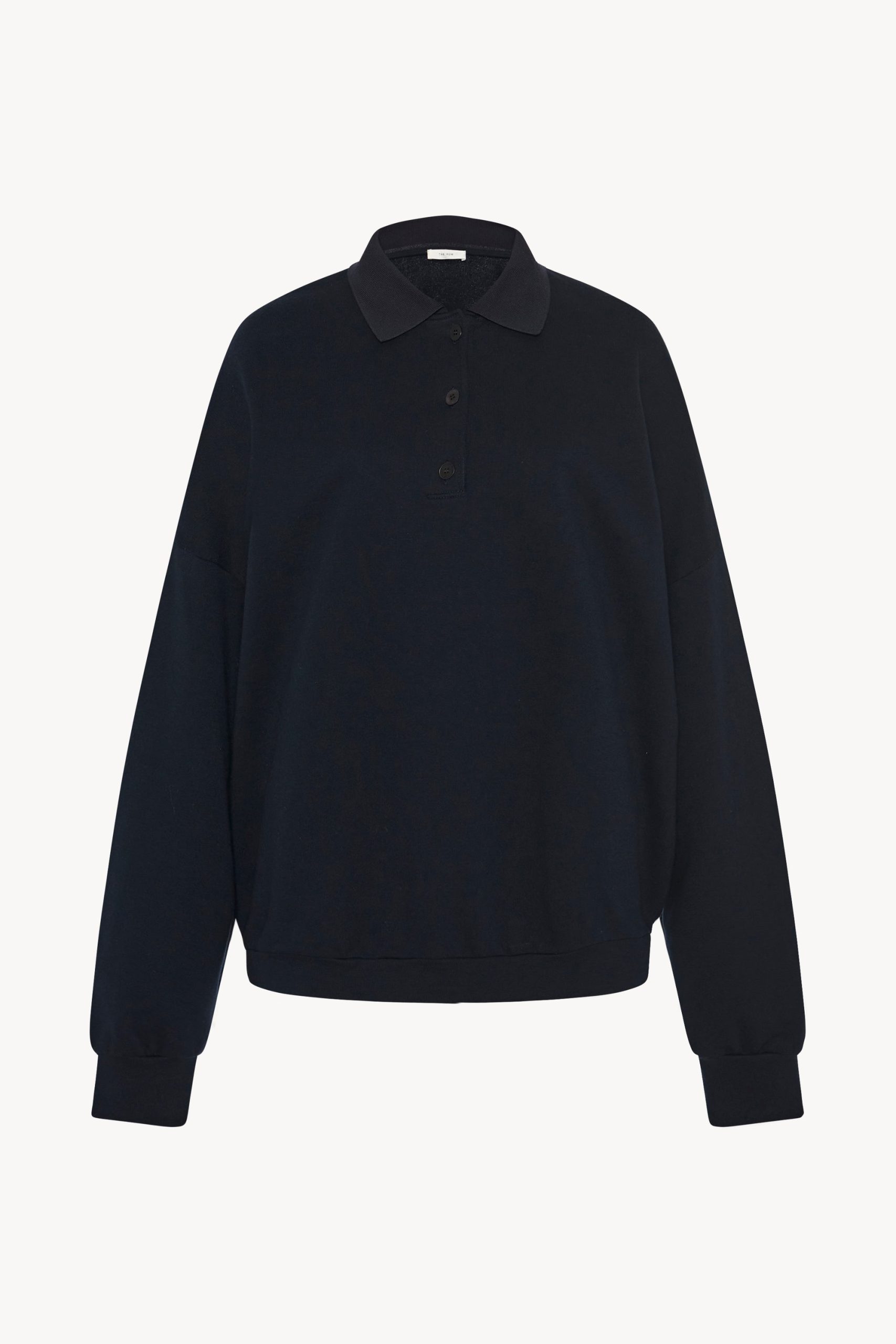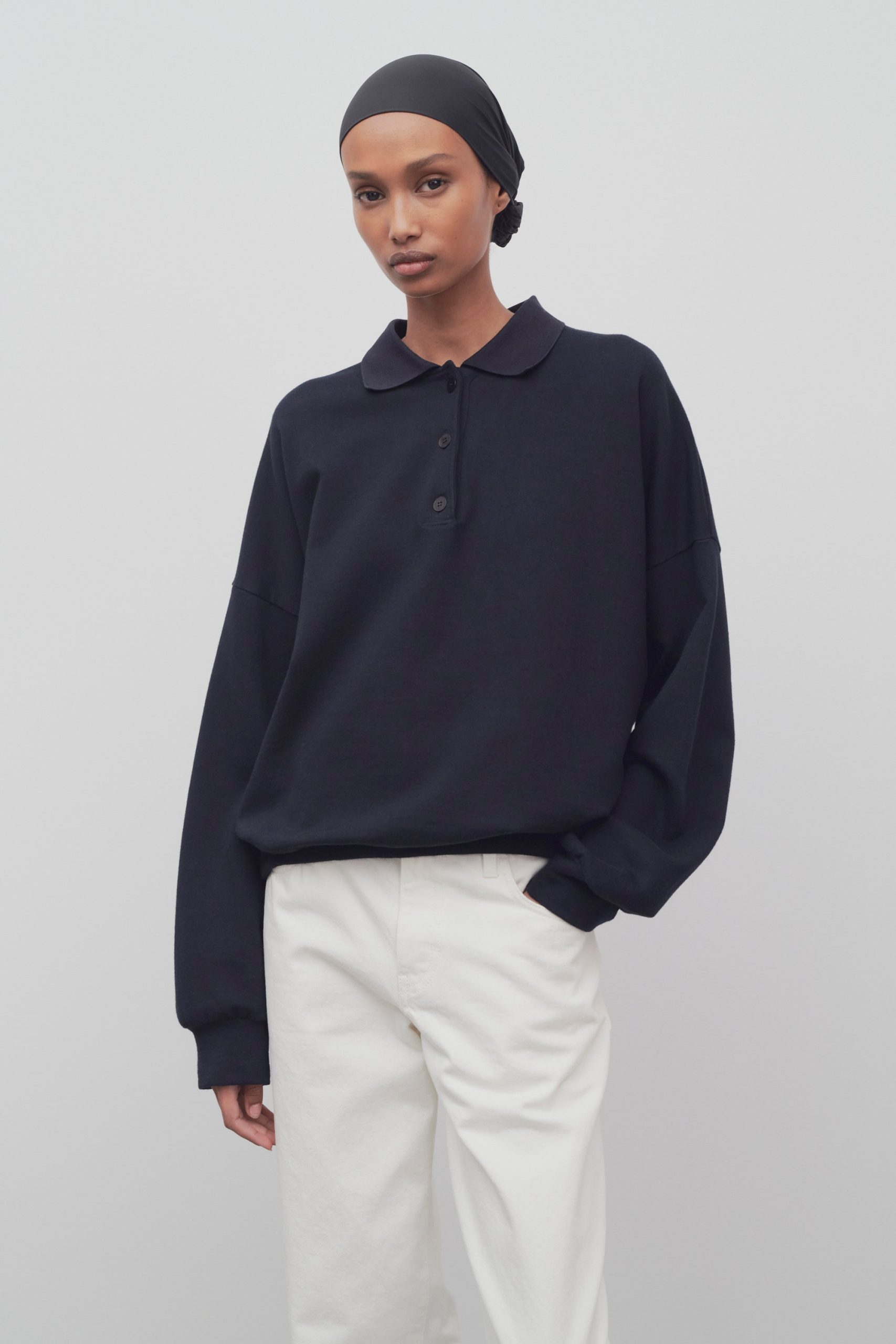 Oversized long-sleeved polo in fine French terry cloth with dropped shoulder and custom ribbed-knit collar.