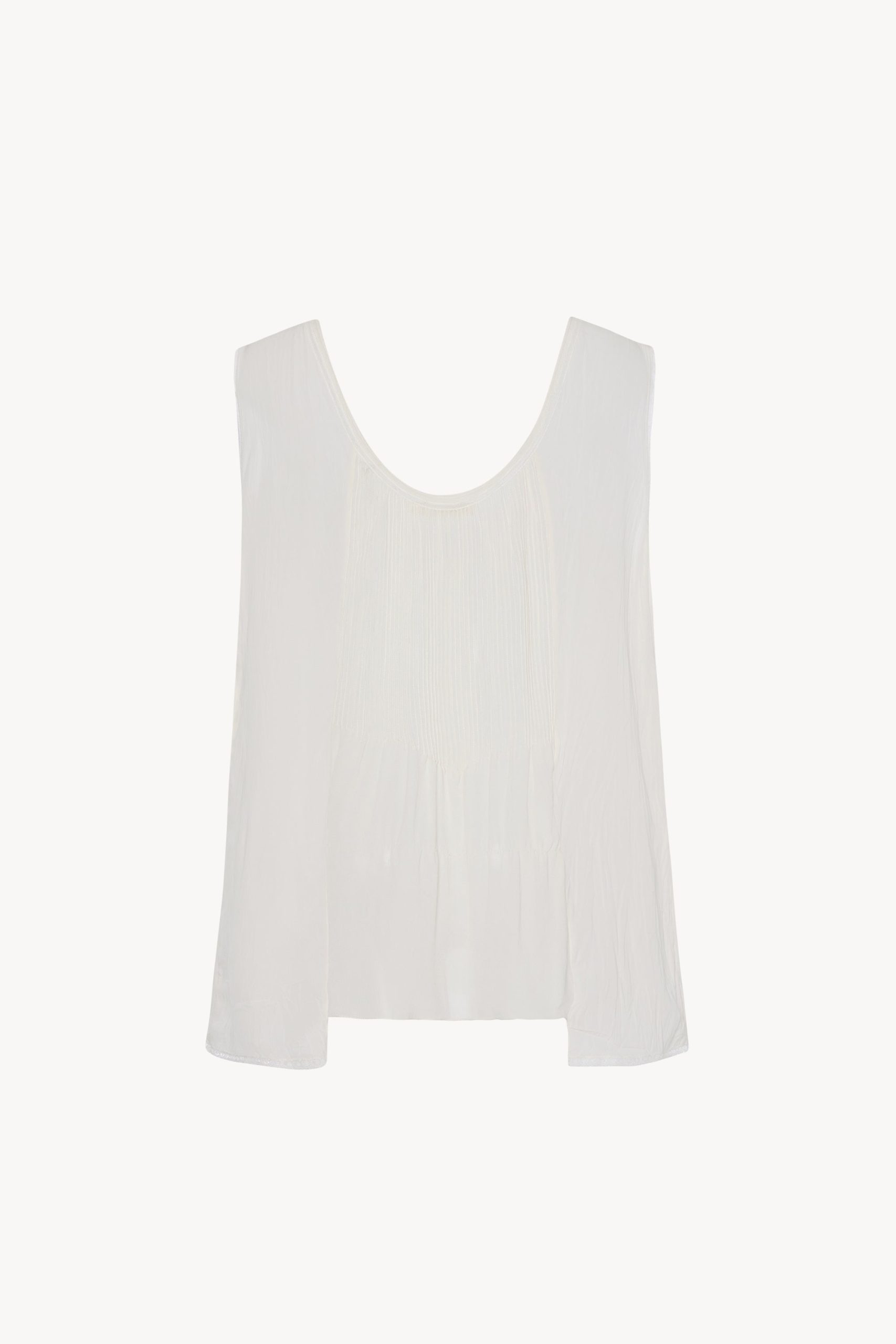 Paneled sleeveless top in lightweight silk georgette with scooped neckline. handcrafted pintuck detailing. and fine lace trim at hem.