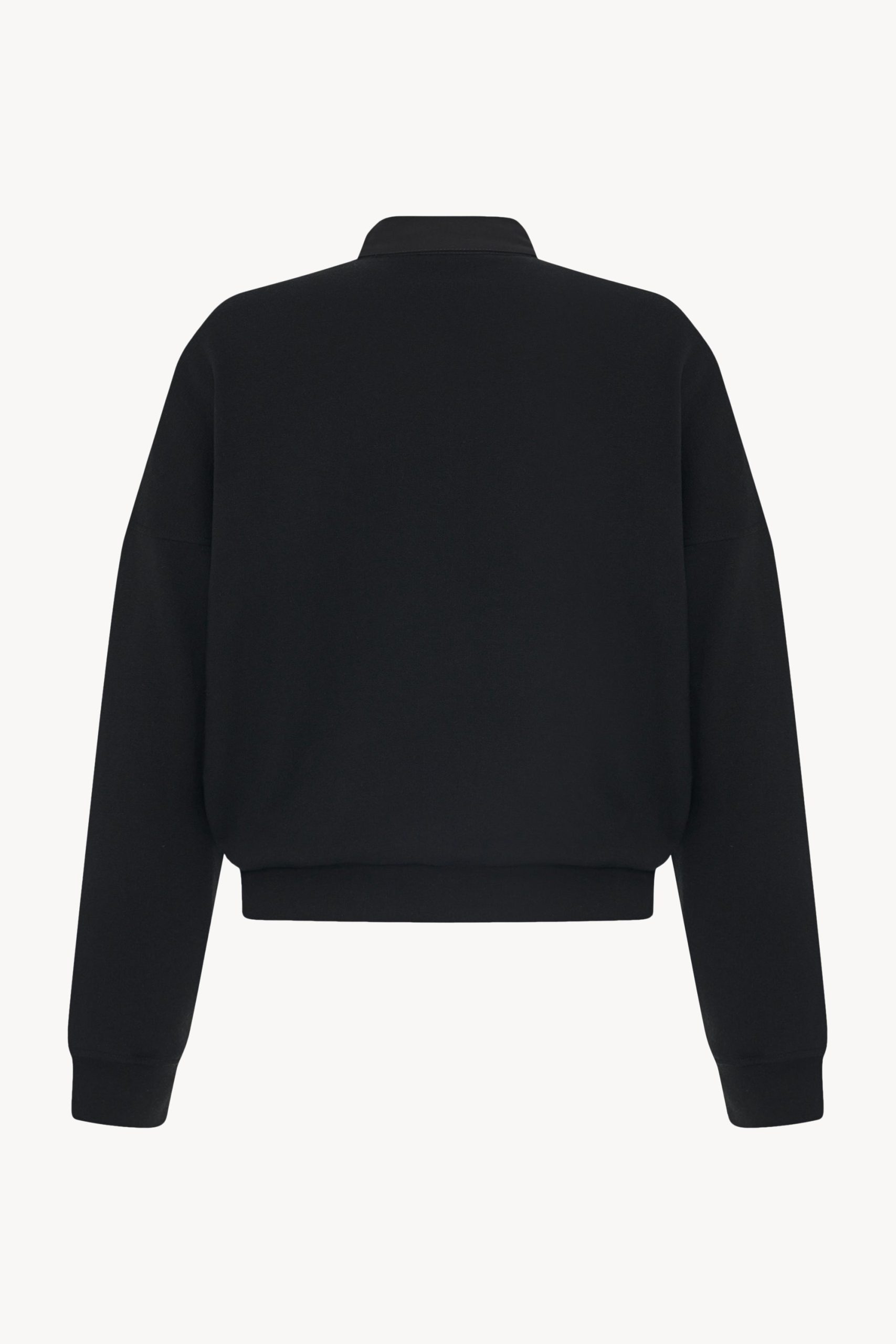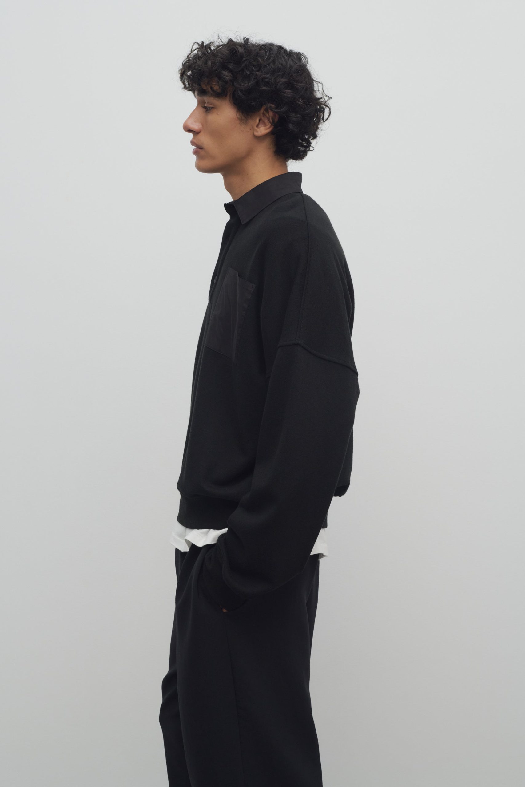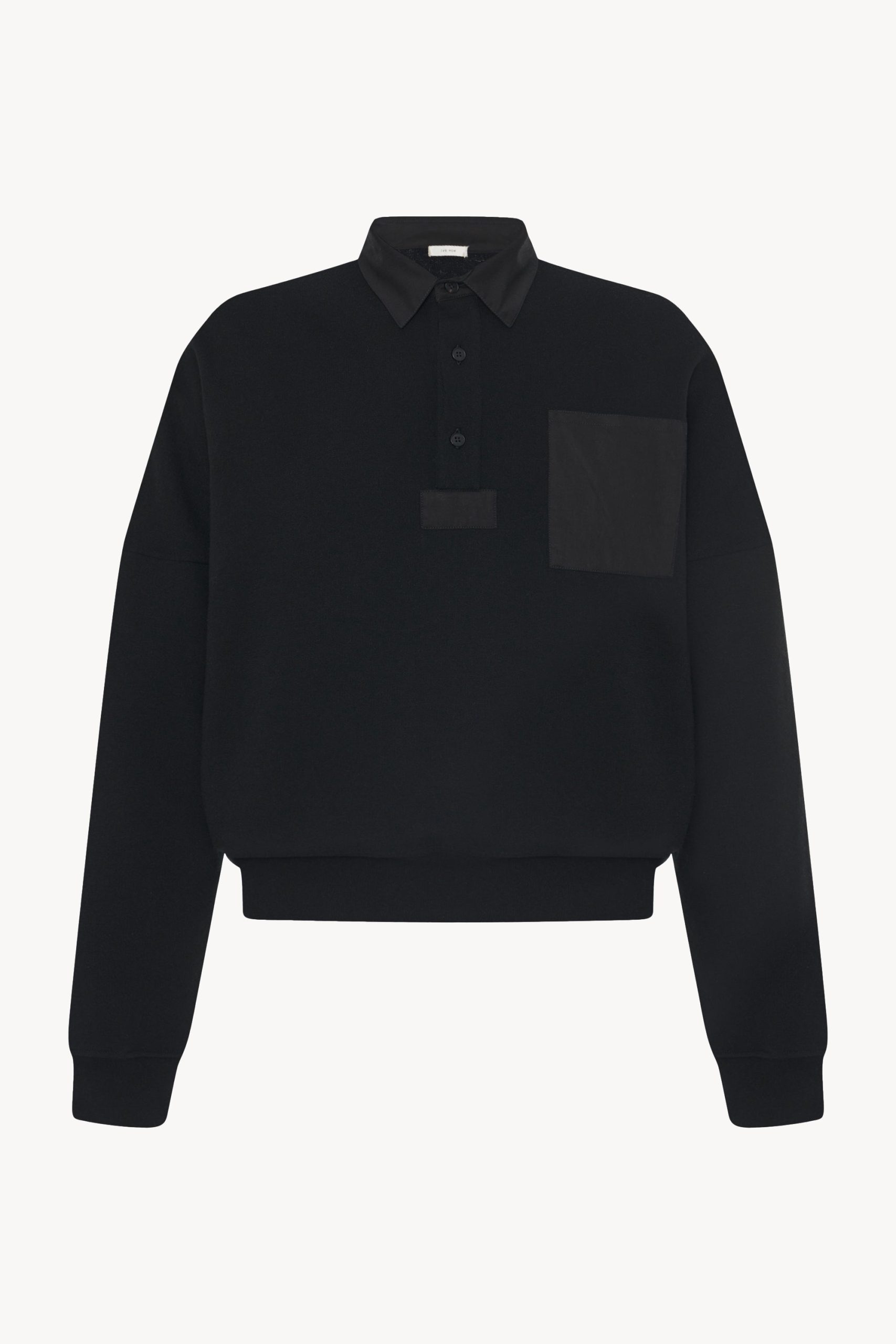 Oversized polo top in cashmere and cotton French terry with dropped shoulders. tonal cotton patch pocket. collar. and placket square. and ribbed cuffs and hem.