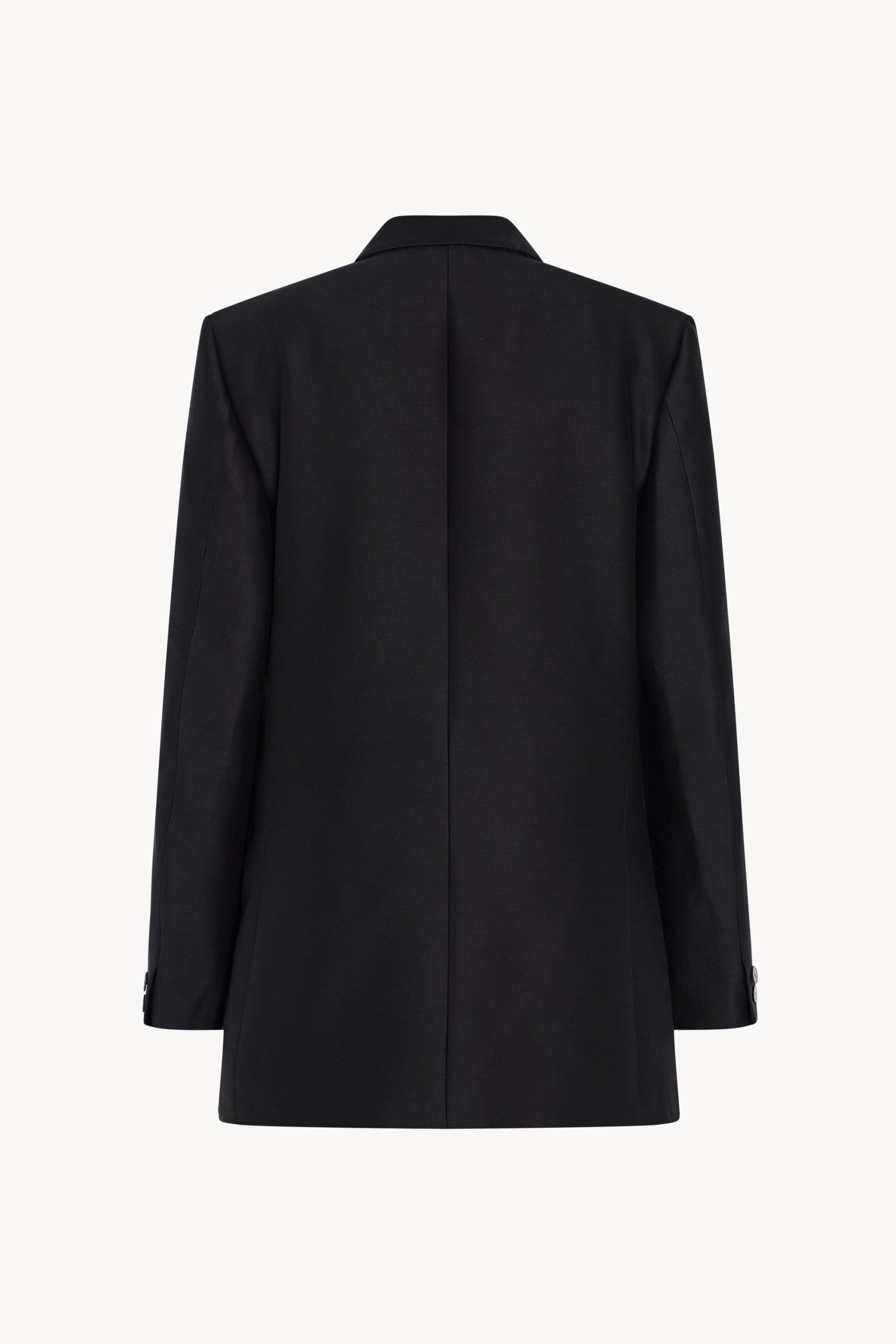 Double-breasted smoking jacket in lightweight wool and silk suiting with double horn button closure. front chest and besom pockets. and regular fit.
