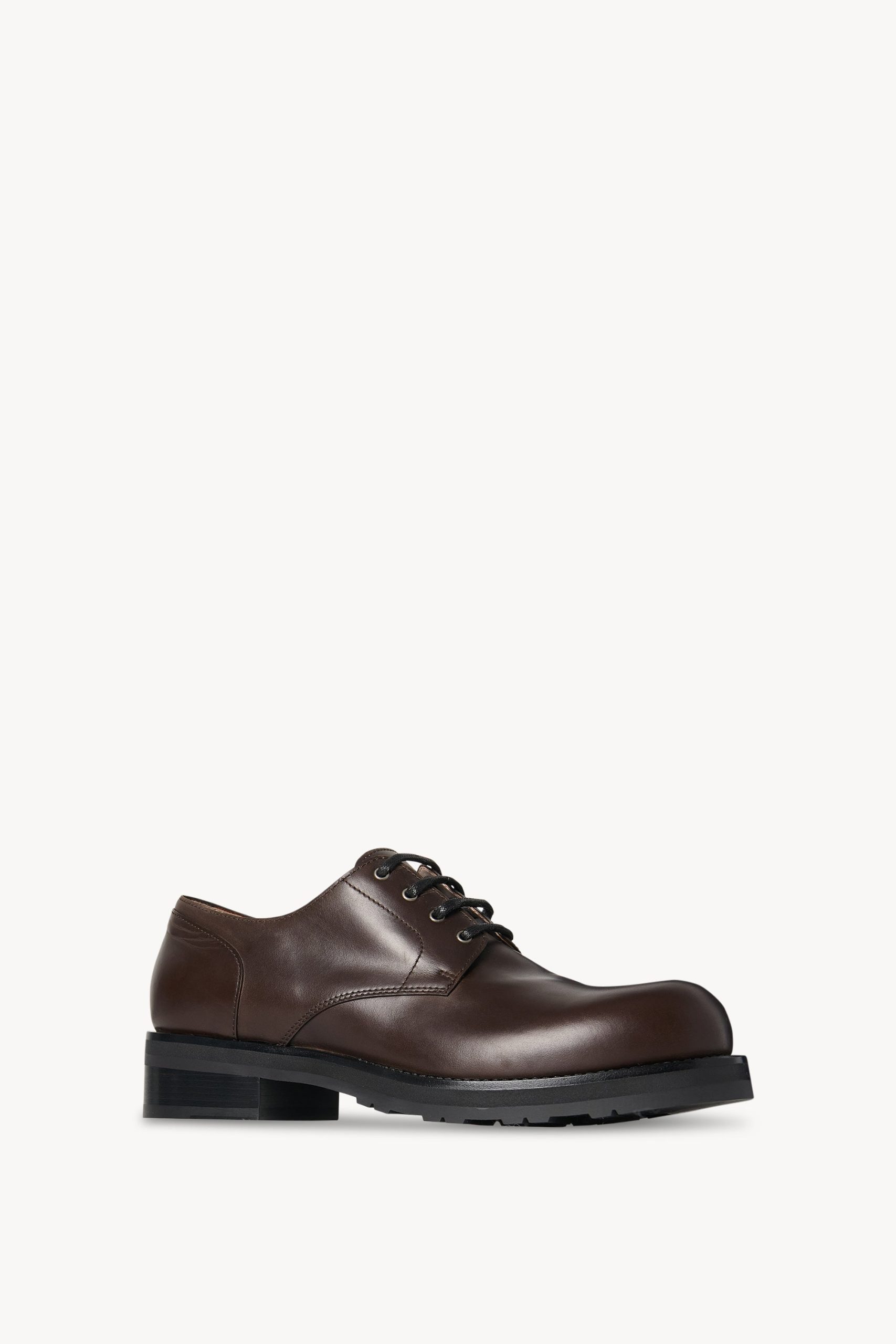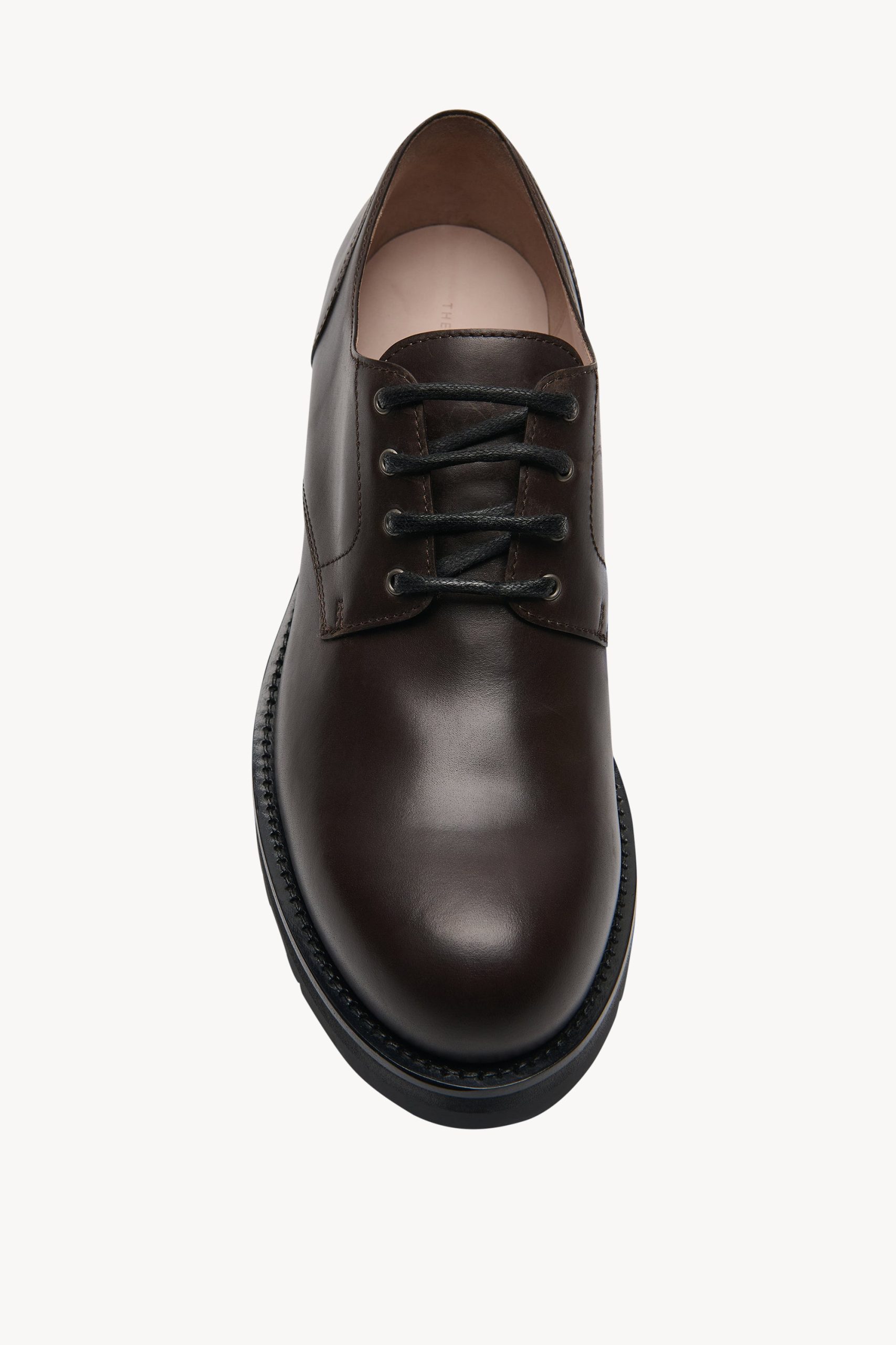 Derby shoe in glossy calfskin leather with round toe. laced front. and treaded rubber sole.