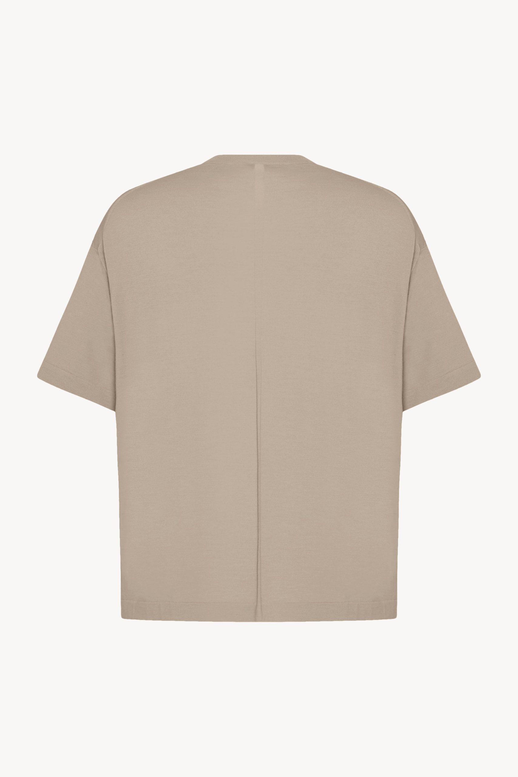 Crewneck t-shirt in extra fine wool with boxy fit. ribbed collar. and signature center back detail.