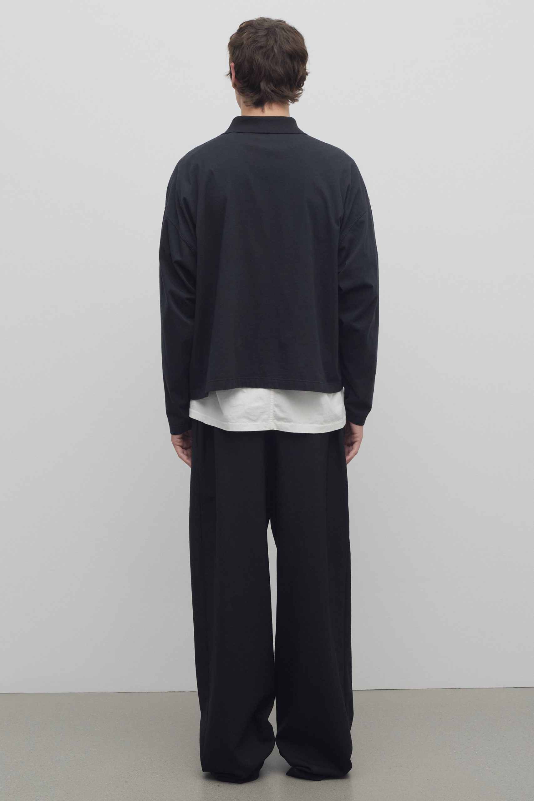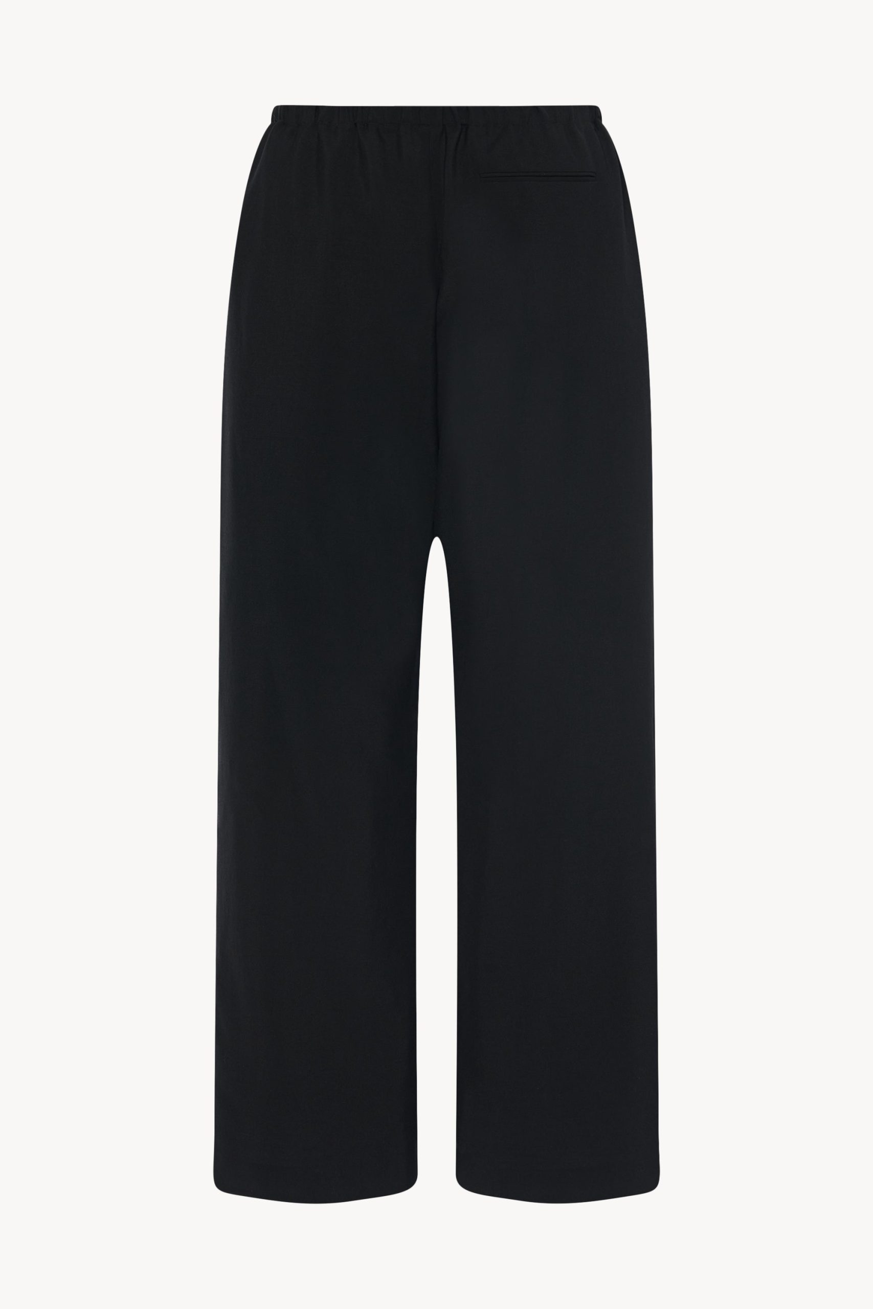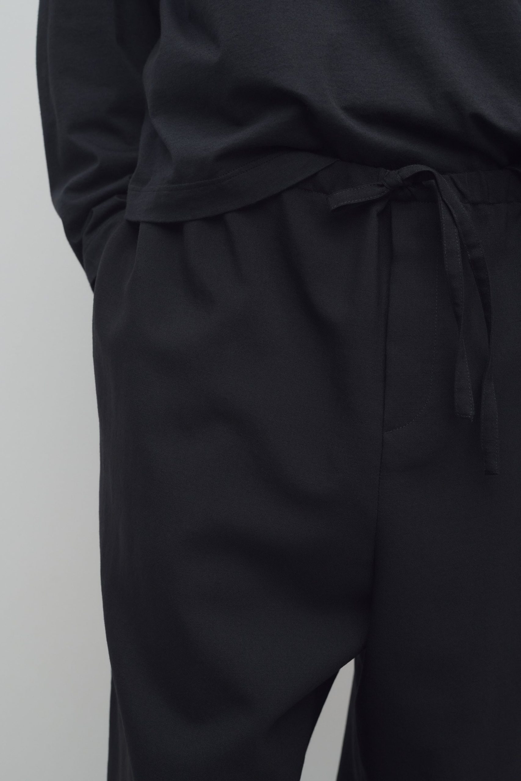 Relaxed wide leg pant in mohair and wool with side seam pockets. zipper fly. and elasticated waistband with drawstring closure.