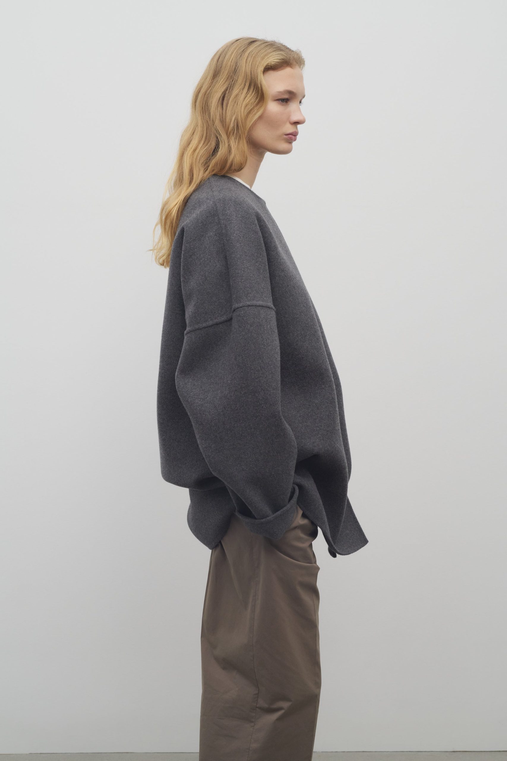 Oversized hand-crafted jacket in double-faced cashmere with dropped shoulders. side seam pockets. and concealed hook and eye closure.
