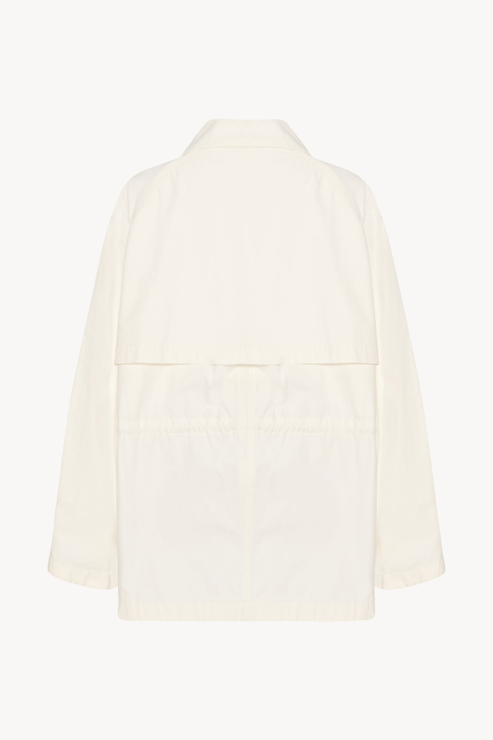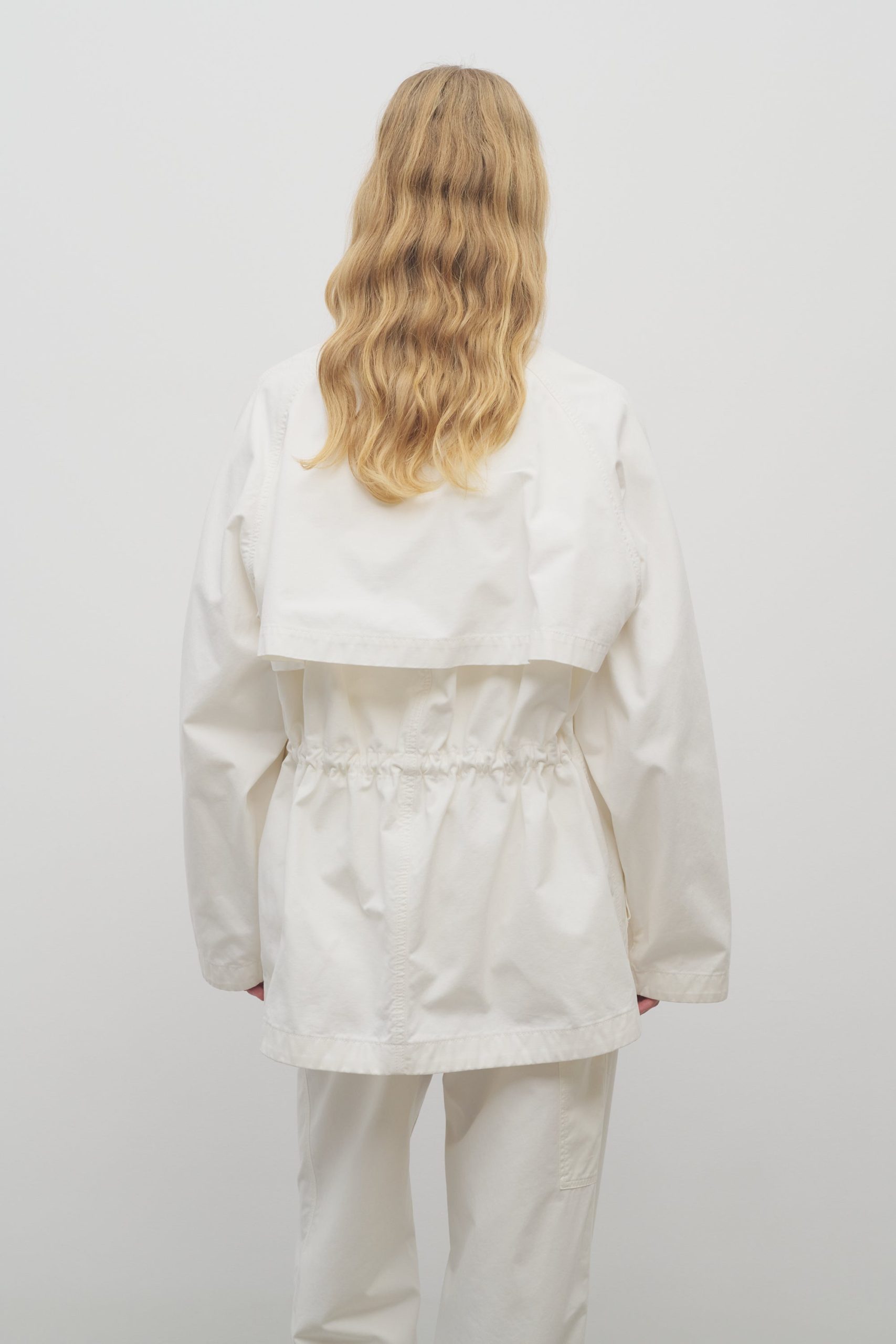 Outdoor jacket in washed Japanese cotton canvas with back storm flap. front patch pockets. and concealed front placket with snap and zipper closure.