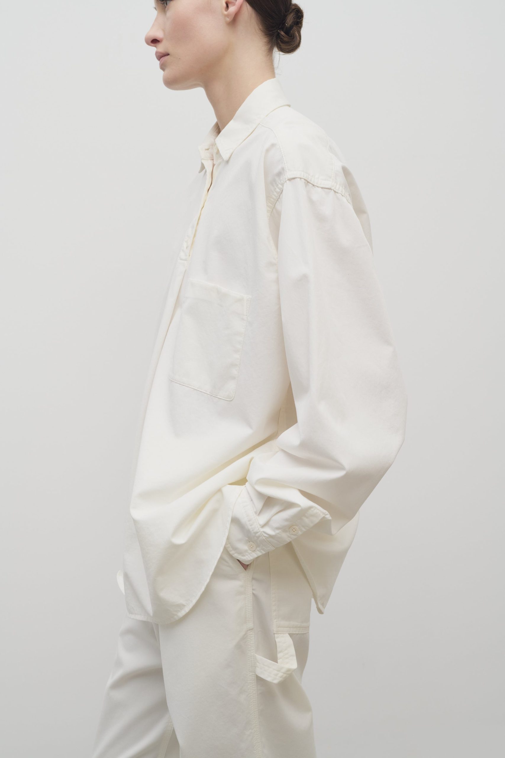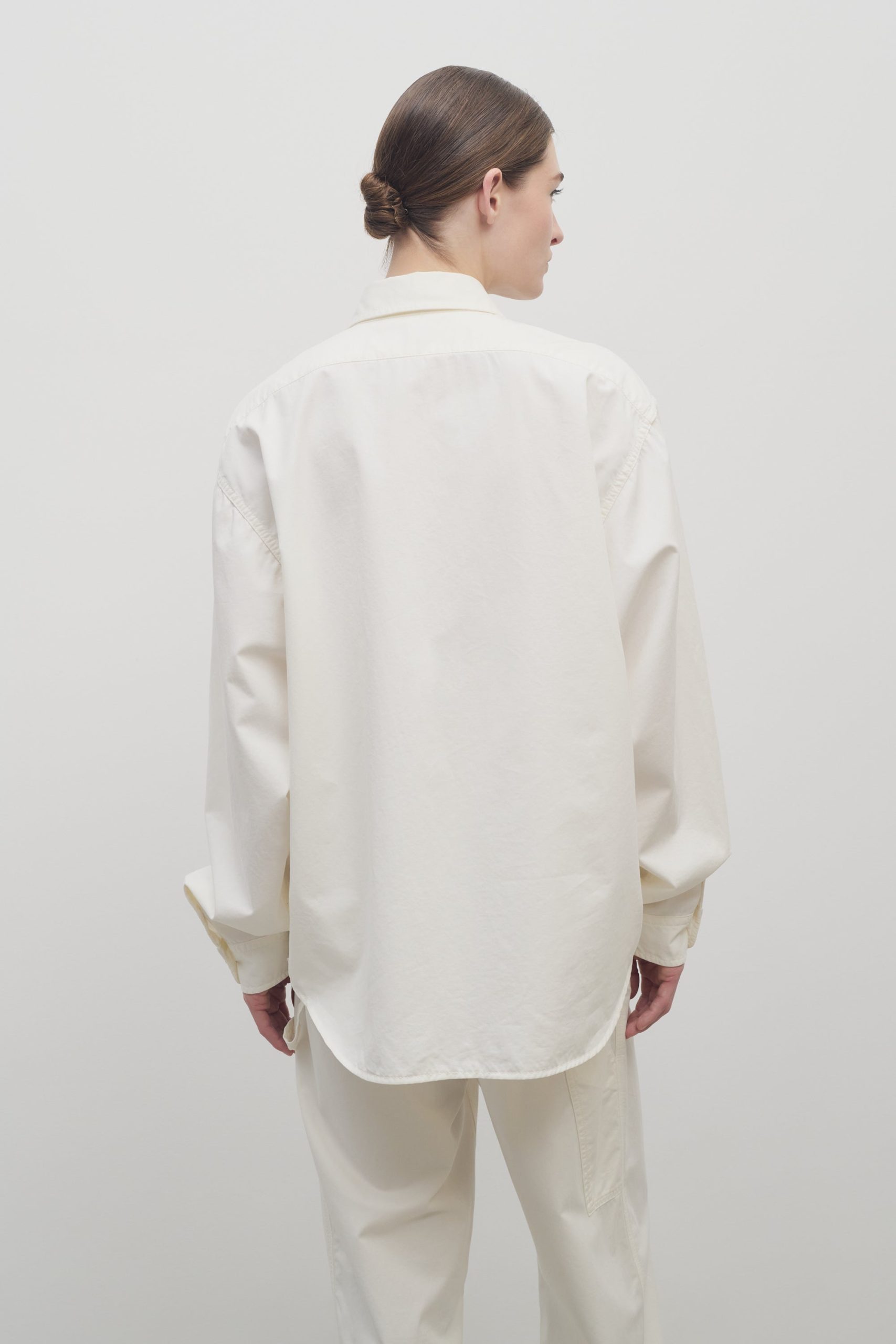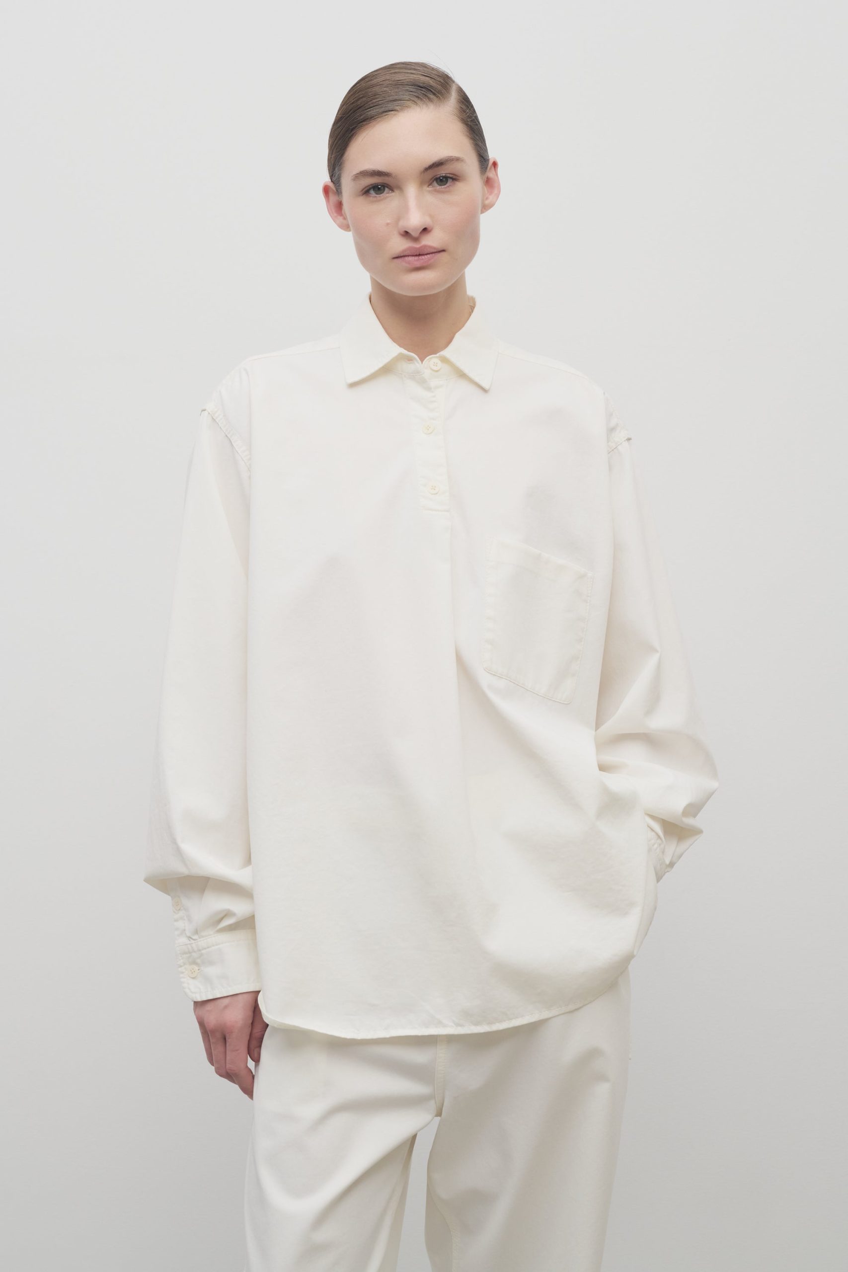 Oversized collared shirt in soft cotton and cashmere gabardine with front patch pocket. slim back yoke. and exposed polo placket.