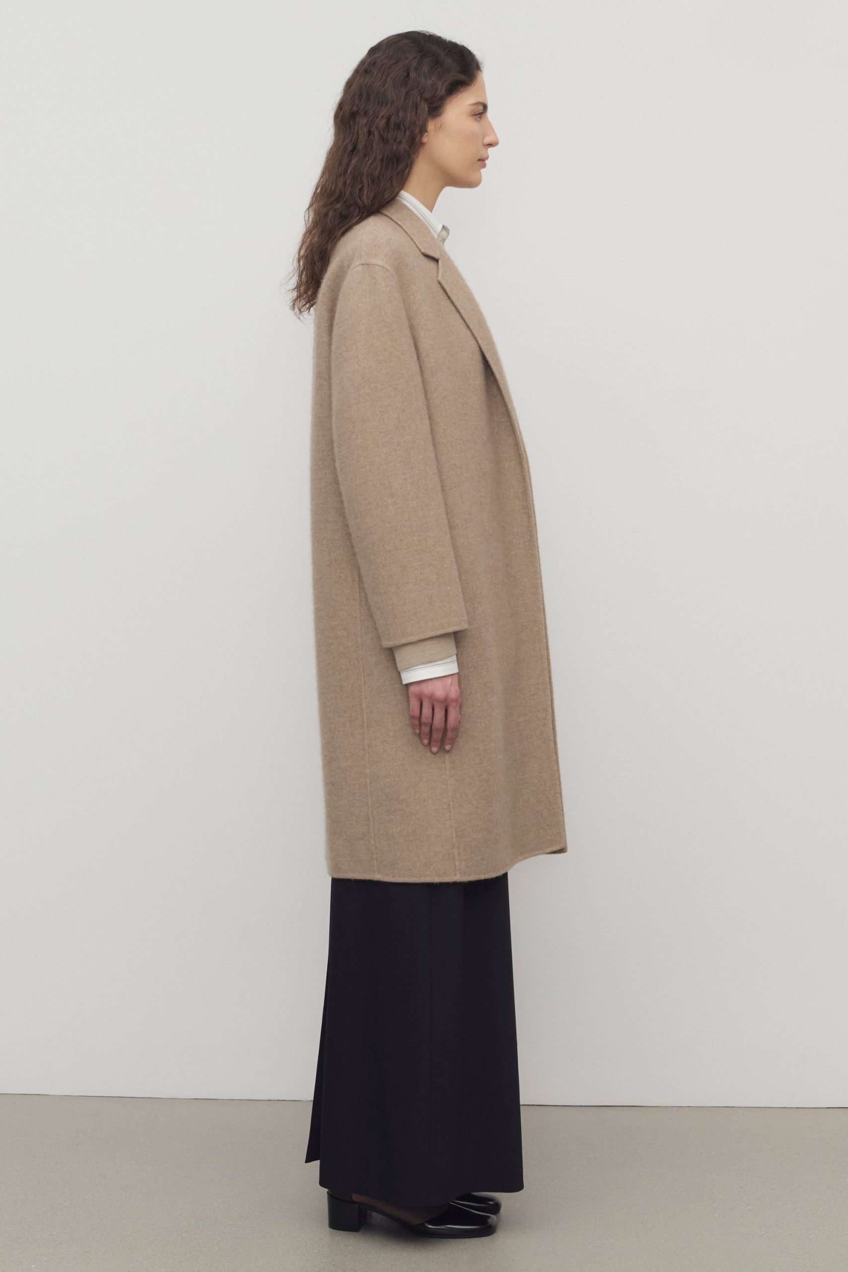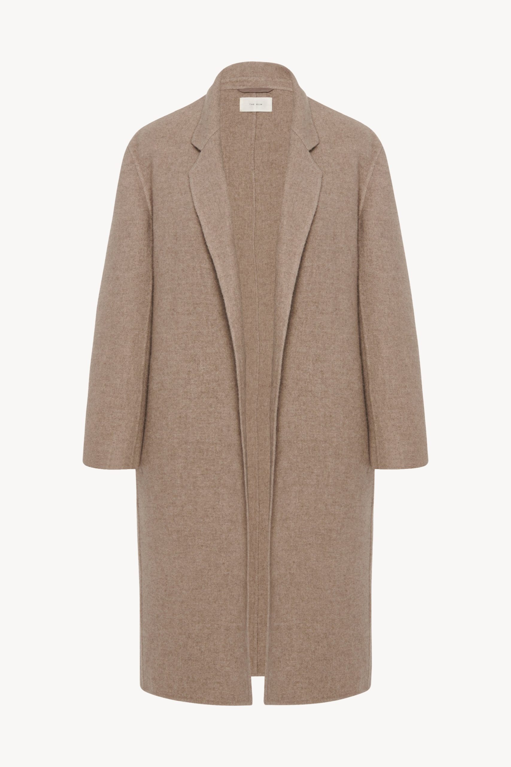 Handcrafted duster coat in double-faced cashmere flannel with notch lapel. unlined finish. and open front.