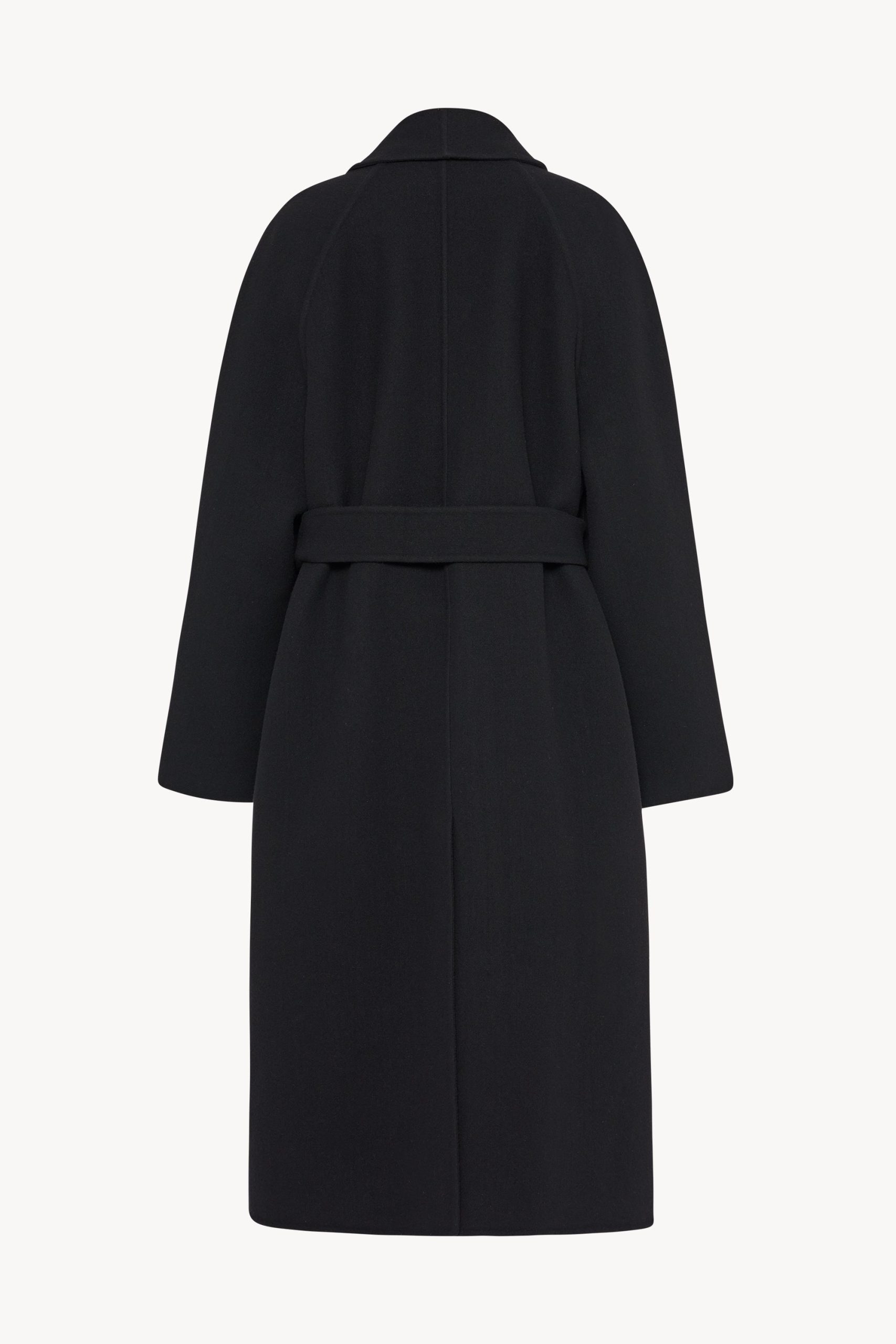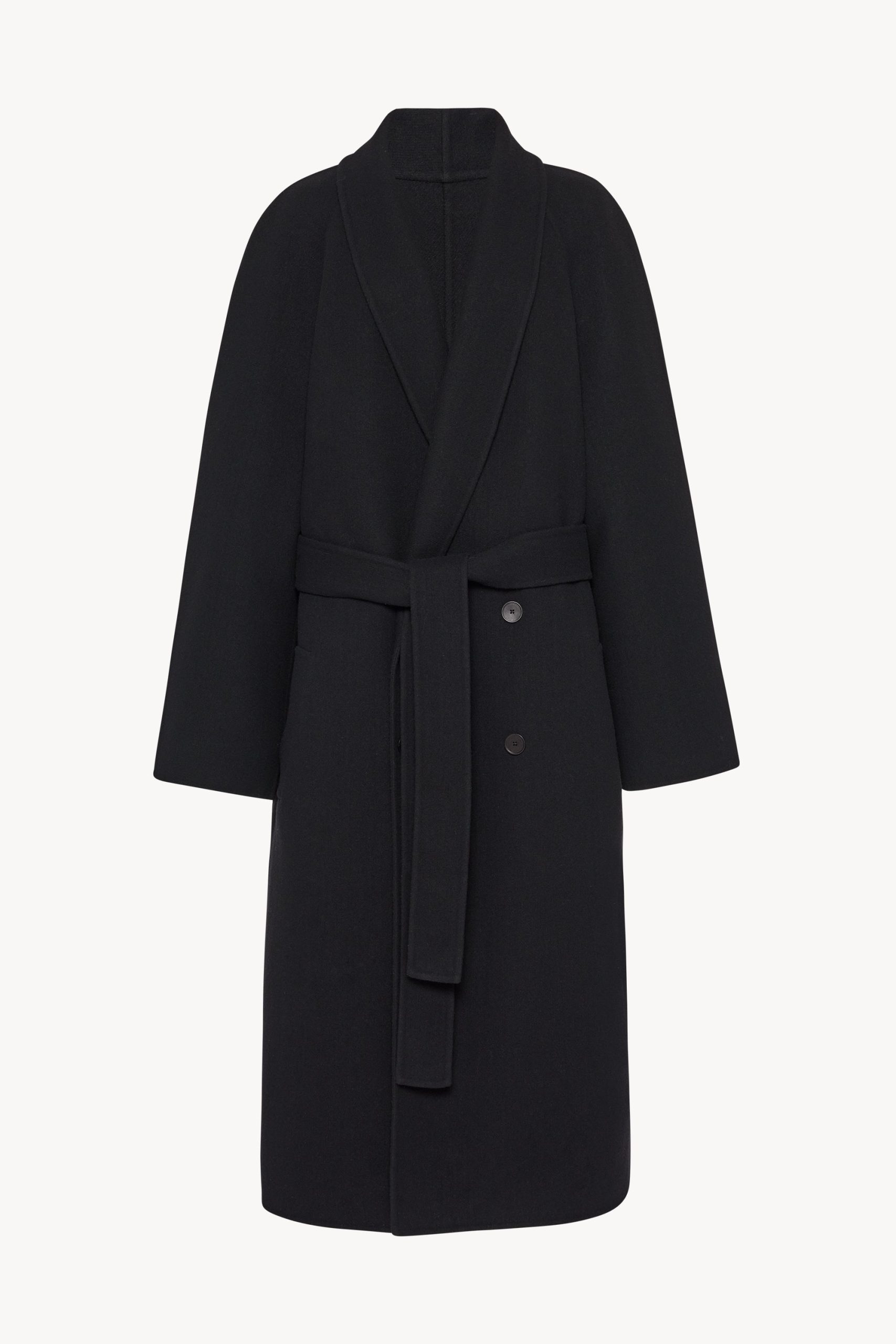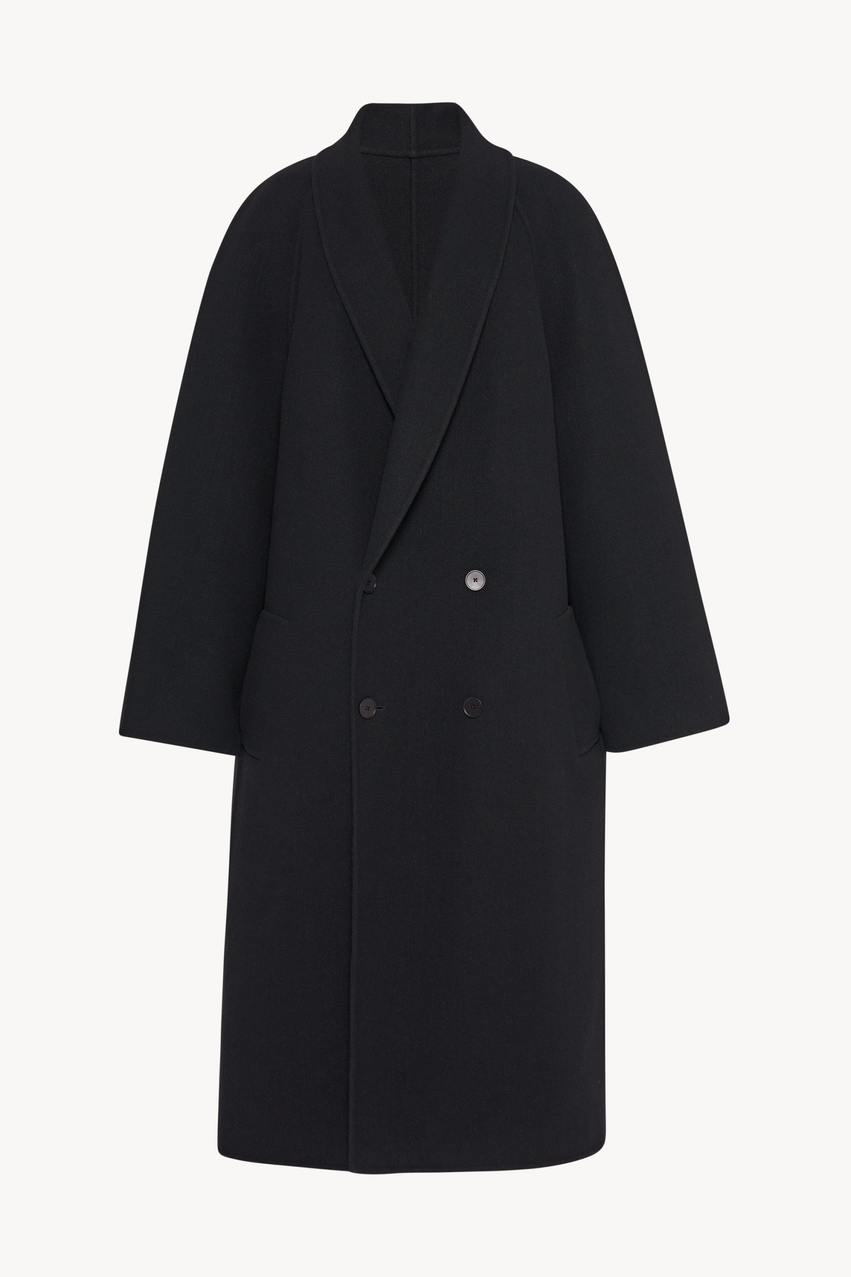 Knee-length double-breasted coat in felted wool with relaxed oversized fit. high shawl collar. exposed 4-button placket and center back vented seam.