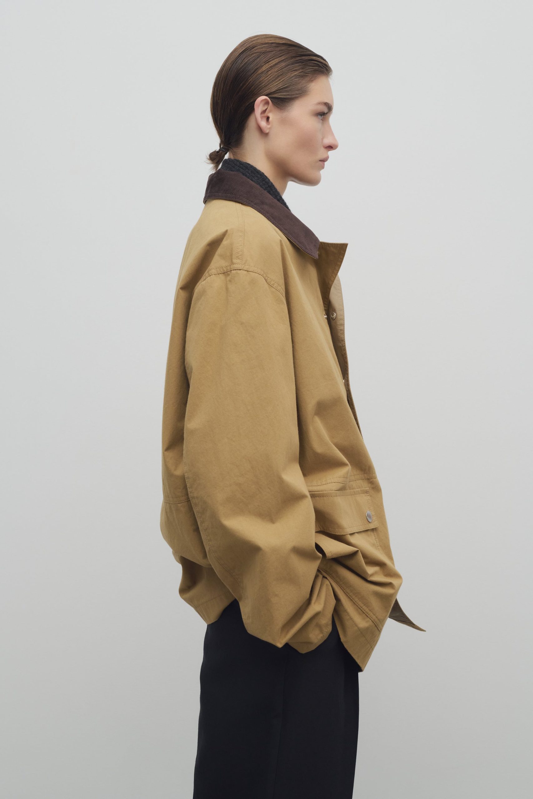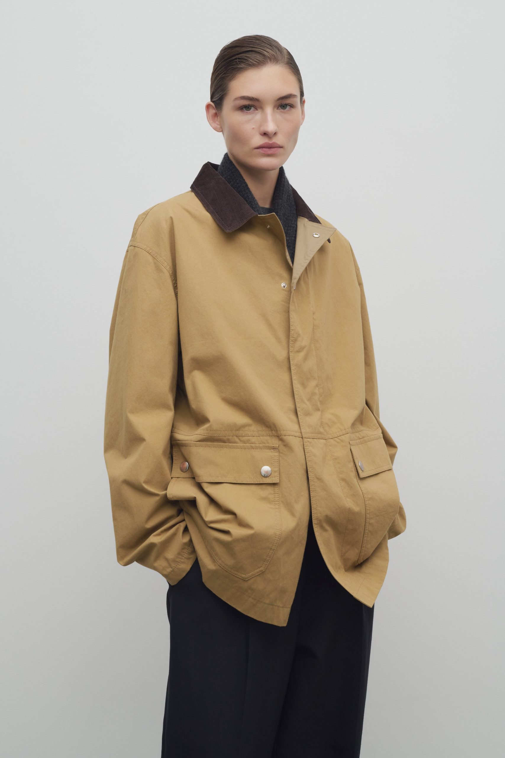 Outdoor jacket in enzyme-washed cotton with contrast corduroy collar. front patch pockets. and concealed front placket with snap and zipper closure.