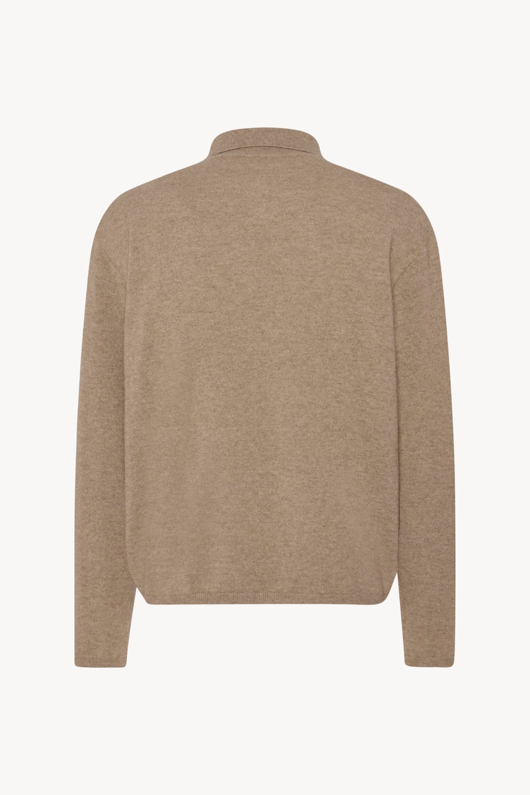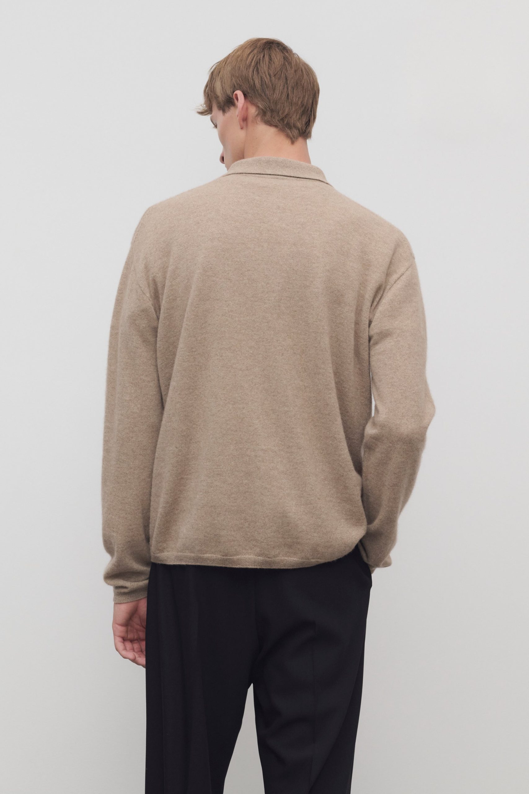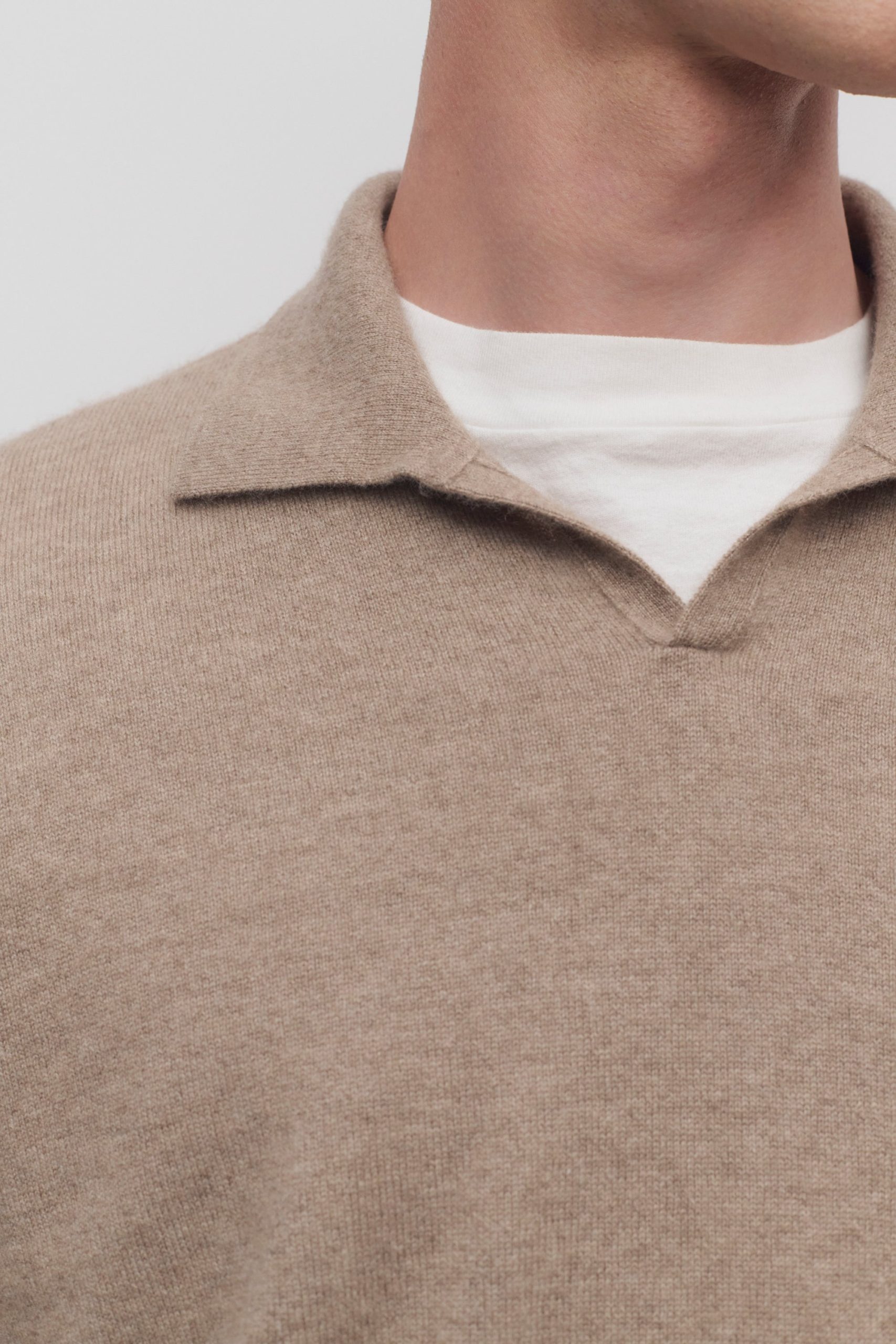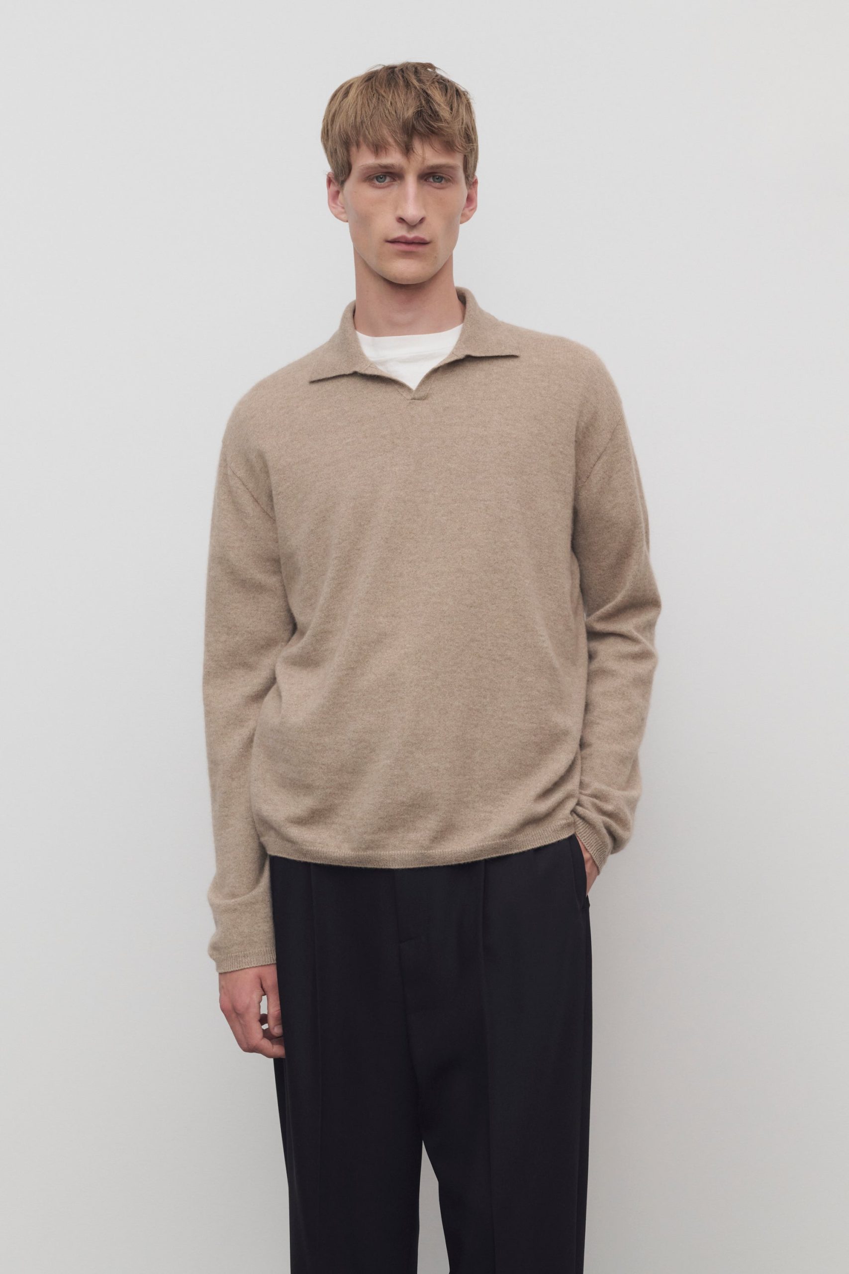 Long-sleeved polo top in soft cashmere with relaxed fit. buttonless front tab. and ribbed collar. cuffs. and hem.