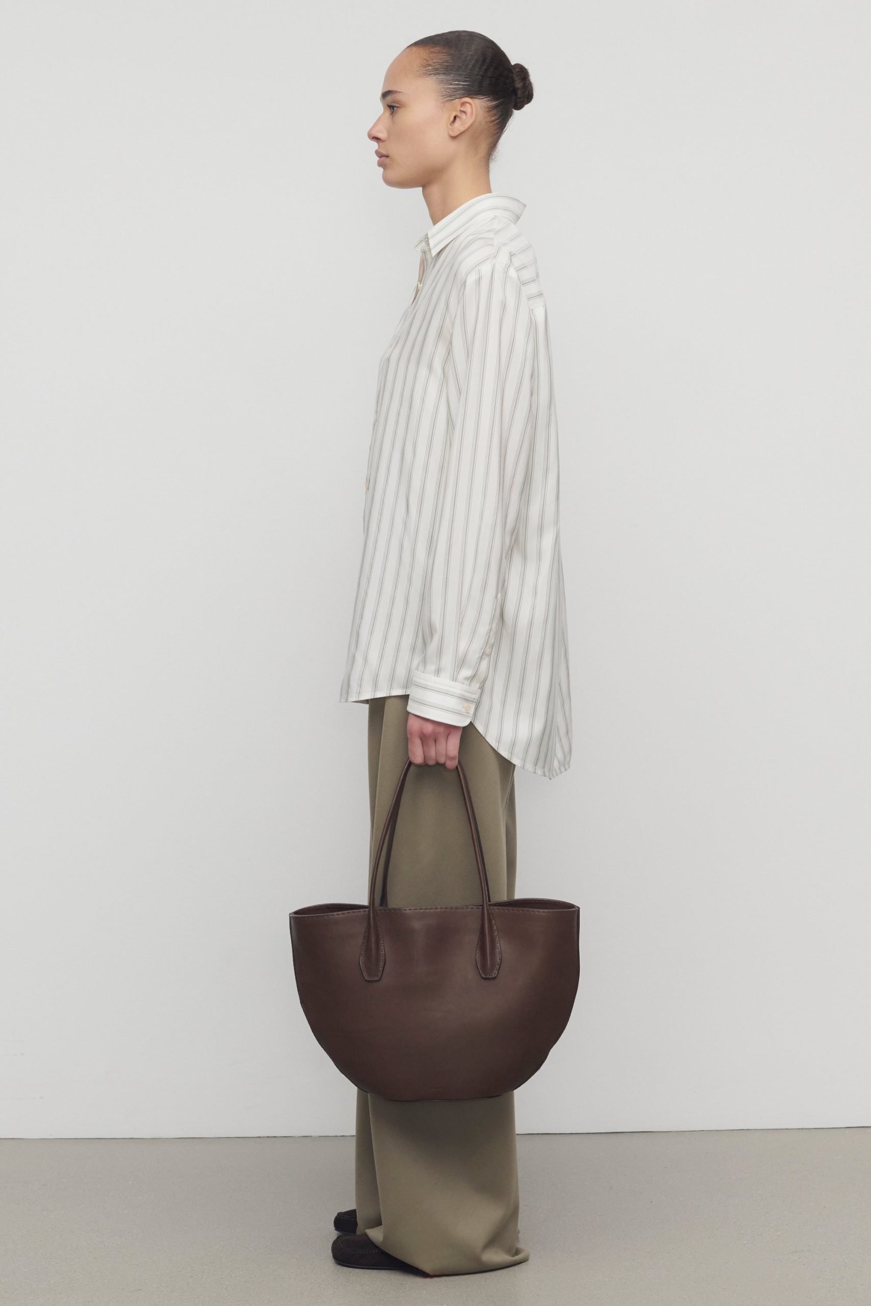 Bias-cut pant in virgin wool flannel with slim gathered elastic waistband and wide leg.