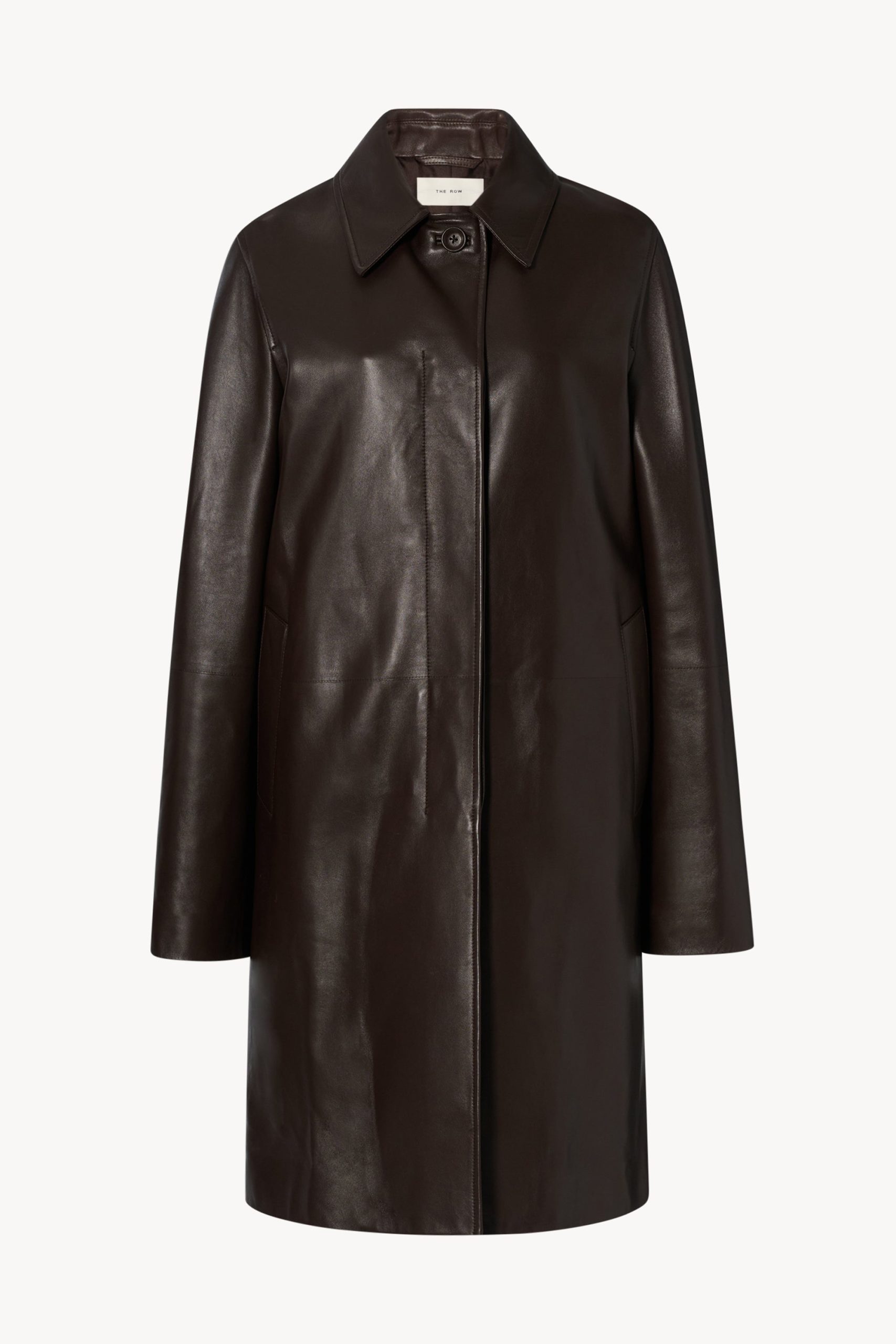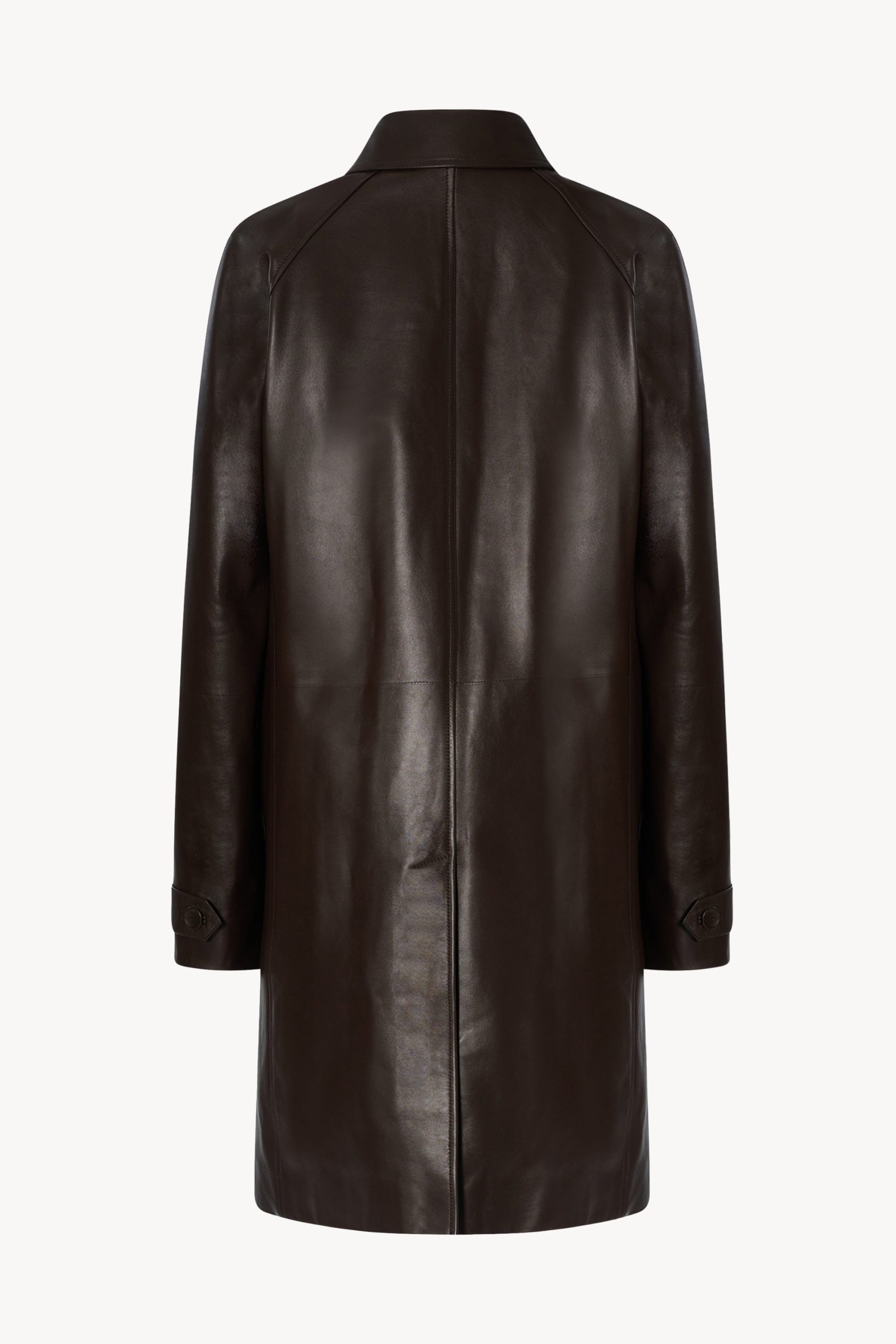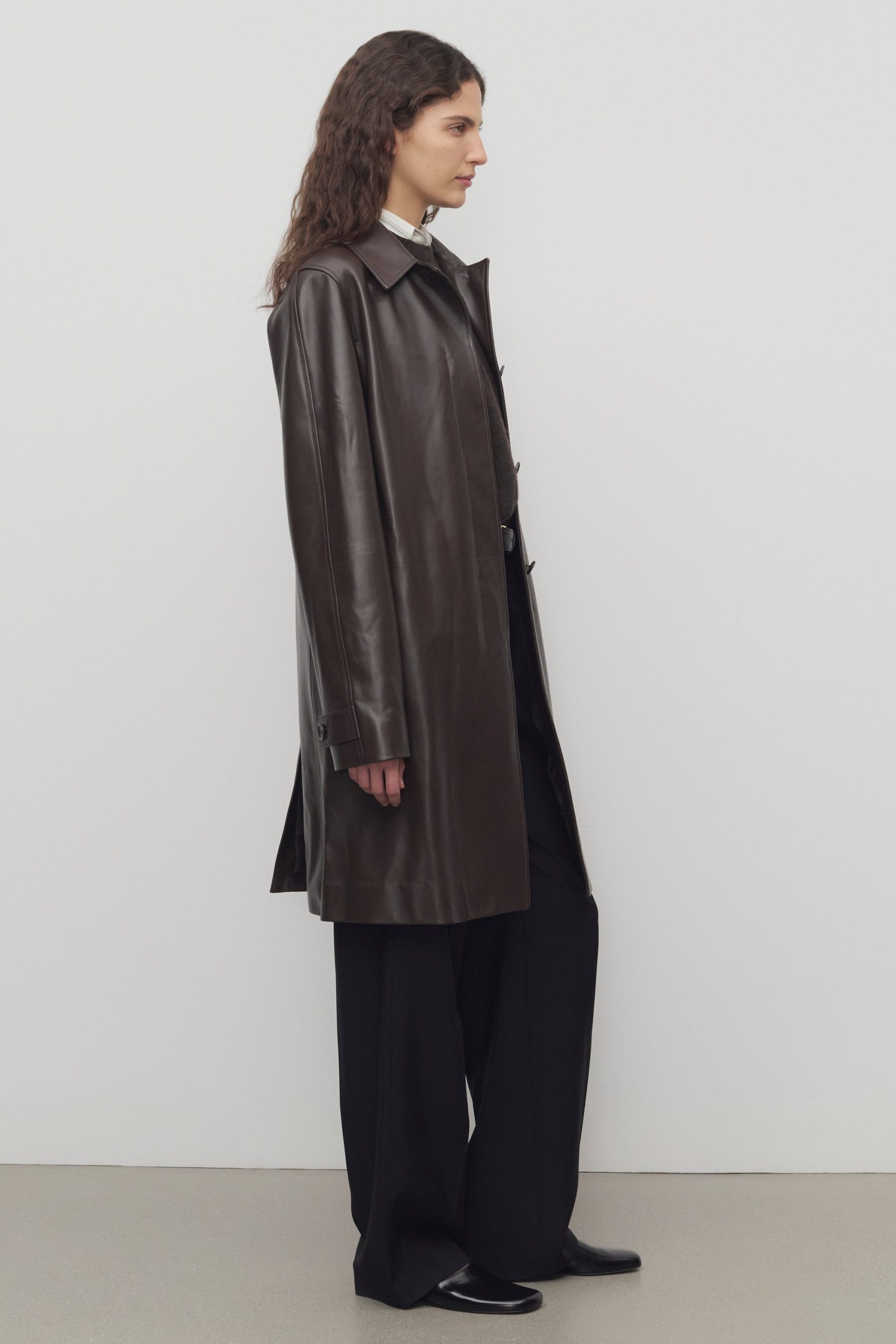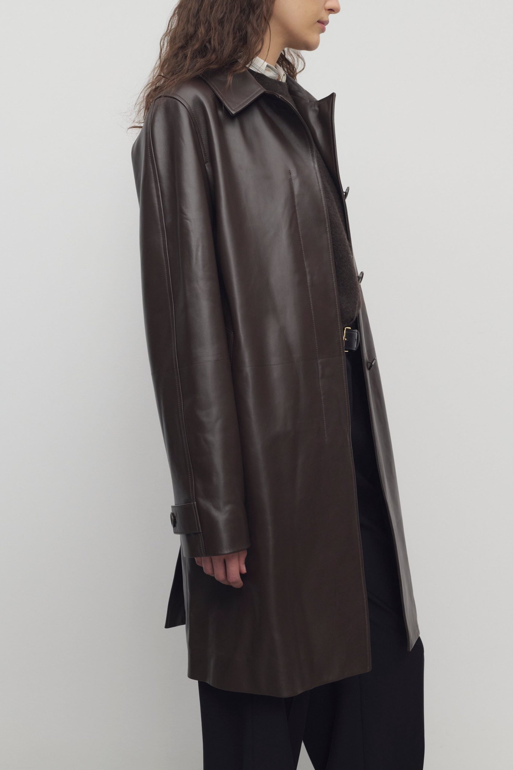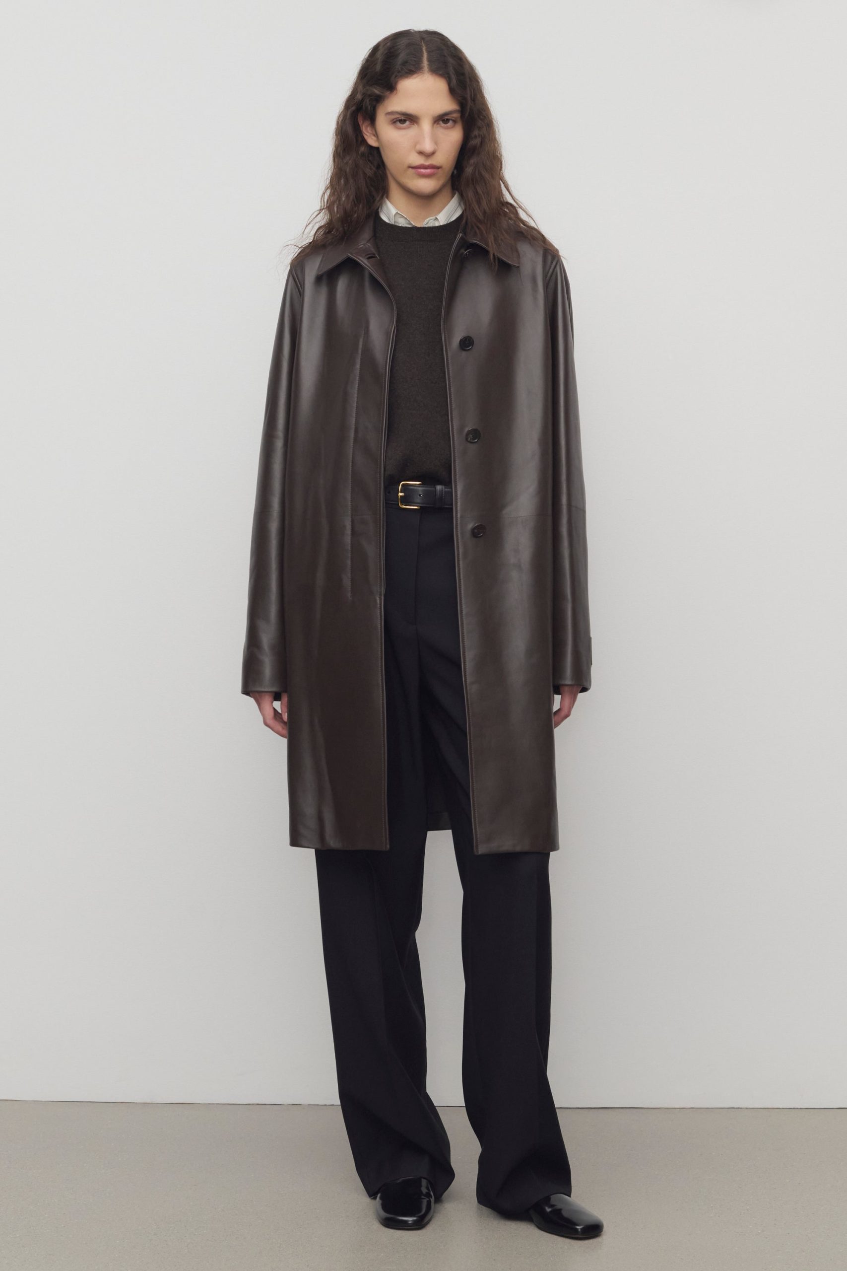 Knee-length car coat in supple nappa leather with wide. notched collar. slant side pockets. and concealed front placket with button closure.