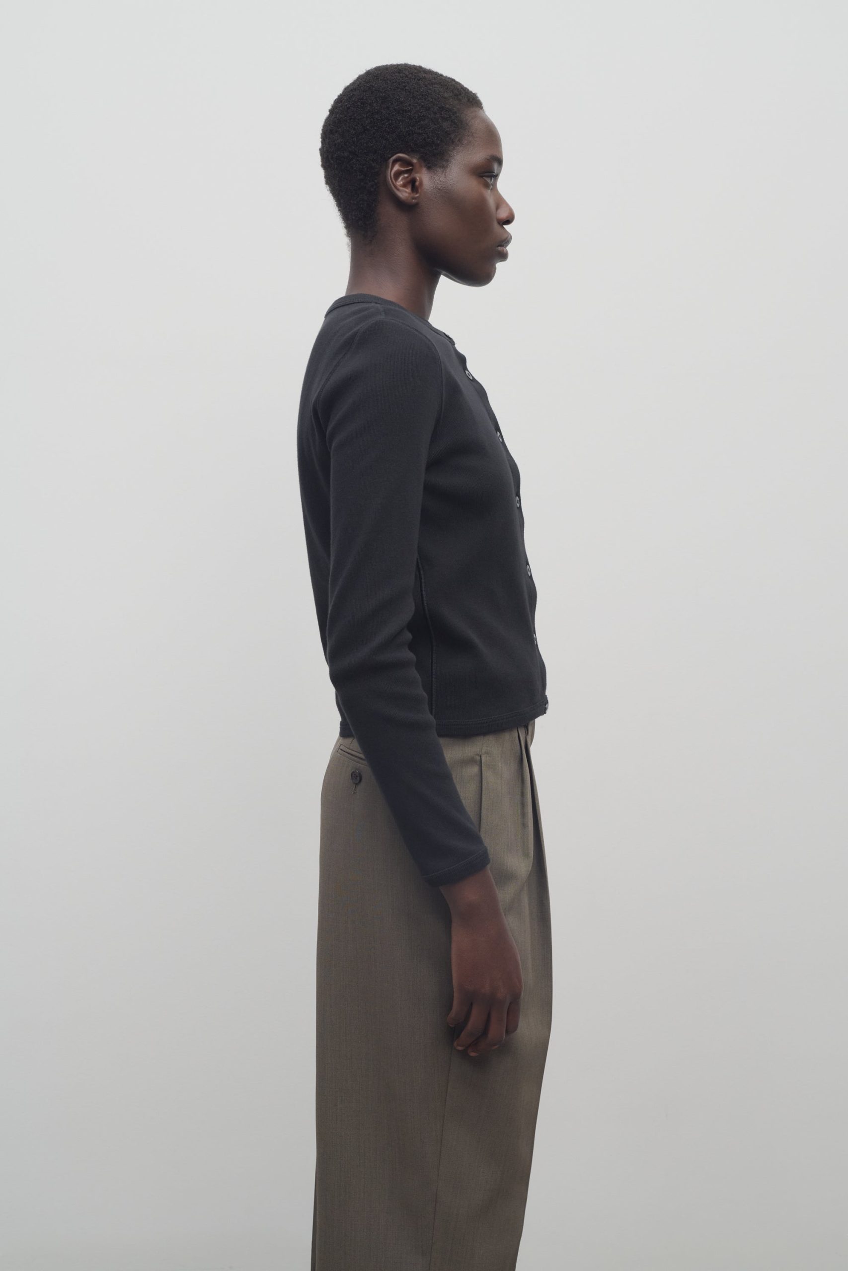 Shrunken long-sleeved cardigan in heavyweight ribbed Japanese cotton with front button closure and fitted silhouette.