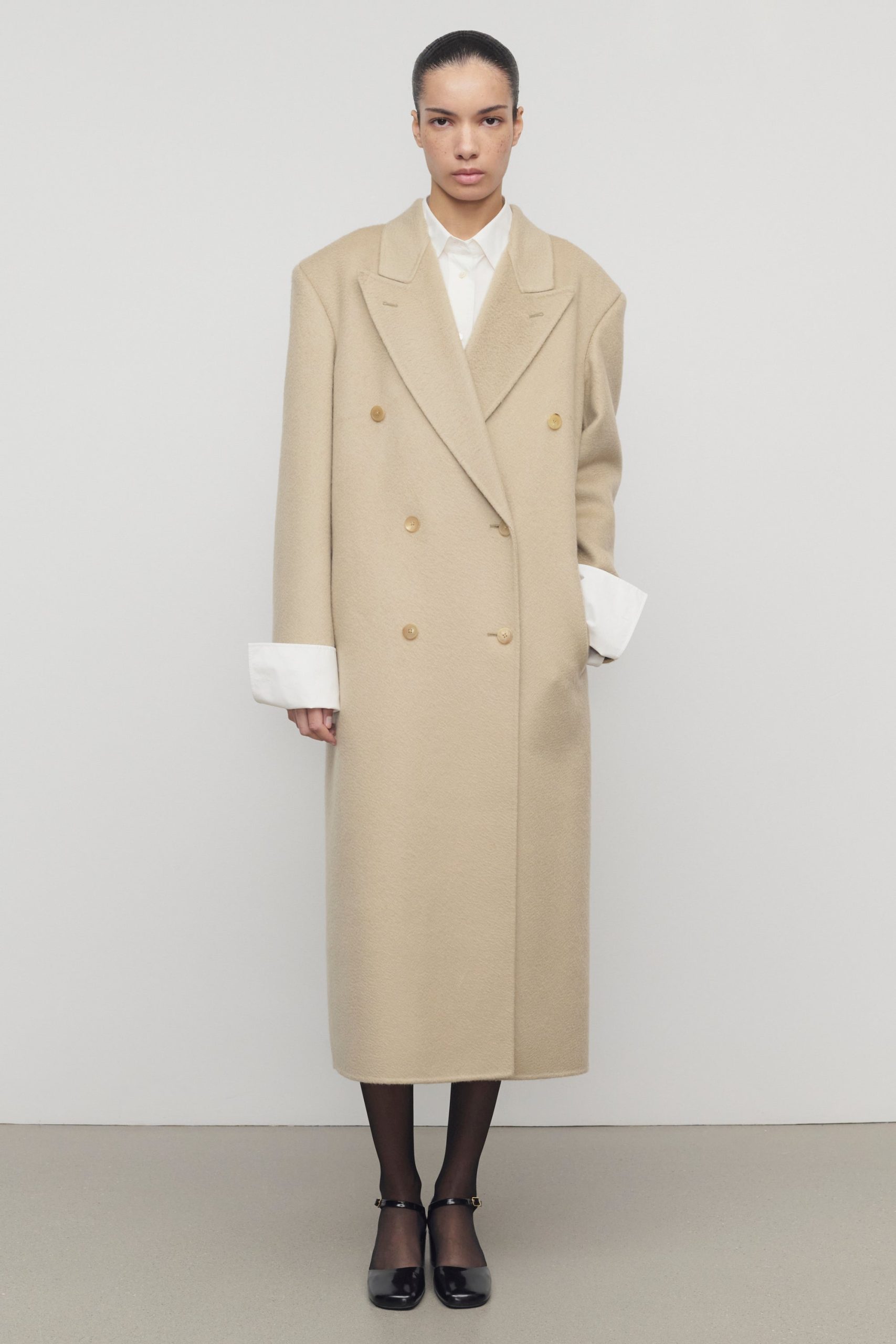 Double-breasted tailored coat in washed double-faced cashmere with peak lapel. slant welt pockets. and horn button closure.