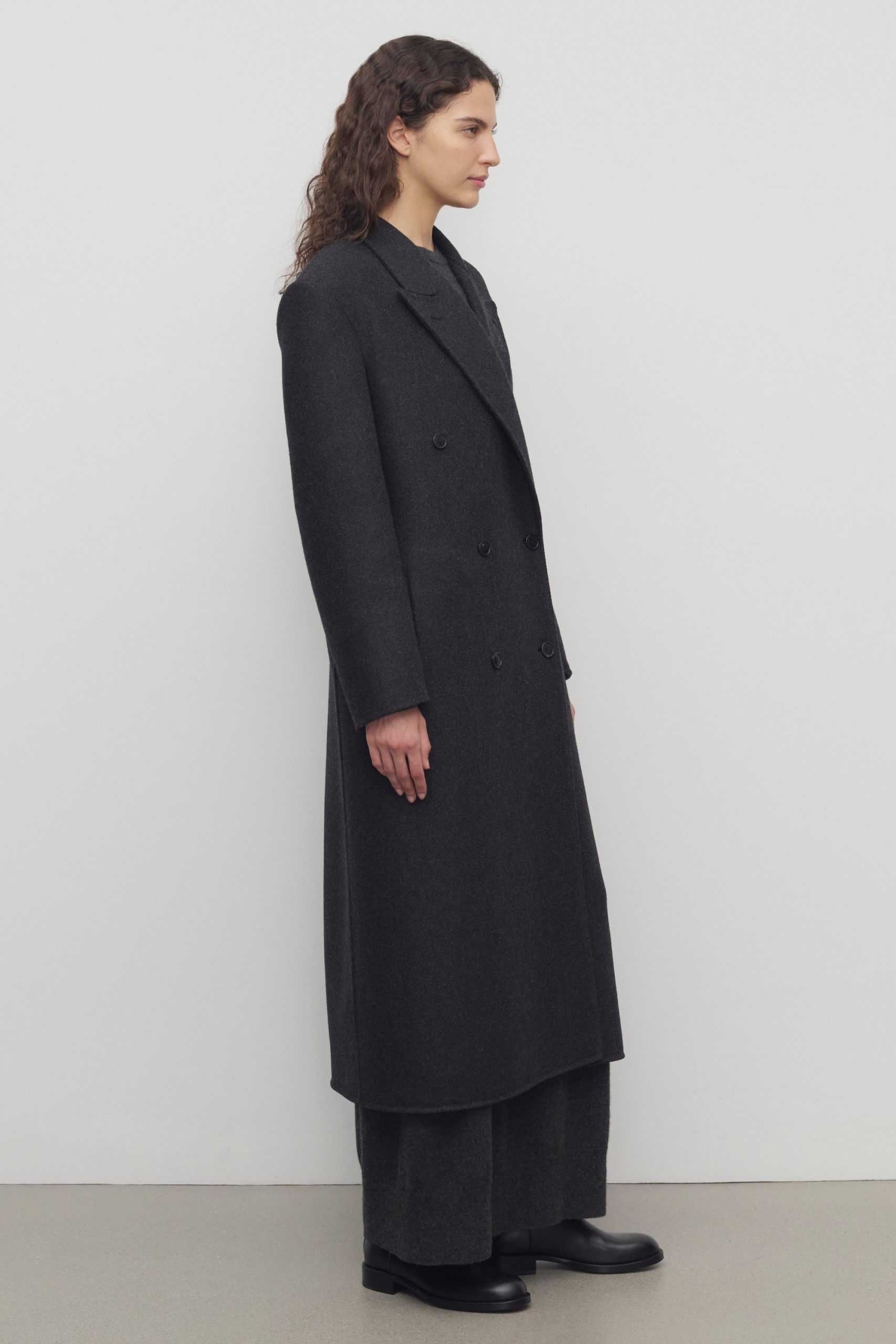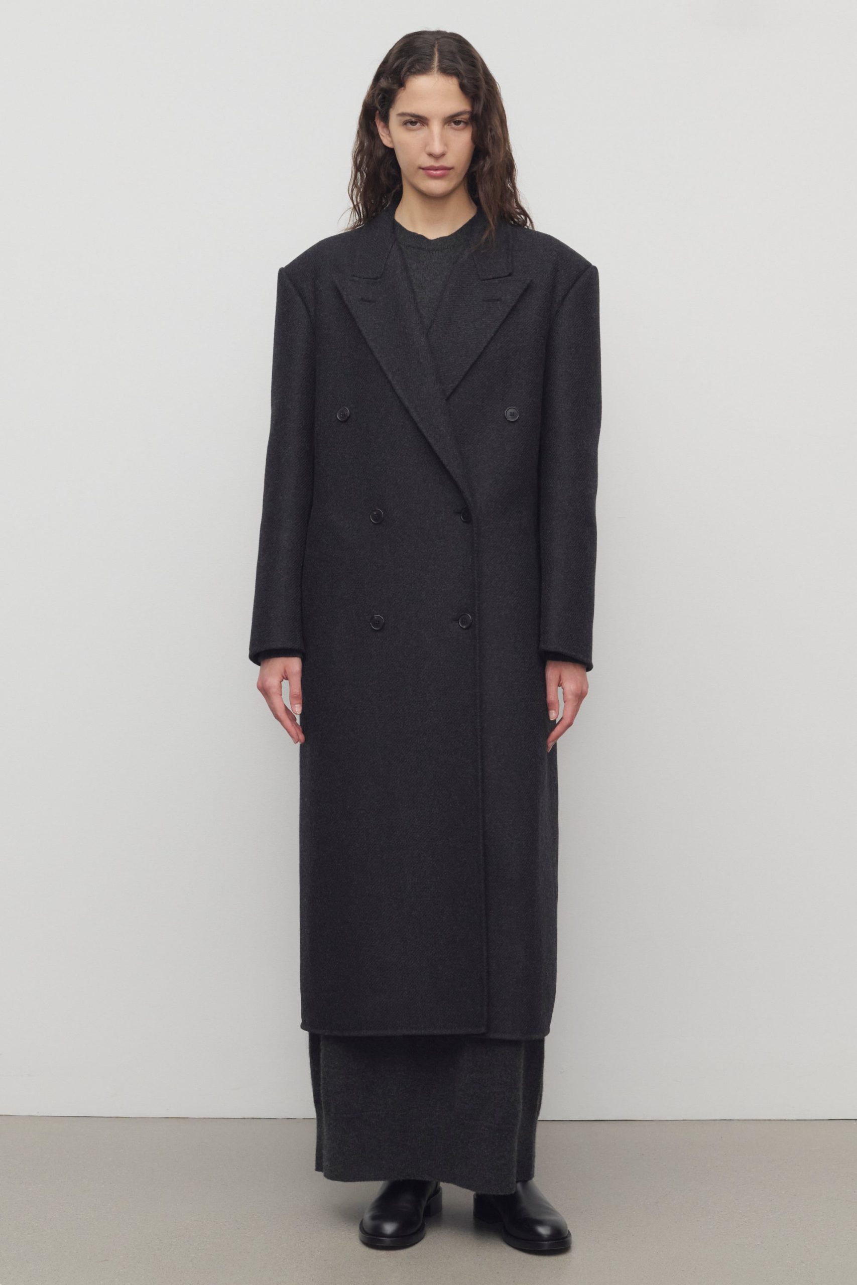 Double-breasted tailored coat in washed double-faced wool and cashmere with peak lapel. slant welt pockets. and horn button closure.