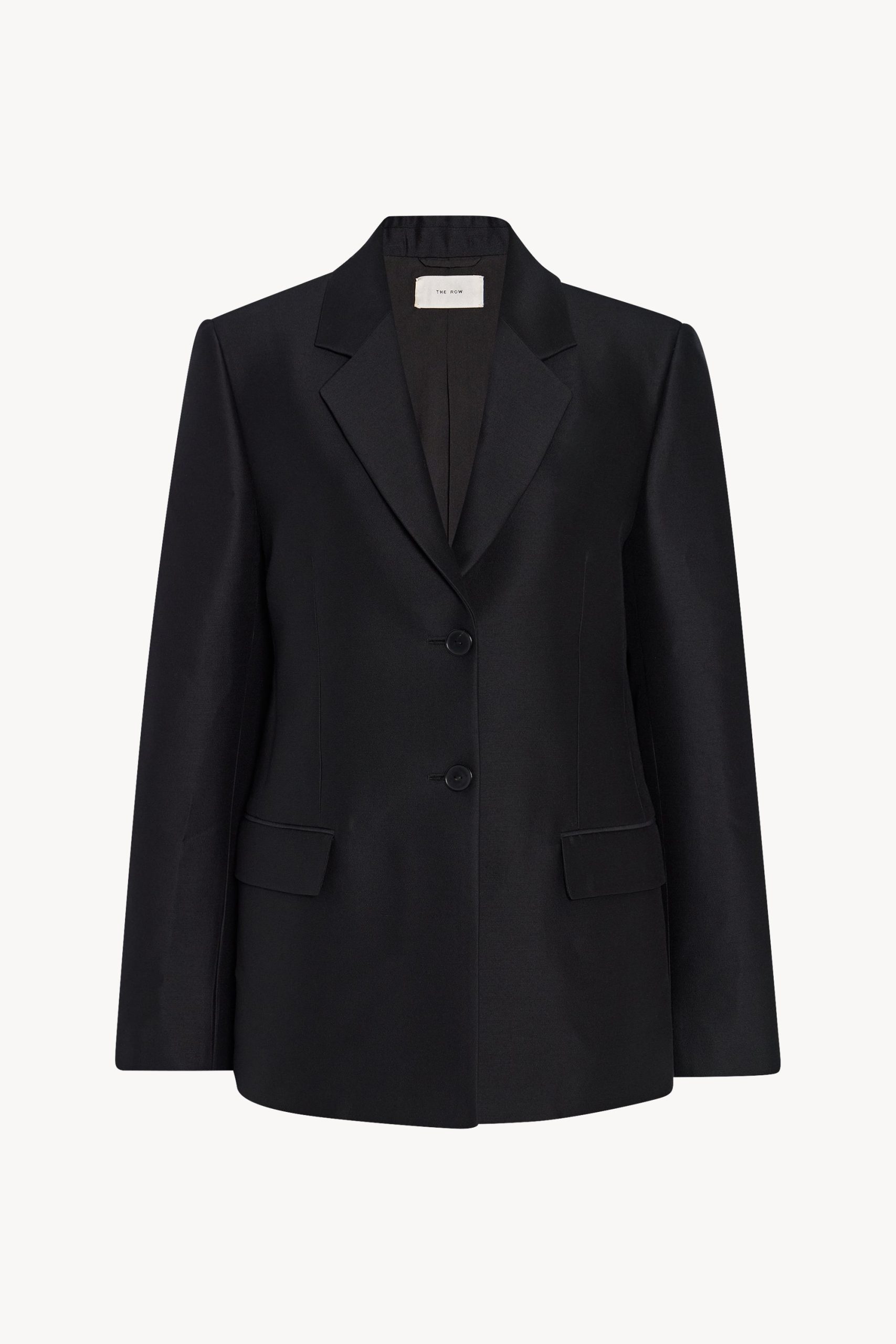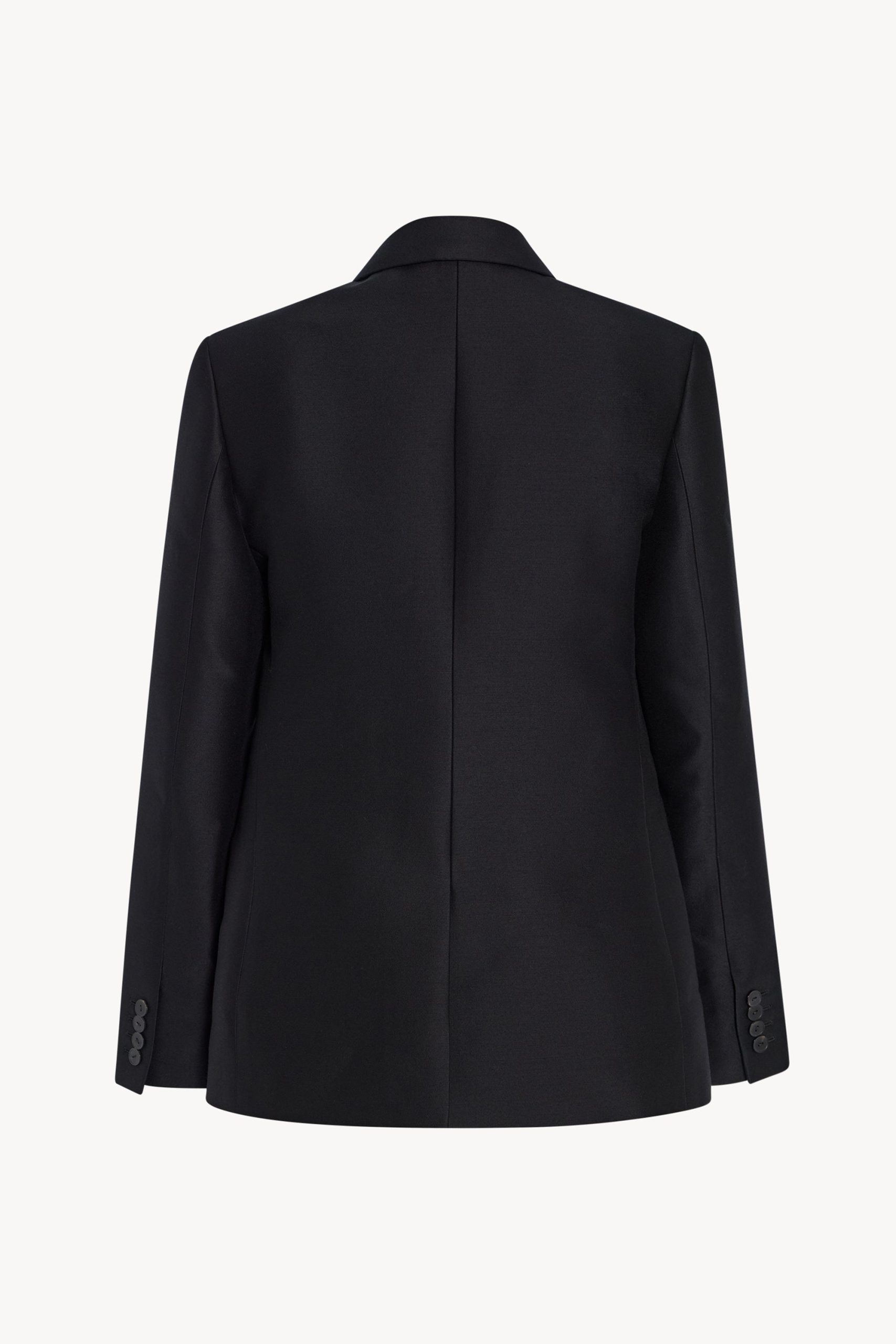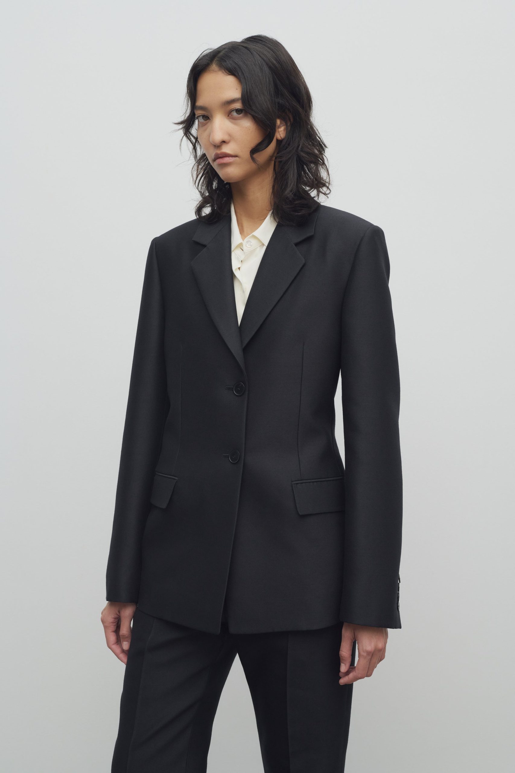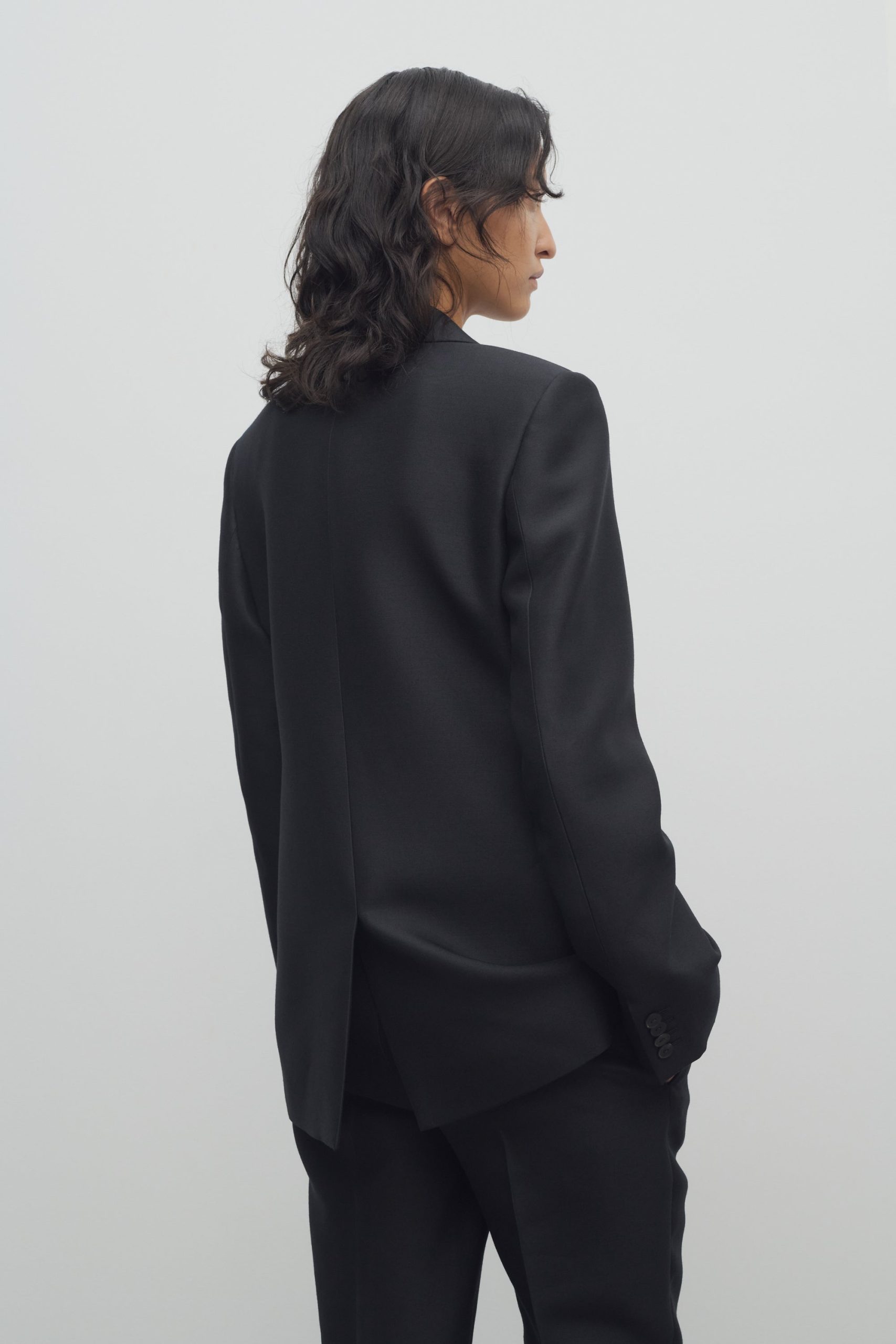 Single-breasted tailored jacket in lightweight wool and silk suiting with peaked lapel. front flap pockets. and double horn button closure.