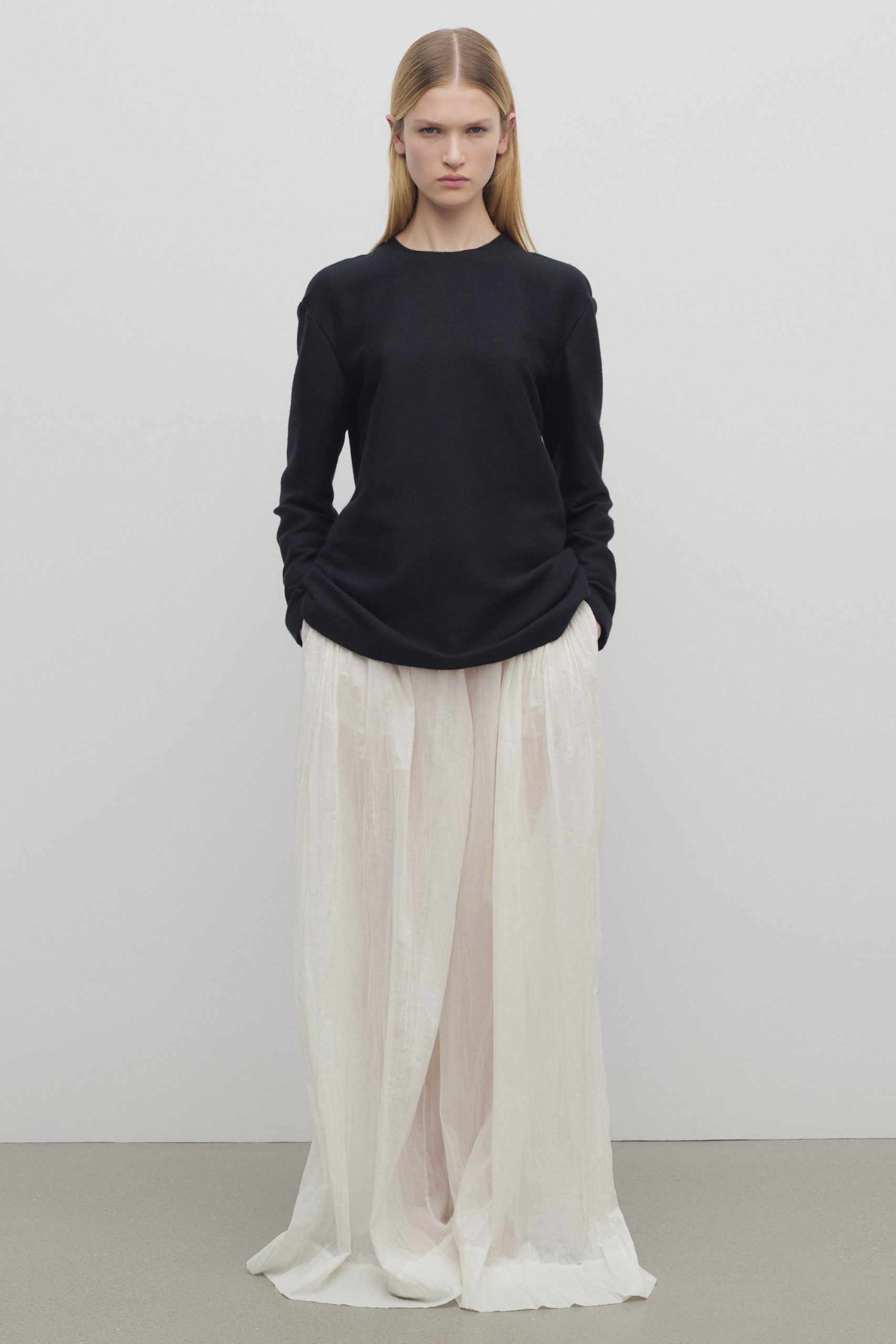 Wide-leg pajama pant in gauzy lightweight cotton with gathered drawstring waistband. side seam pockets. and French seam finish.
