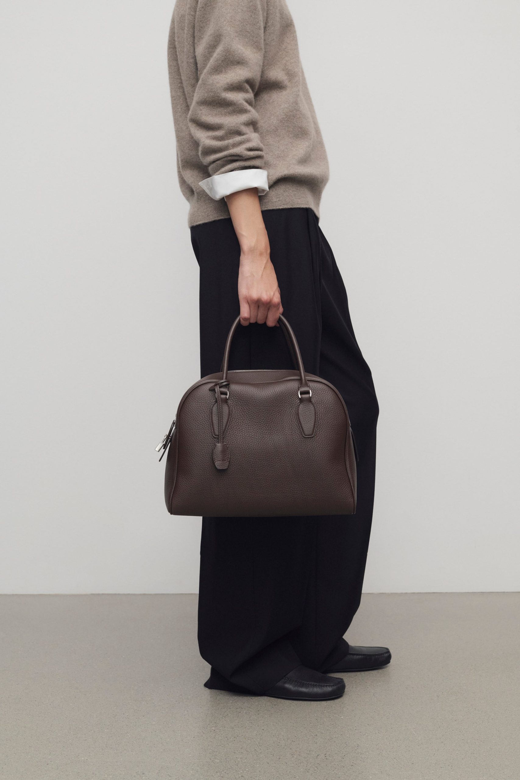 Updated bowling bag in textured calfskin leather with tubular handles. branded metal padlock and key. and zipper closure. Minimally finished. the natural grain surface is left intact. giving the leather a supple hand and refined texture that develops character over time.
