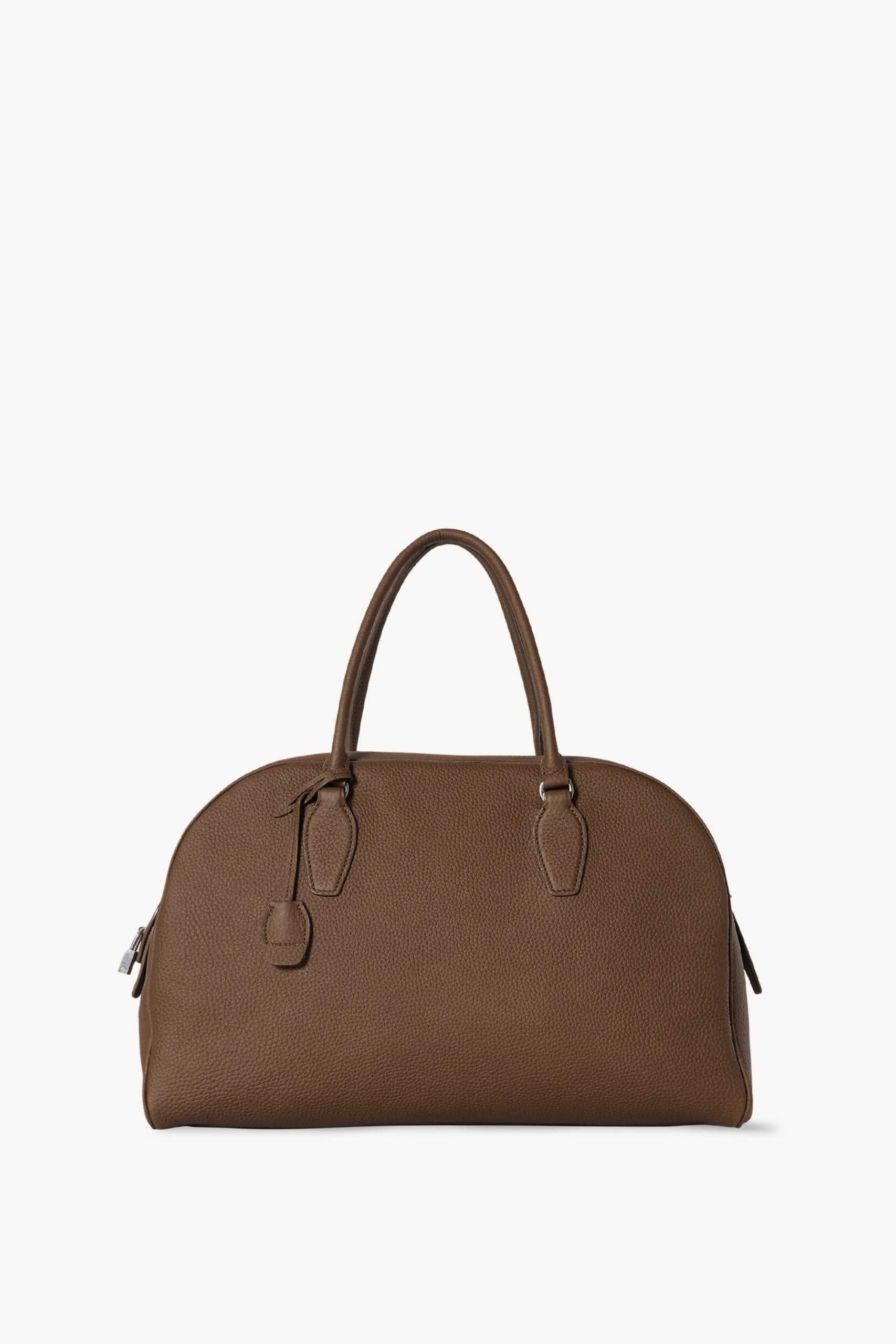 Updated bowling bag in textured calfskin leather with tubular handles. branded metal padlock and key. and zipper closure.
