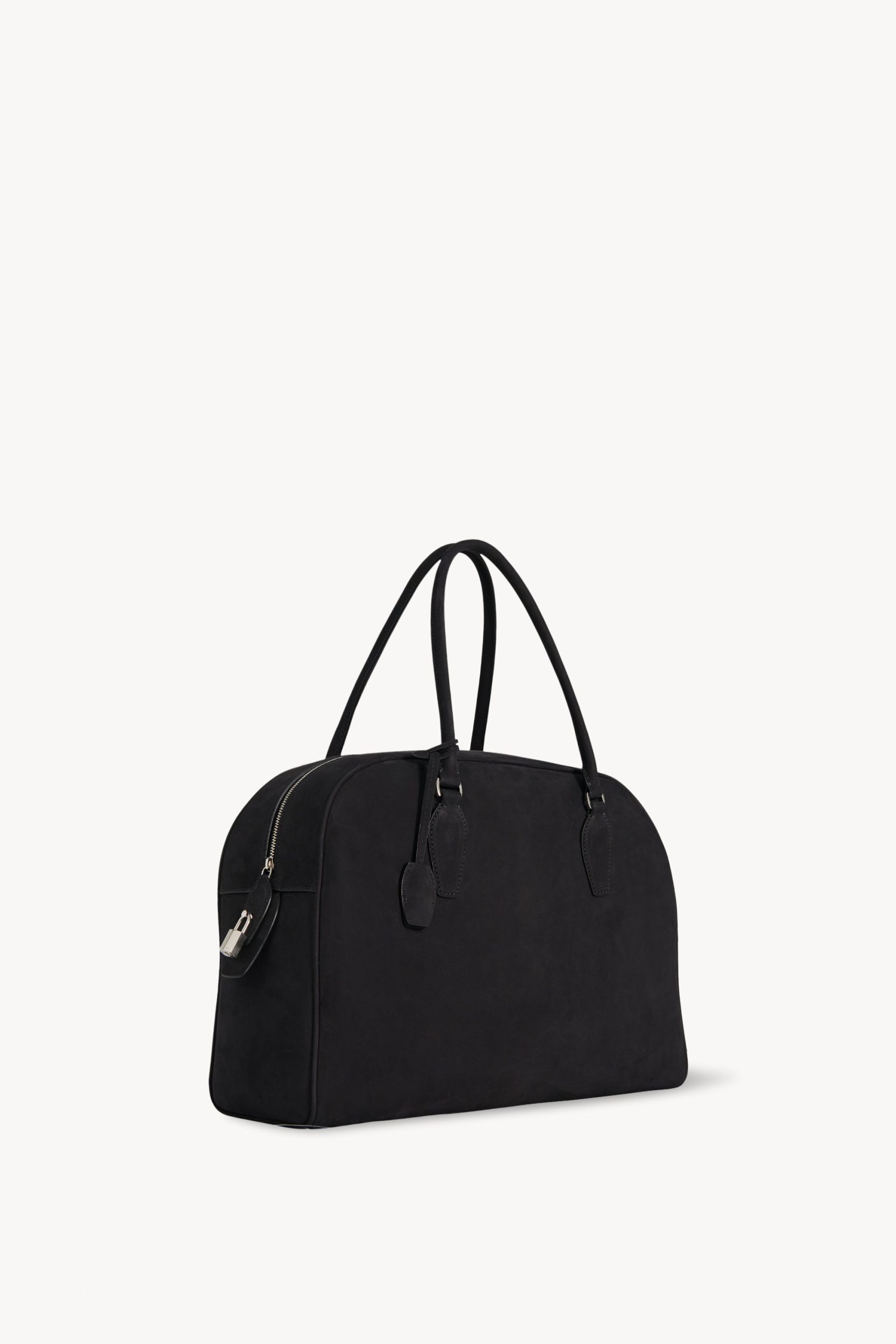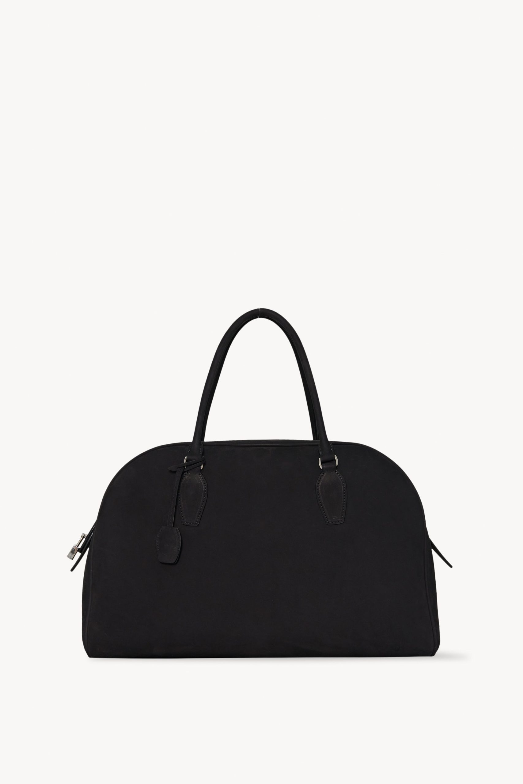 Updated bowling bag in nubuck suede leather with tubular handles. branded metal padlock and key. and zipper closure.