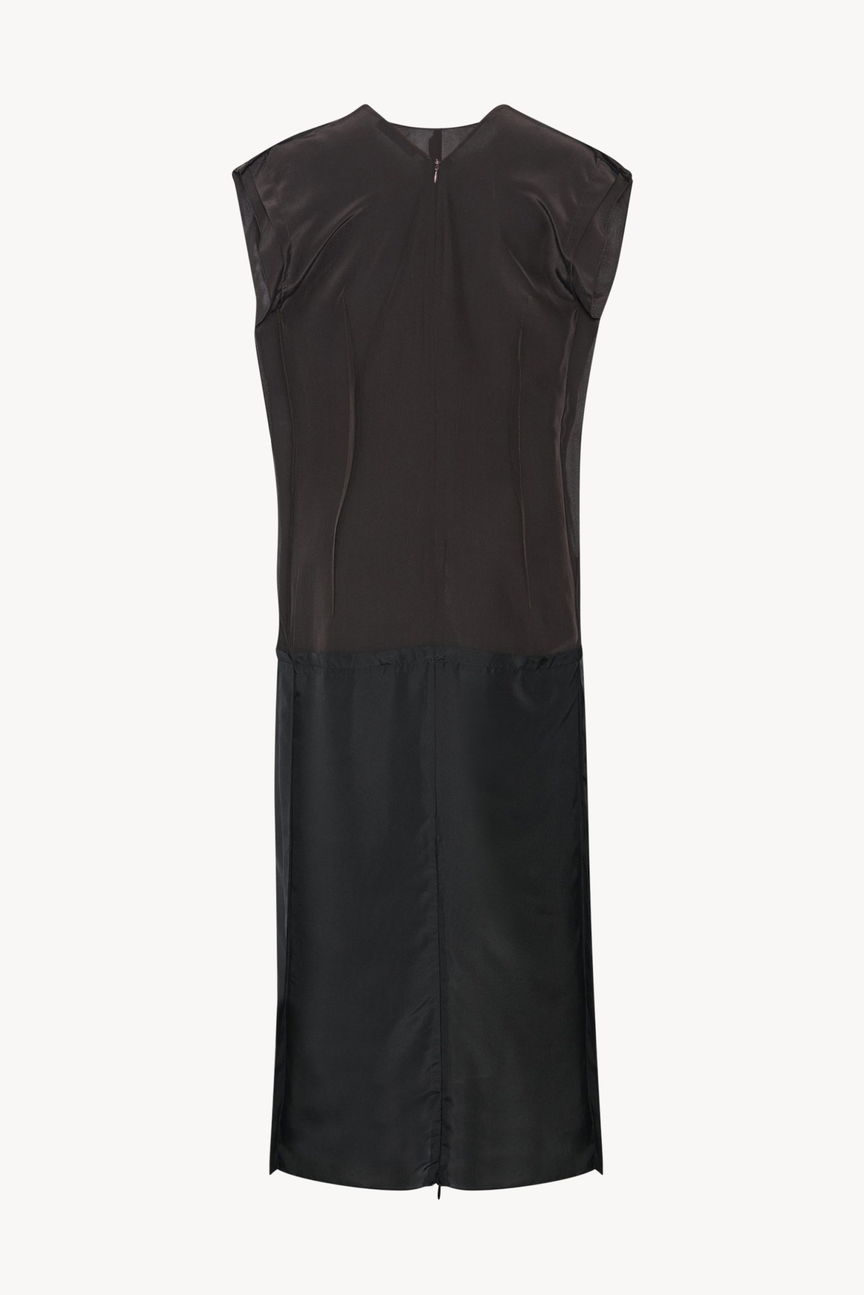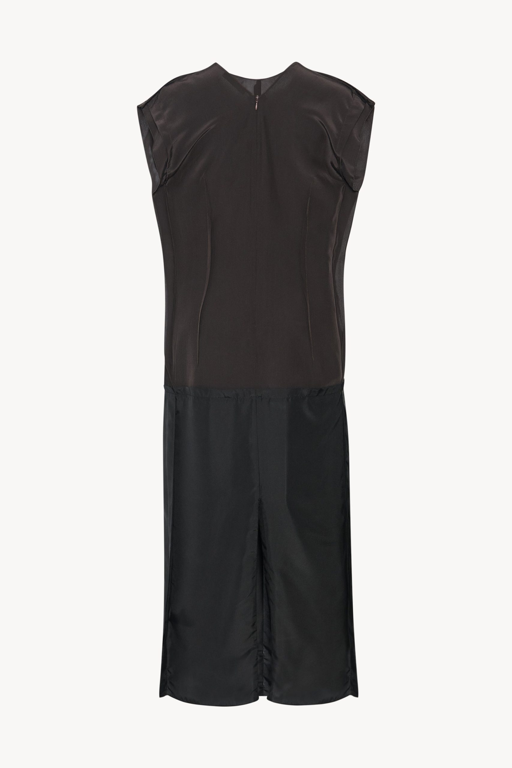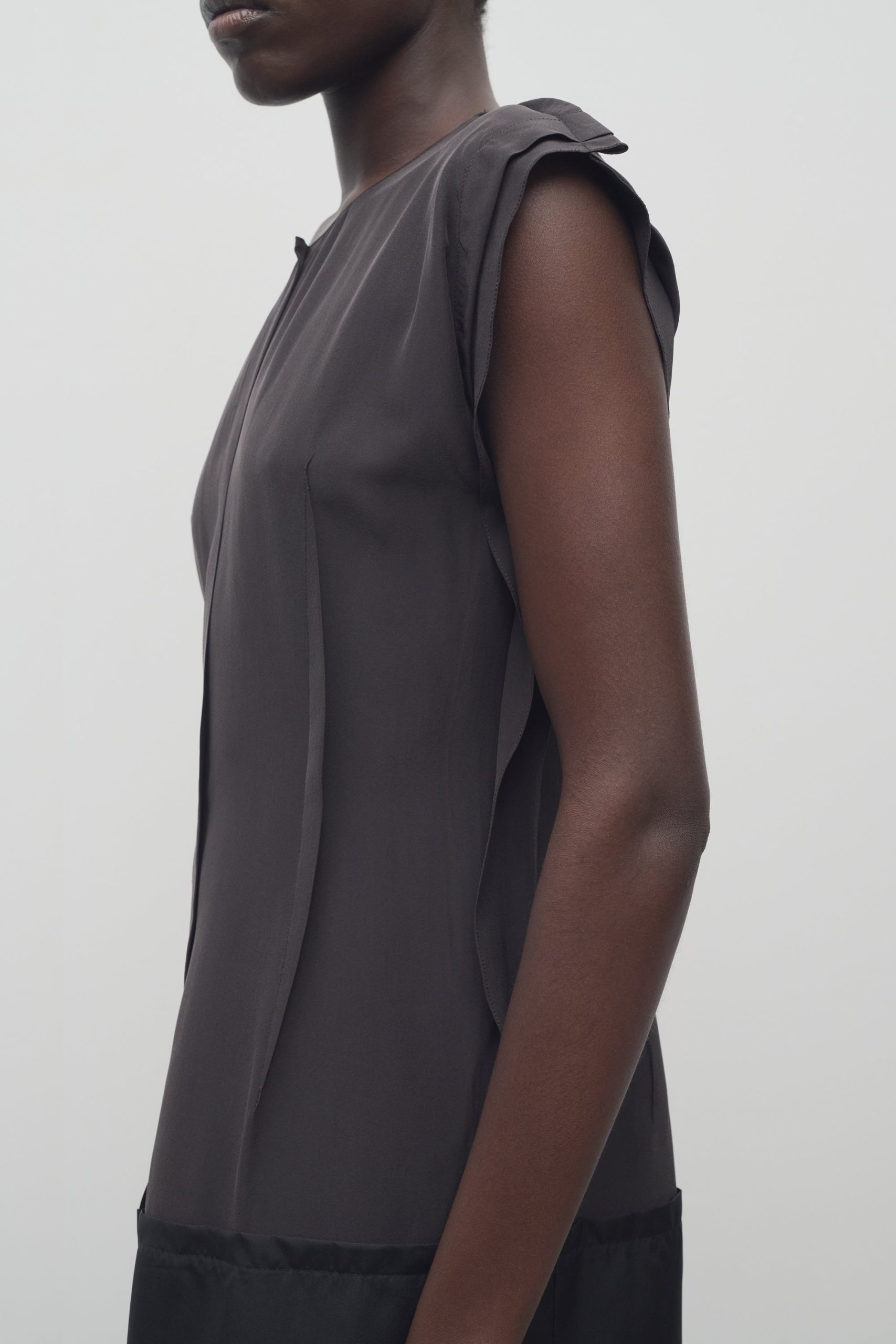 Calf-length shift dress in fluid silk viscose crepe de chine with paneled skirt. stitched front placket. and center back two-way zip closure.