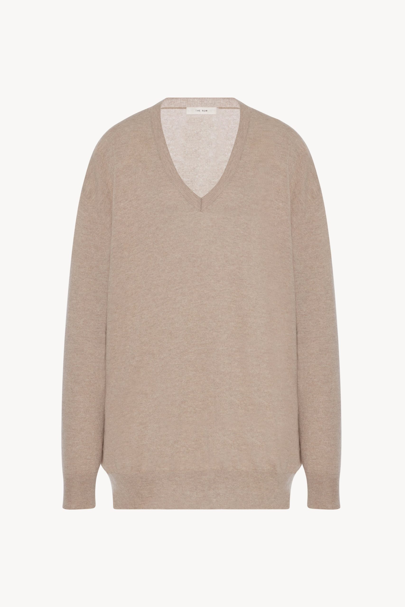 Seamless sweater in ultrafine cashmere knit with classic v-neckline. ribbed neckline. cuffs. and hem. and slightly oversized fit.