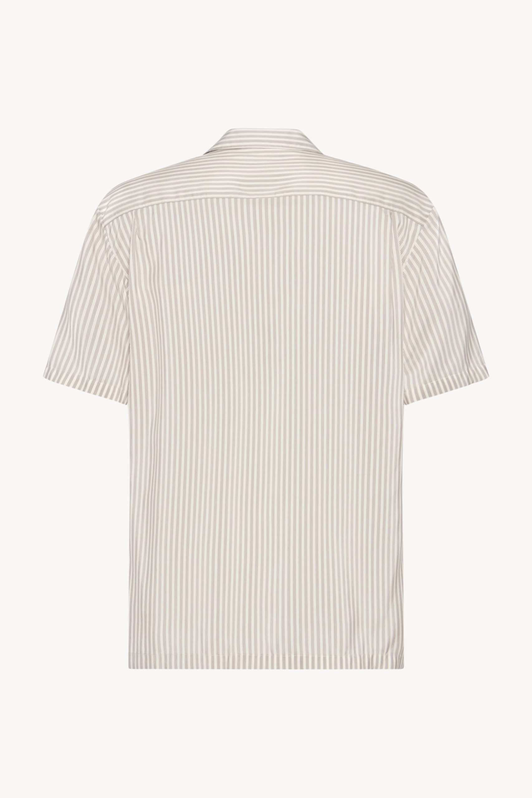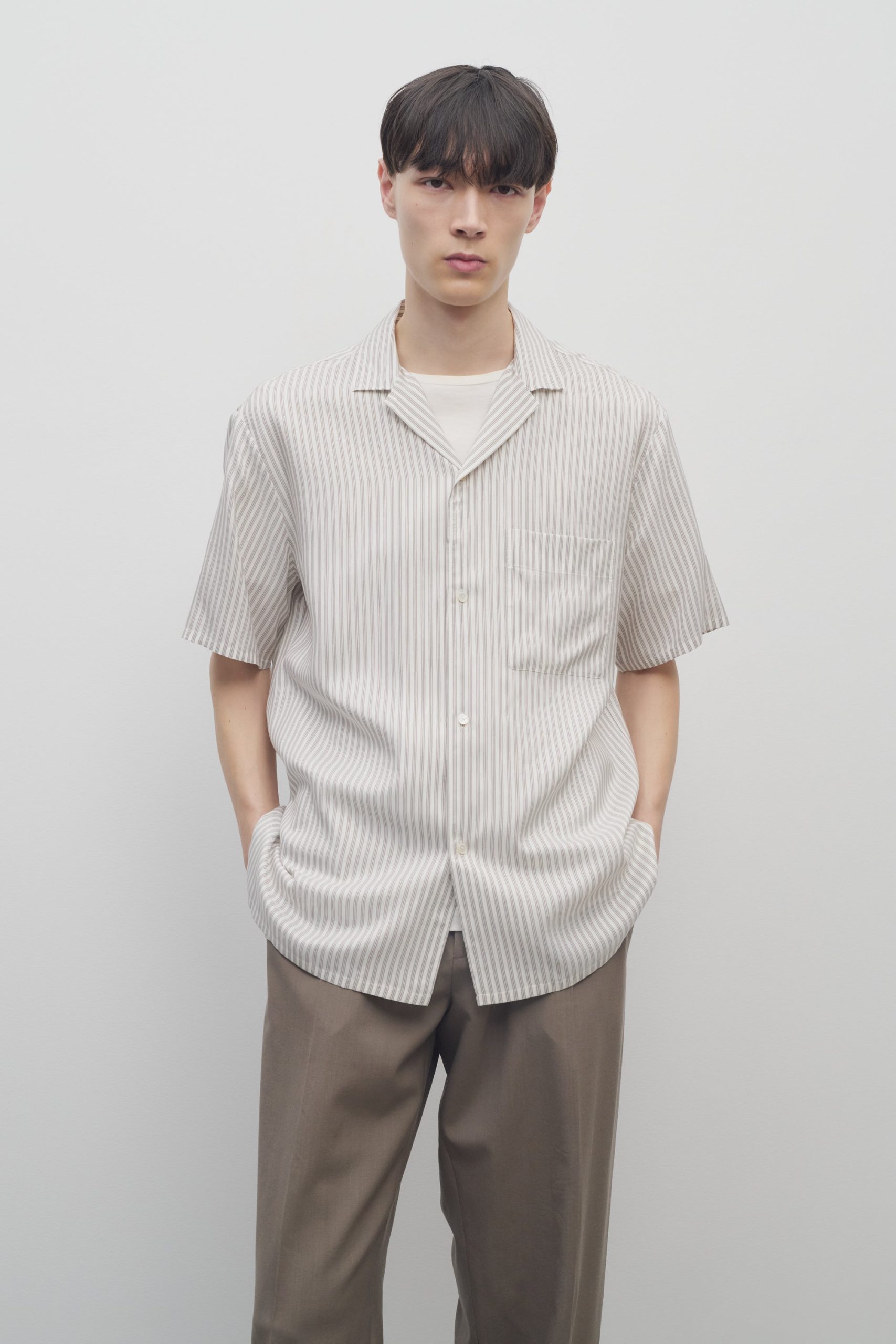 Short-sleeved button-up shirt in fluid striped silk with boxy fit. front patch pocket. and exposed horn button closure.