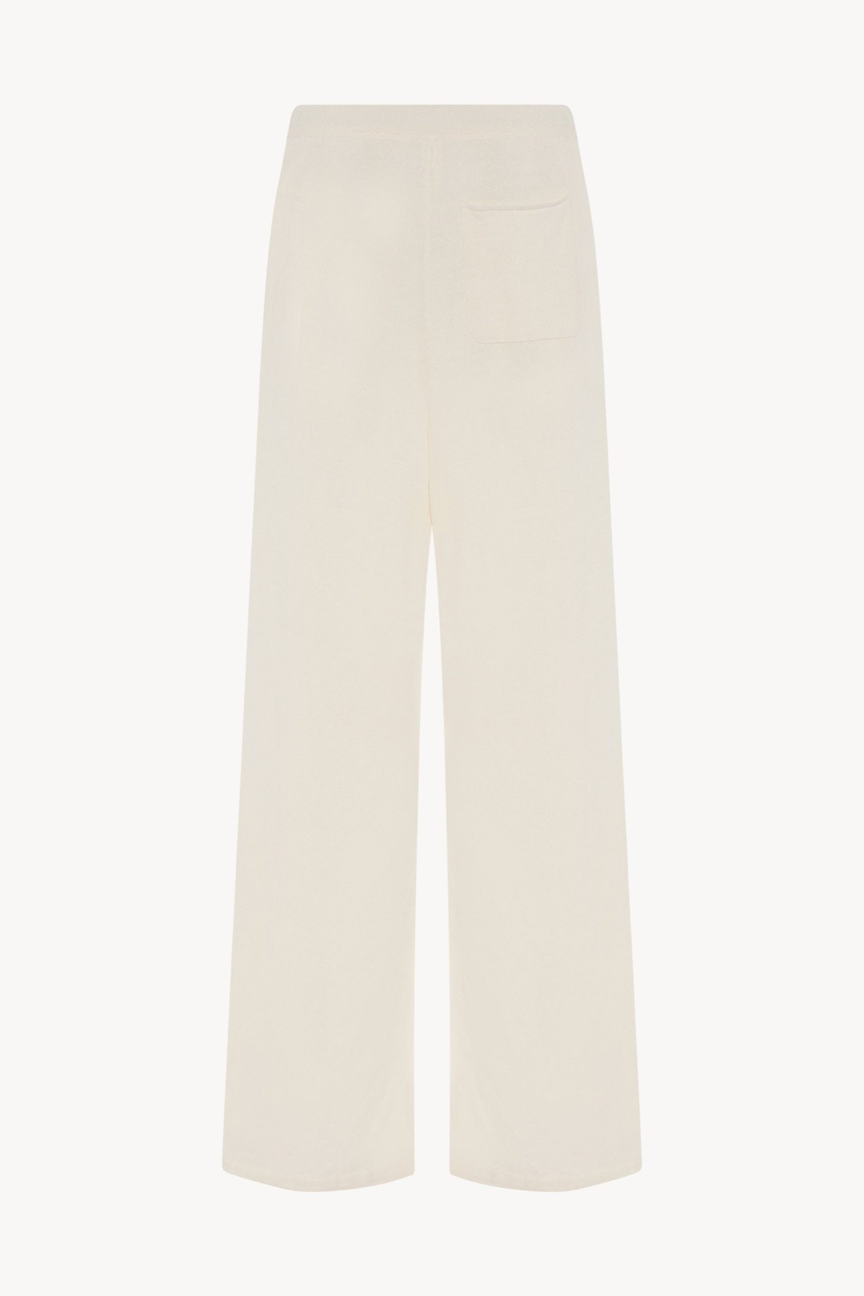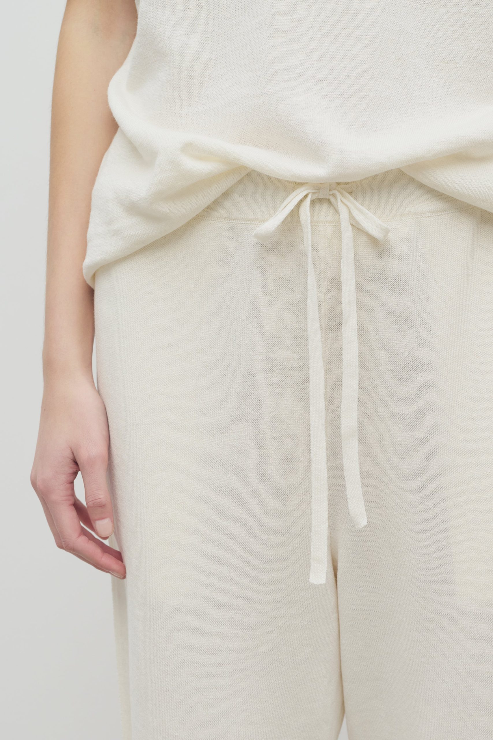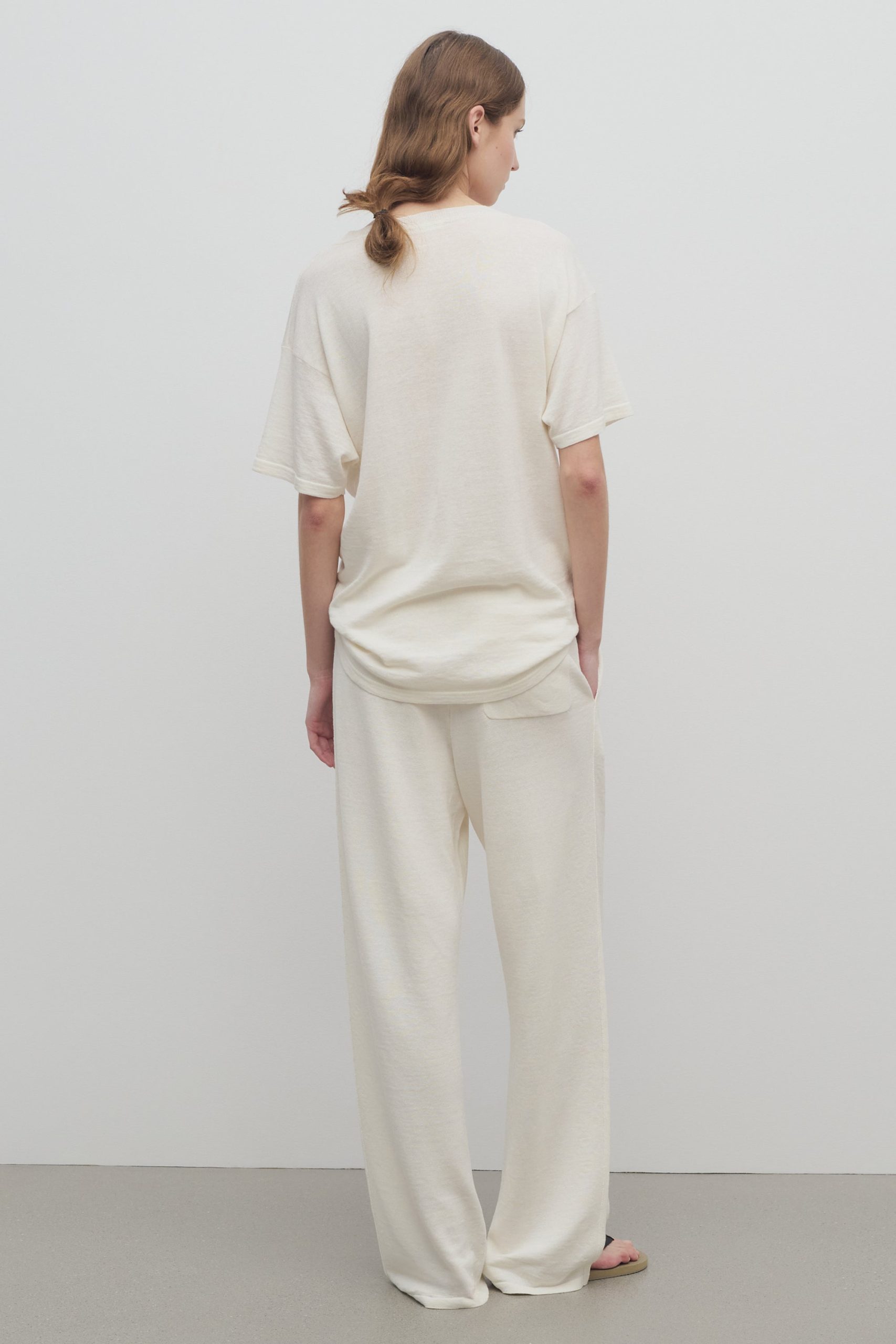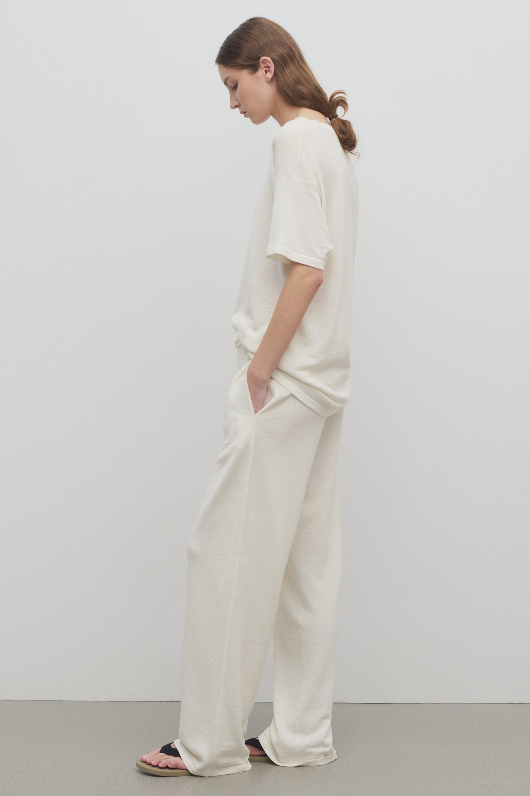 Relaxed pant in textured linen knit with wide leg. back patch pocket. and drawstring waistband.