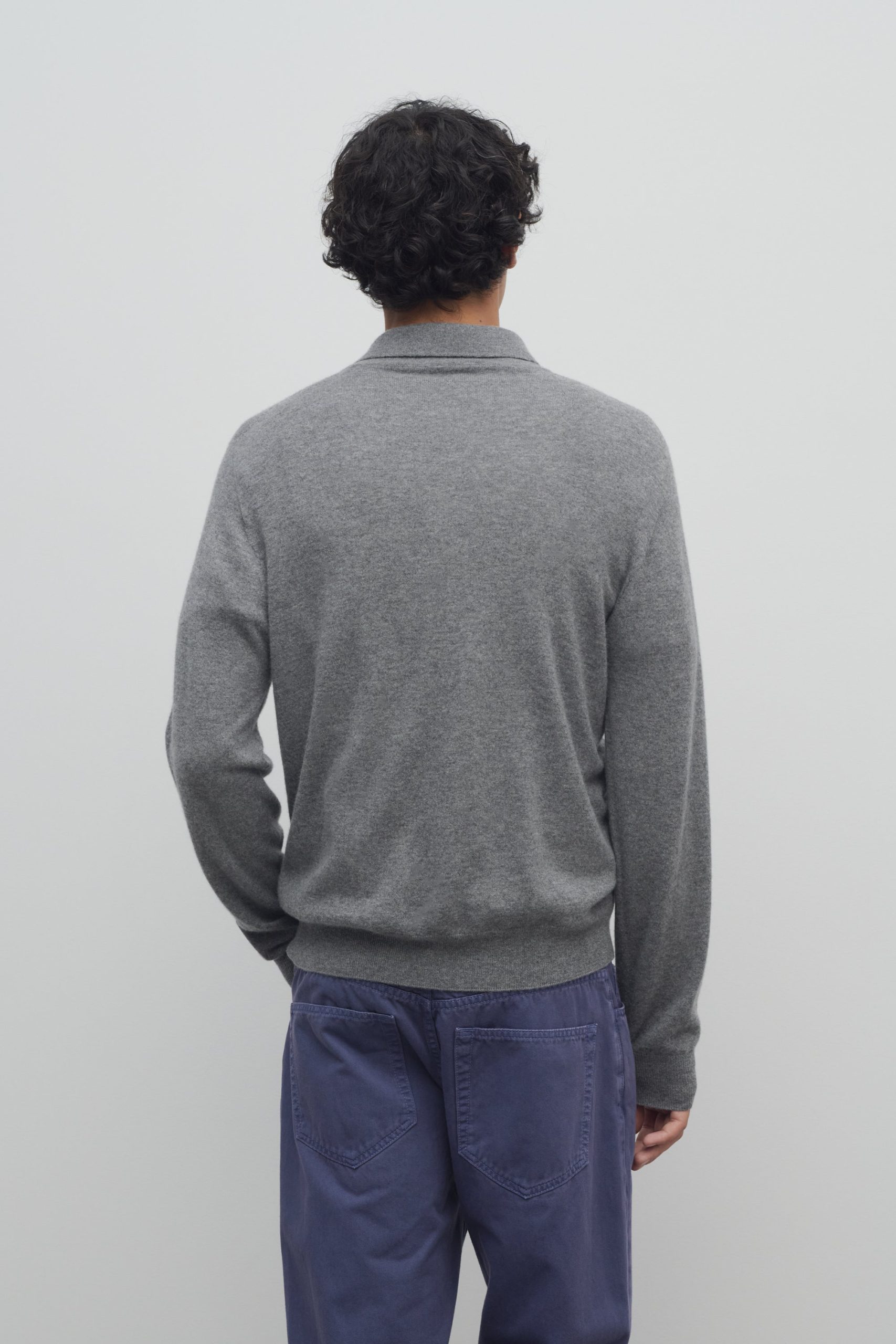 Long-sleeved polo sweater in ultrafine cashmere knit with ribbed cuffs and hem. horn button closure. and signature center back detail.