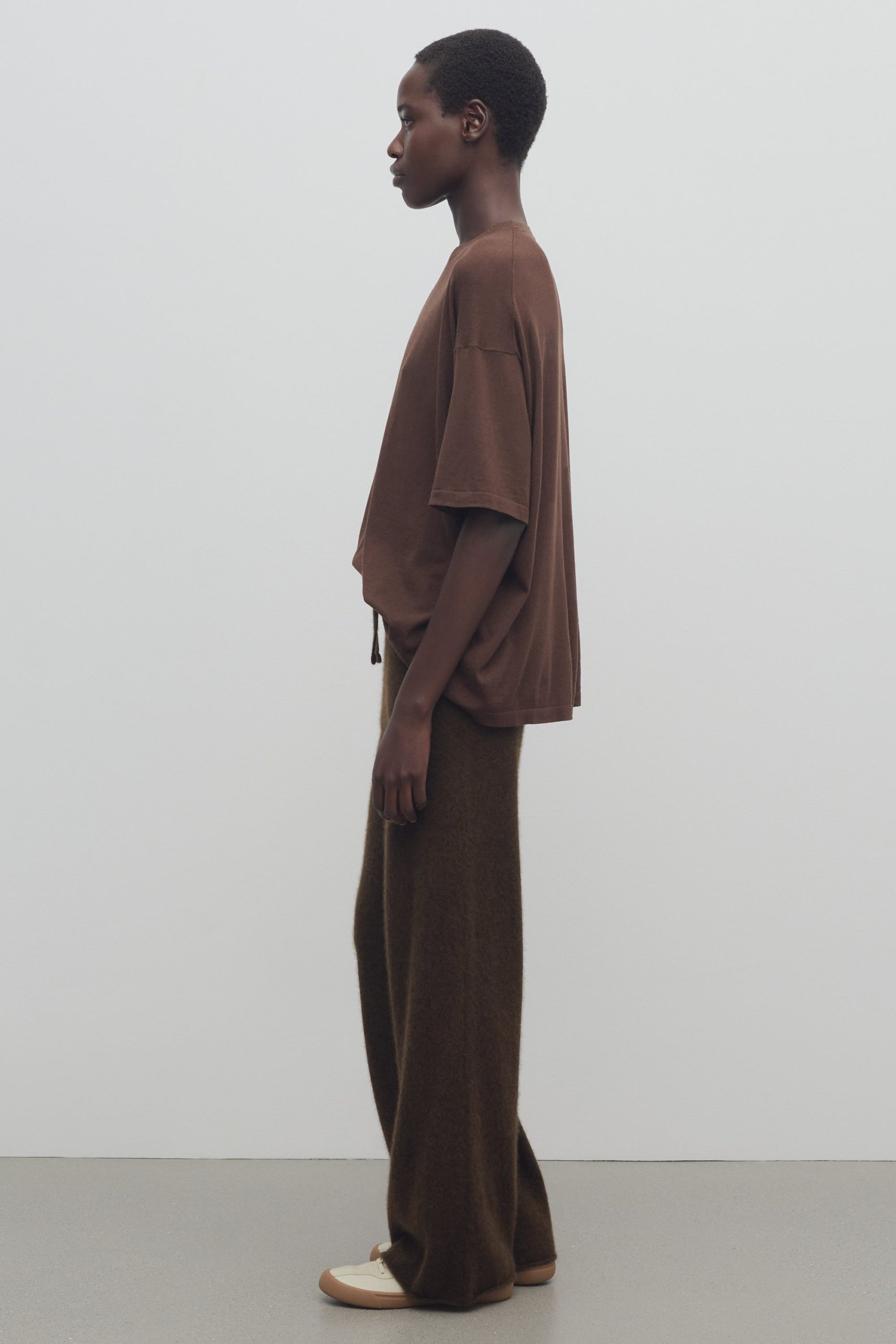 Relaxed pant in superfine cashmere and silk knit with wide leg and funnel waistband with drawstring.