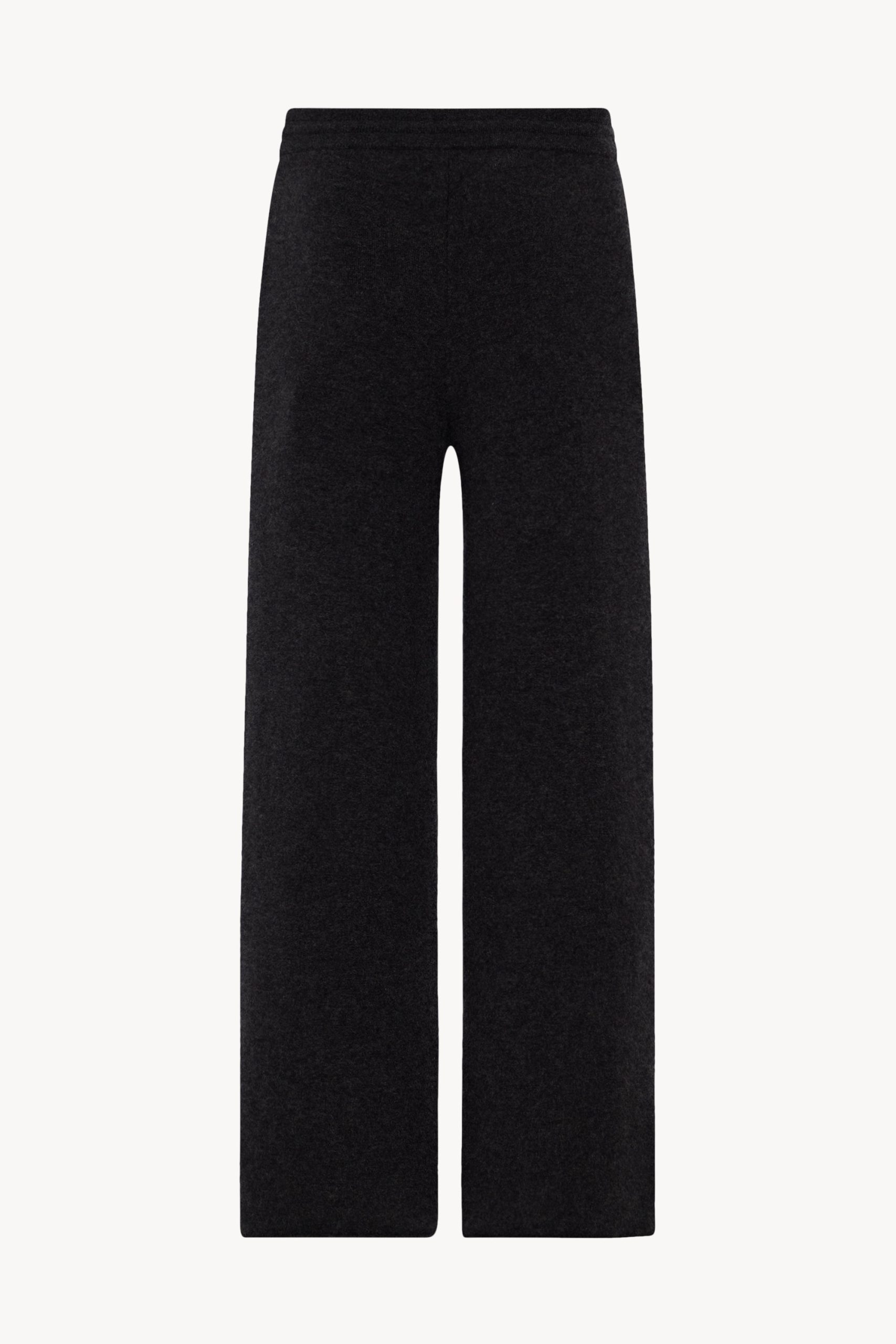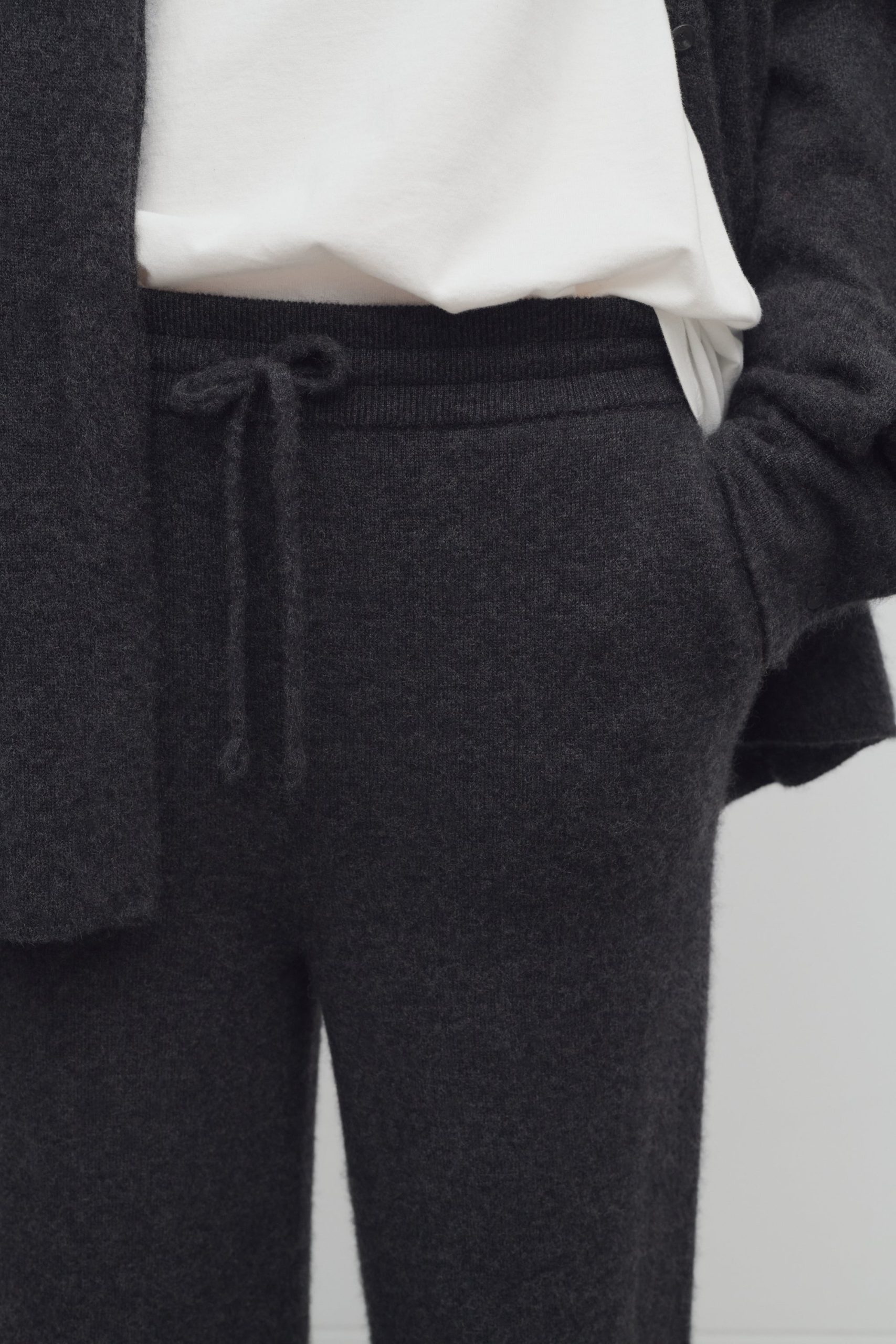 Relaxed pant in superfine cashmere and silk knit with wide leg and funnel waistband with drawstring.